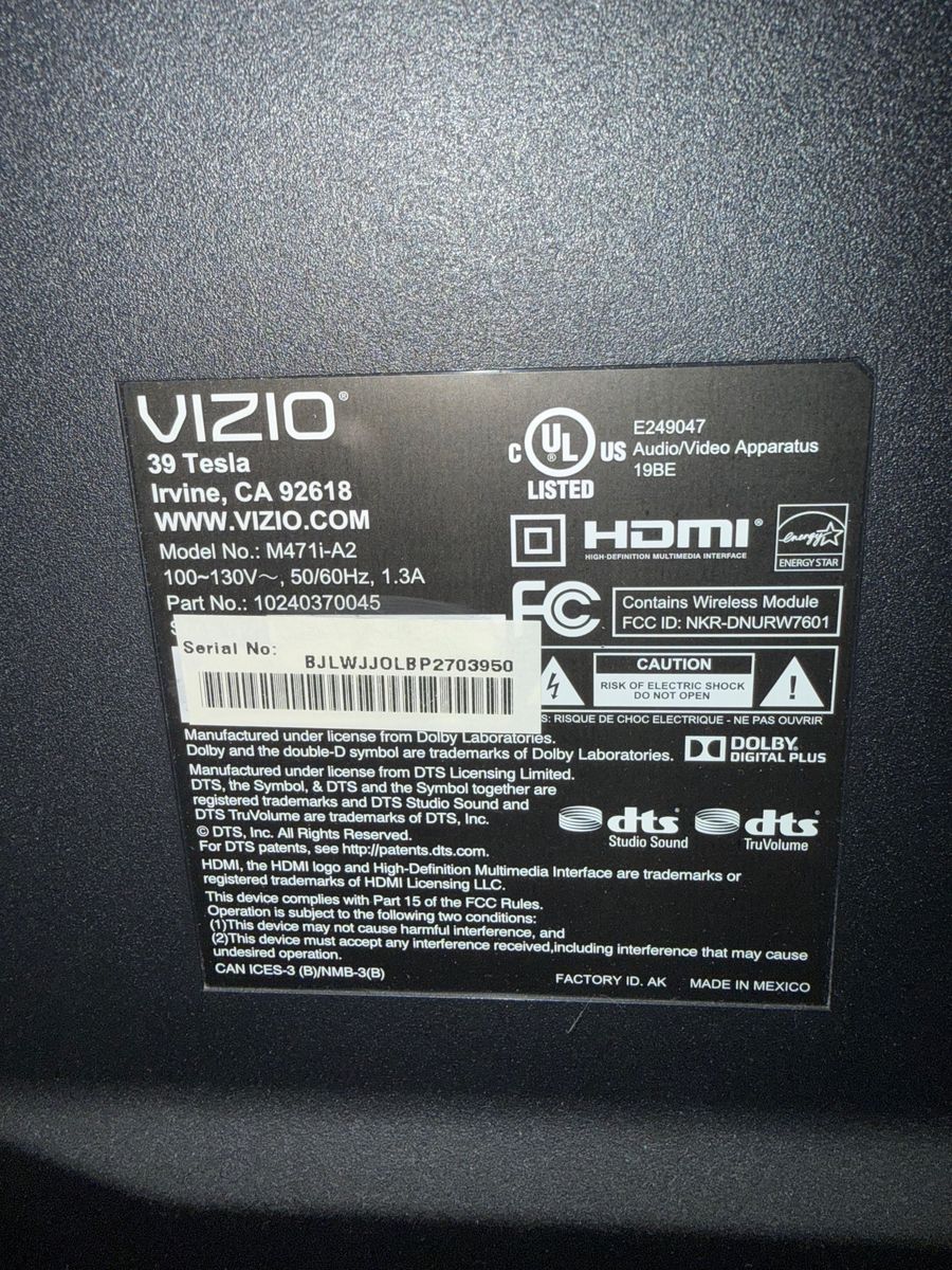 The Vizio M471i-A2 is a 47-inch 1080p Smart LED TV released around 2013-2014, featuring a 120Hz refresh rate (effective), Razor LED backlighting with smart dimming, and built-in Wi-Fi. It offers 3 HDMI ports, Vizio Internet Apps Plus, and a 178° viewing angle, targeting a balance of performance and efficiency.