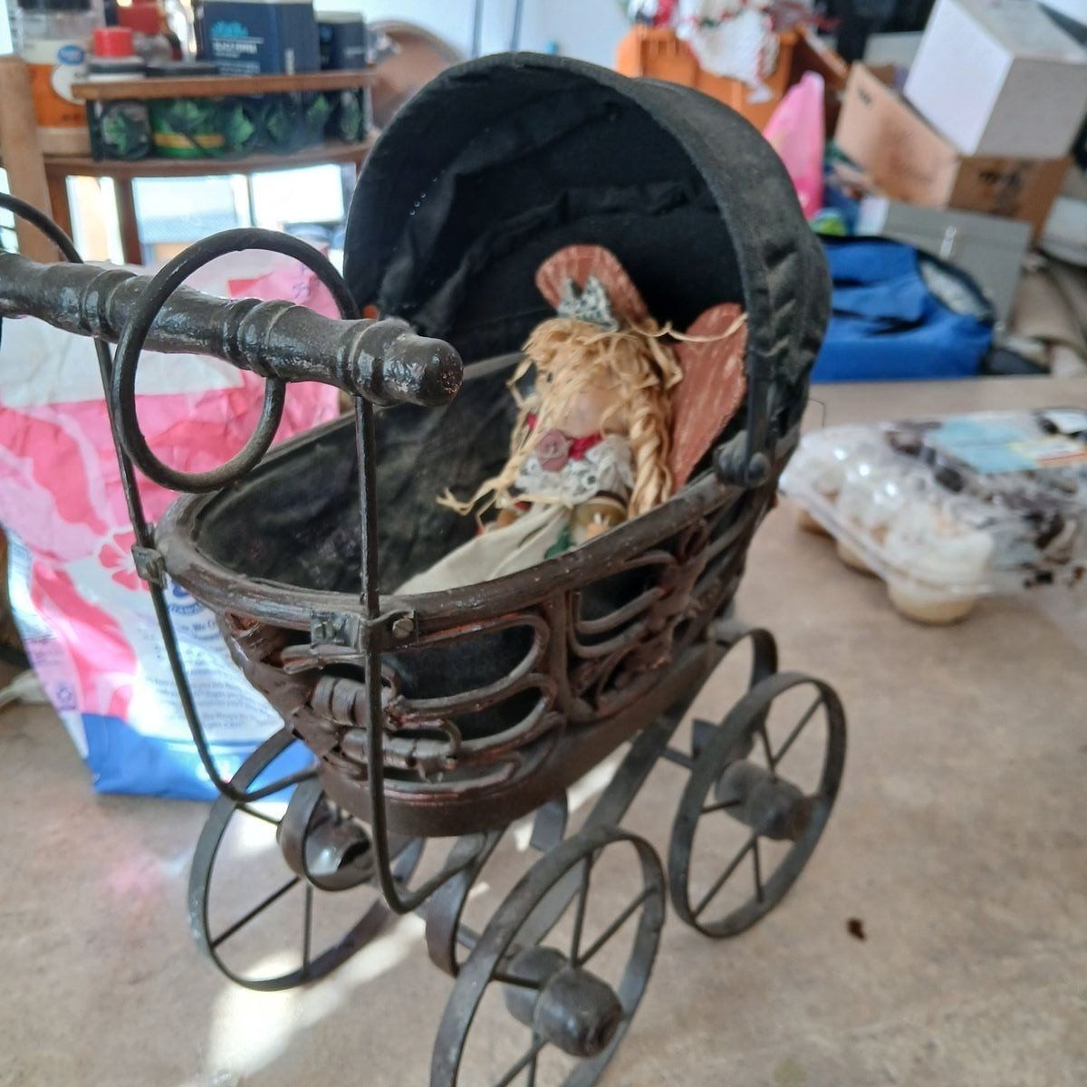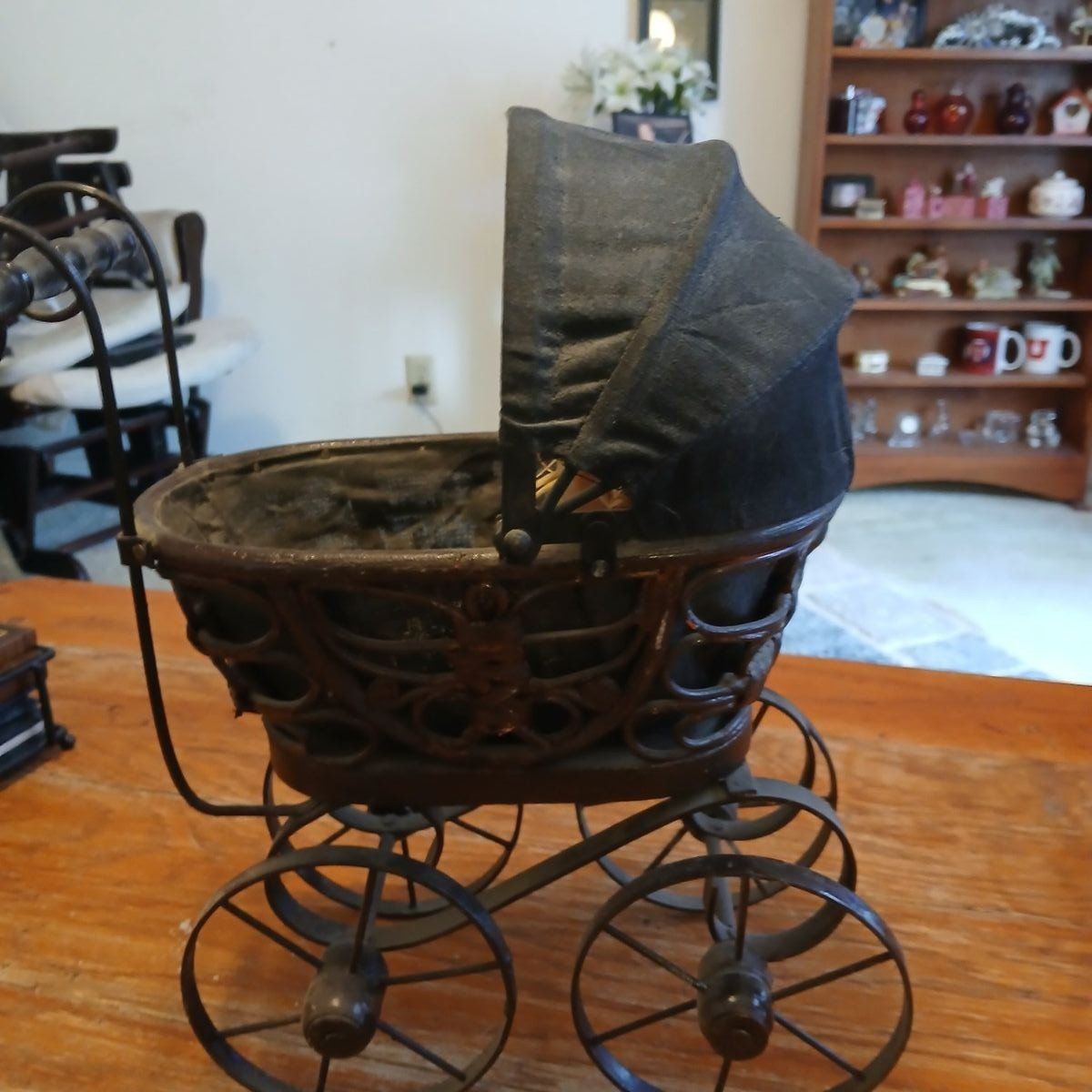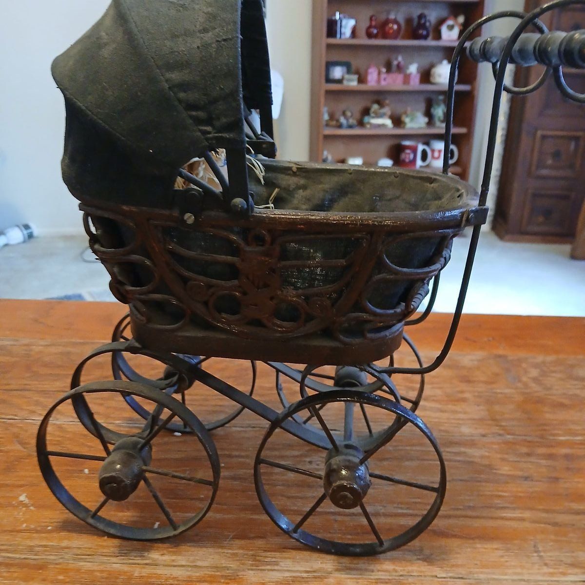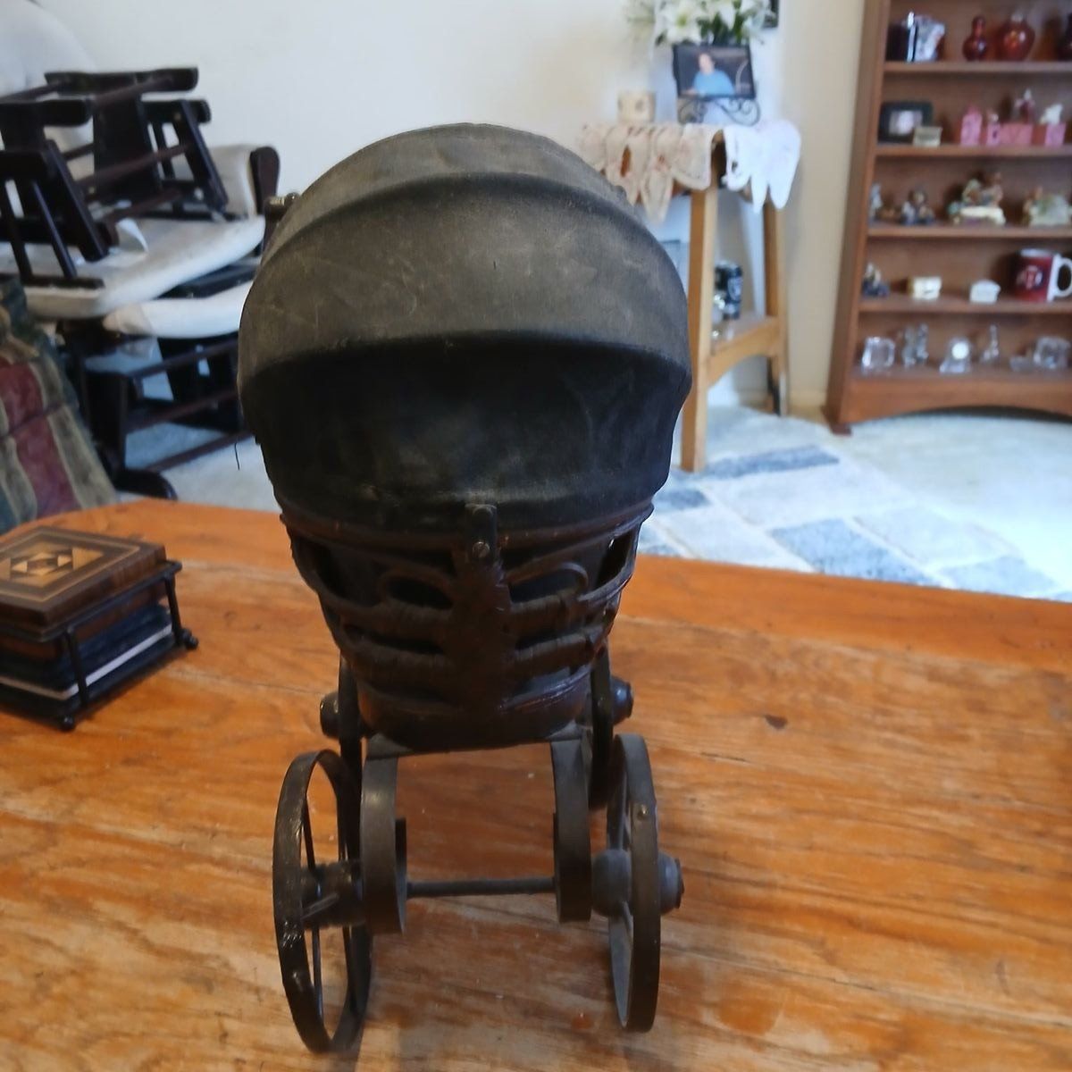 CashAppAntique Victorian style wicker doll stroller pram. vintage wood and metal decor