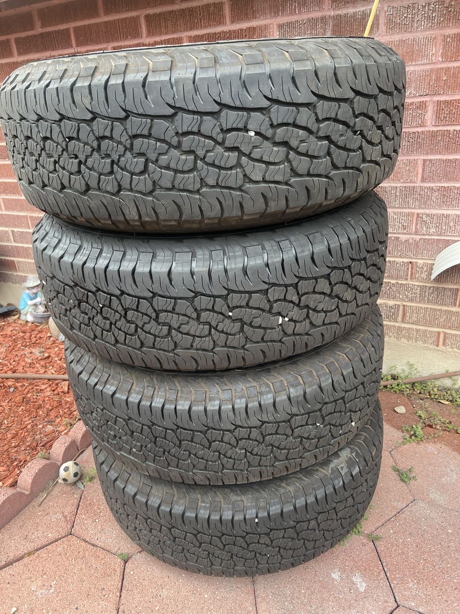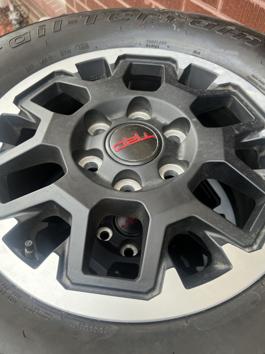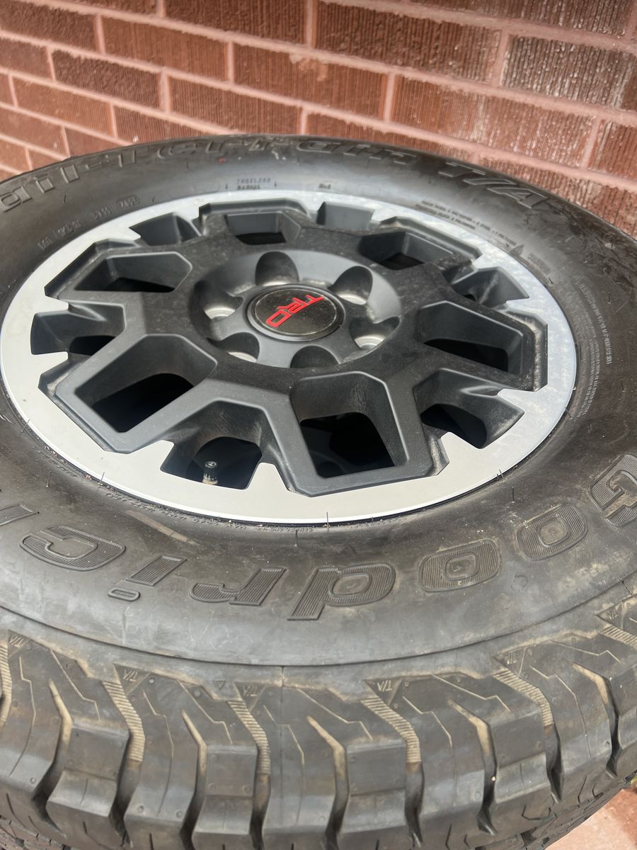 265 70 17 BF GOODRICH “”. all terrain tires brand new and trd toyota wheels from tacoma 2026…Used less than 100 miles ..24 lugnuts oem and spare tire included !! more info or questions call or text Hablo español para cualquier pregunta!!