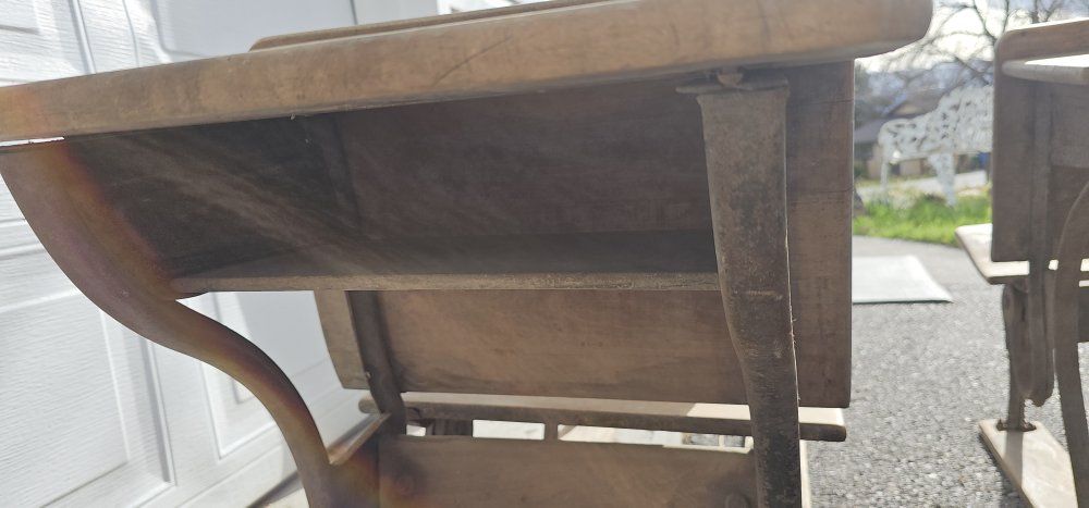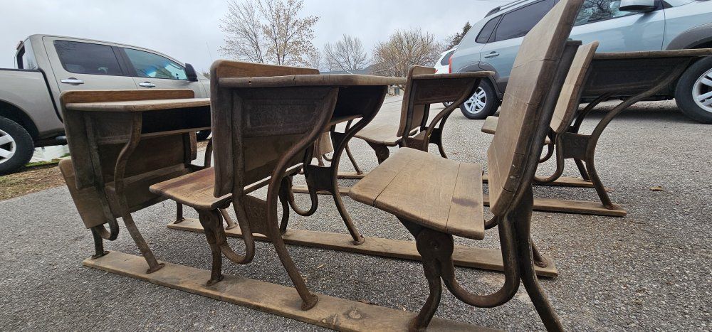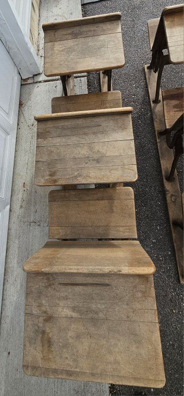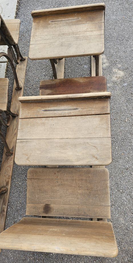 Antique American Seating School Desks - Early 1900s Cast Iron Classroom Row Set Original early-1900s American Seating Company school desks, not separated or refurbished. This set came from a one-room schoolhouse in southwest Pennsylvania and remains in its original classroom row configuration. • 2 connected classroom rows • 5 desks with 6 seats, total • Cast iron frames stamped A.S.Co. 5 - The number 5 size would typically be for older elementary students. • Curved solid wood seats and desk tops • Circa 1905-1915 • All original with natural antique patina and solid structure - some surface rust and wood splitting These make a striking display piece for a restaurant, cafe, homeschool room, or historic interior.