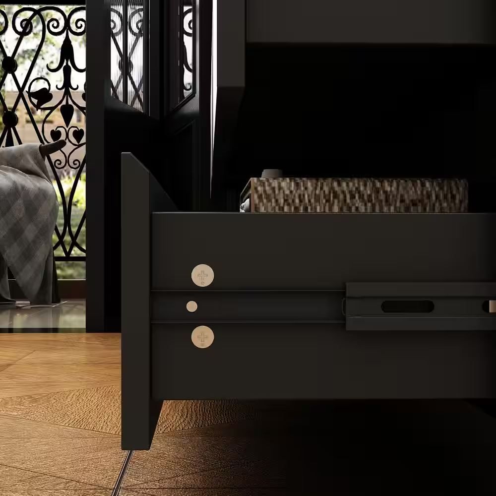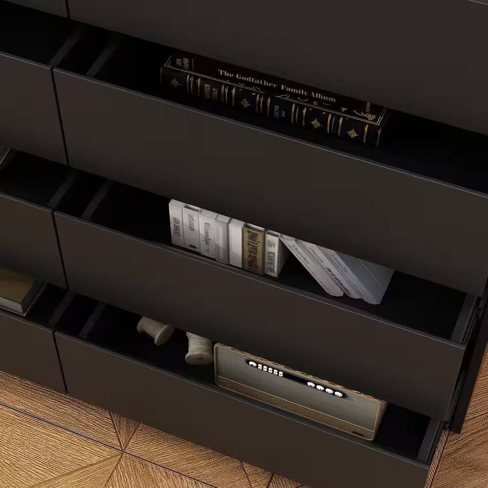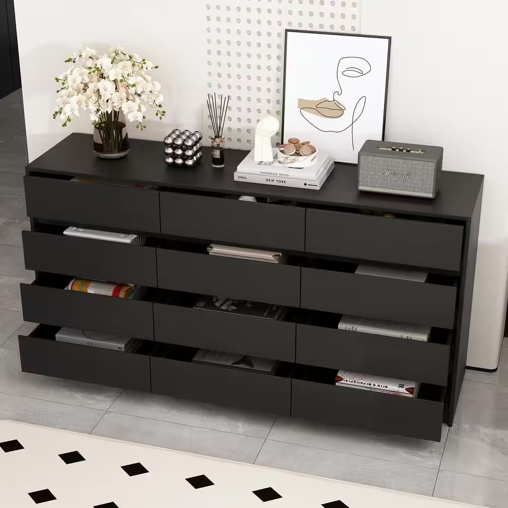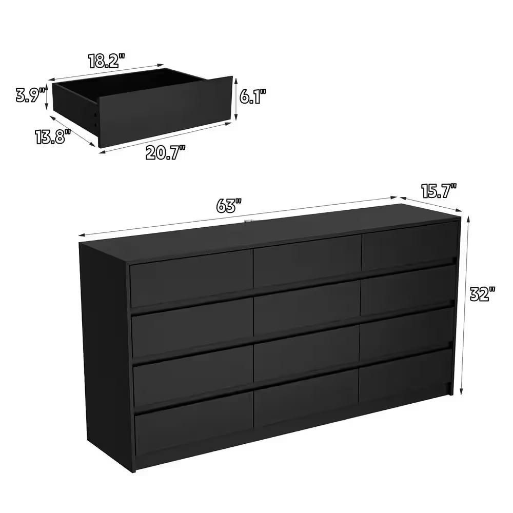 This black wooden dresser has 12 drawers and large table top, providing large storage space and effectively improving space utilization. The main material of the dresser chest is particle board, which has the characteristics of insect-proof, anti-deformation, moisture-proof, sturdy and strong bearing capacity. Can store a lot of make-ups and decors etc. The black look gives a clean, fresh, elegant feel and is very pretty. This is a very eye-catching piece of furniture when you invite friends to your home.. Assembly Required: Assembly Required. Color Family: Black. Color/Finish: Black. Finish Family: Other. Furniture Features: Soft Close. Interior Furniture Type: Dresser. Material: Wood. Number of Drawers: 12. Product Weight (lb.): 137.9 lb. Returnable: 30-Day. Top Material: Wood. Drawer Depth (in.): 15.7 in. Drawer Height (in.): 32 in. Drawer Width (in.): 63 in. Product Depth (in.): 15.7 in. Product Height (in.): 32 in. Product Width (in.): 63 in. Number of Drawers: 12. Material: Wood. Finish Family: Other. Assembly Required: Assembly Required. Furniture Features: Soft Close. Top Material: Wood