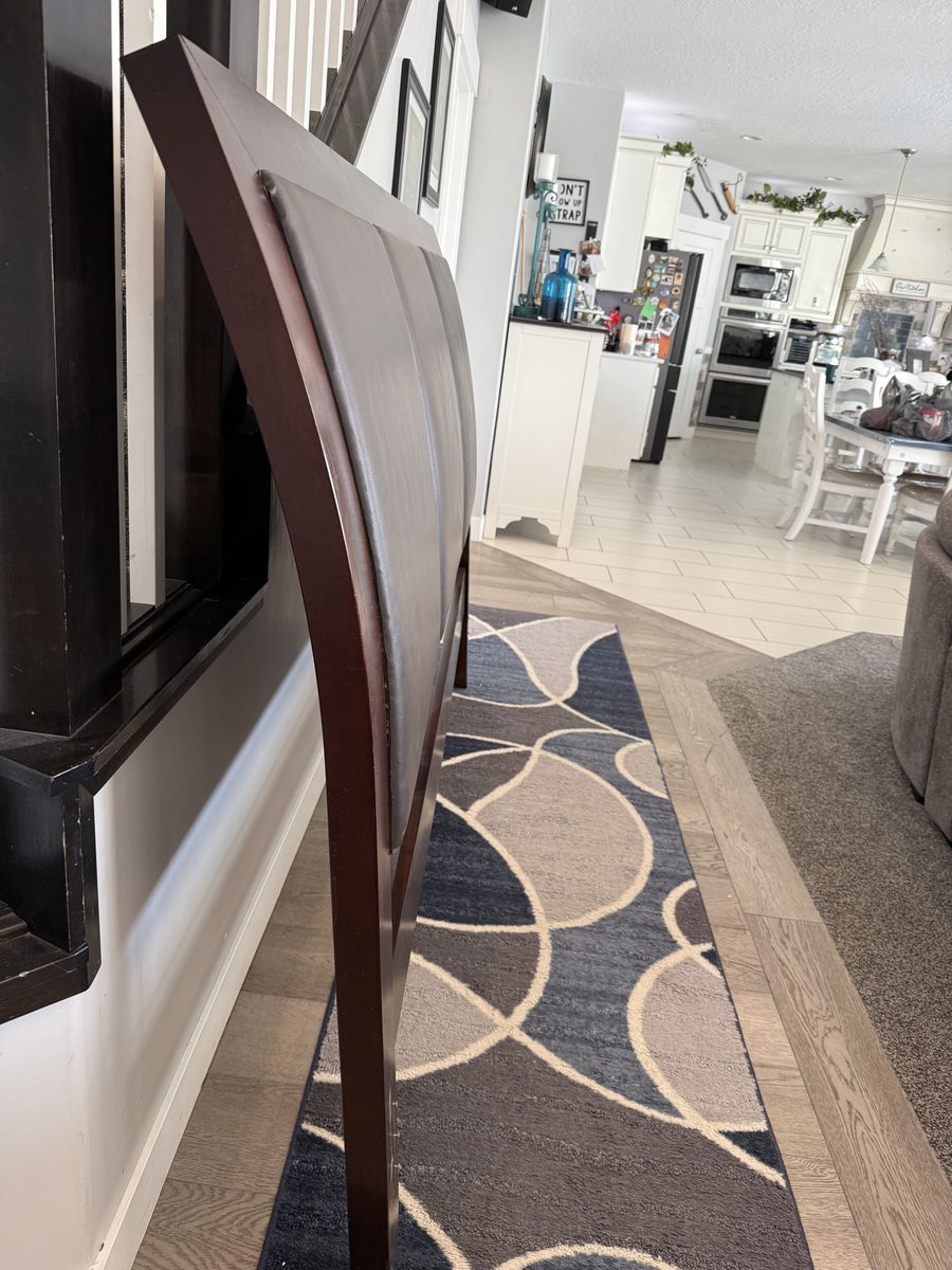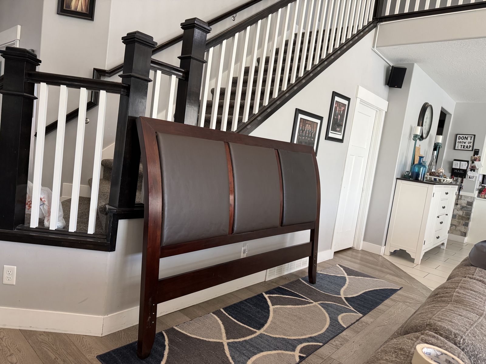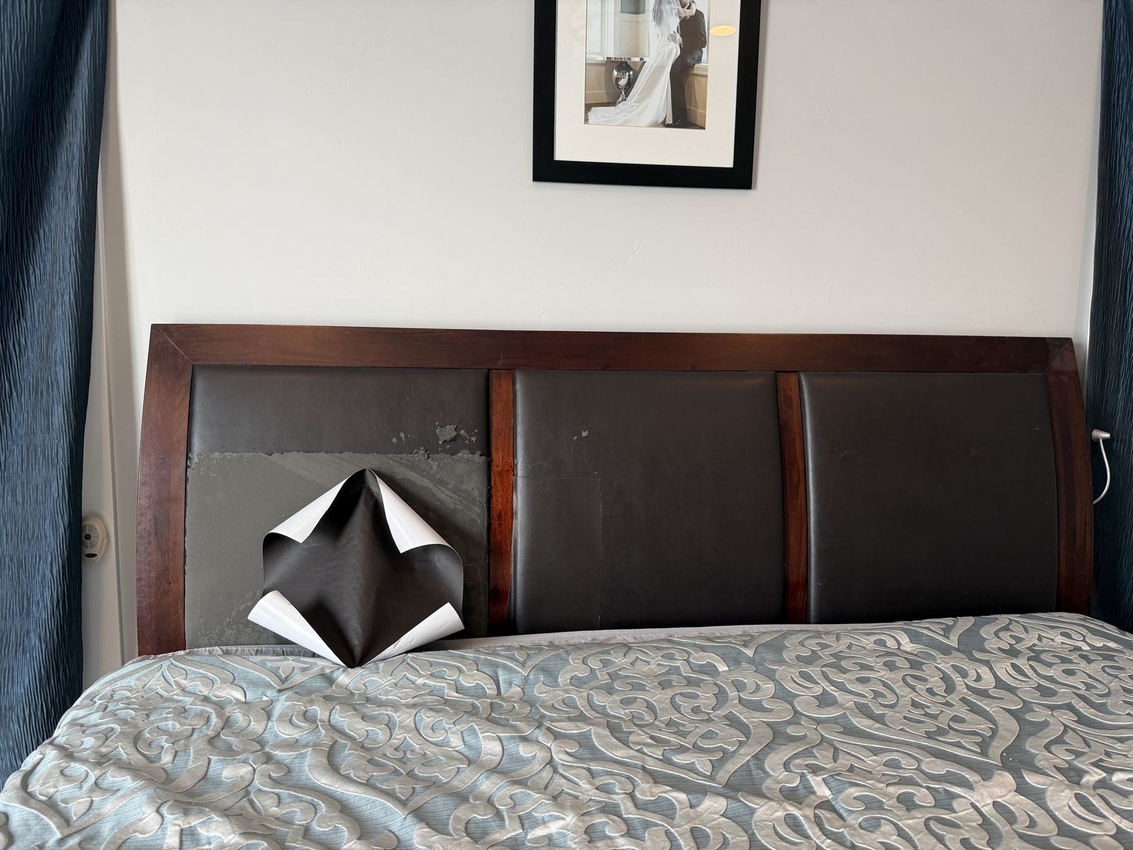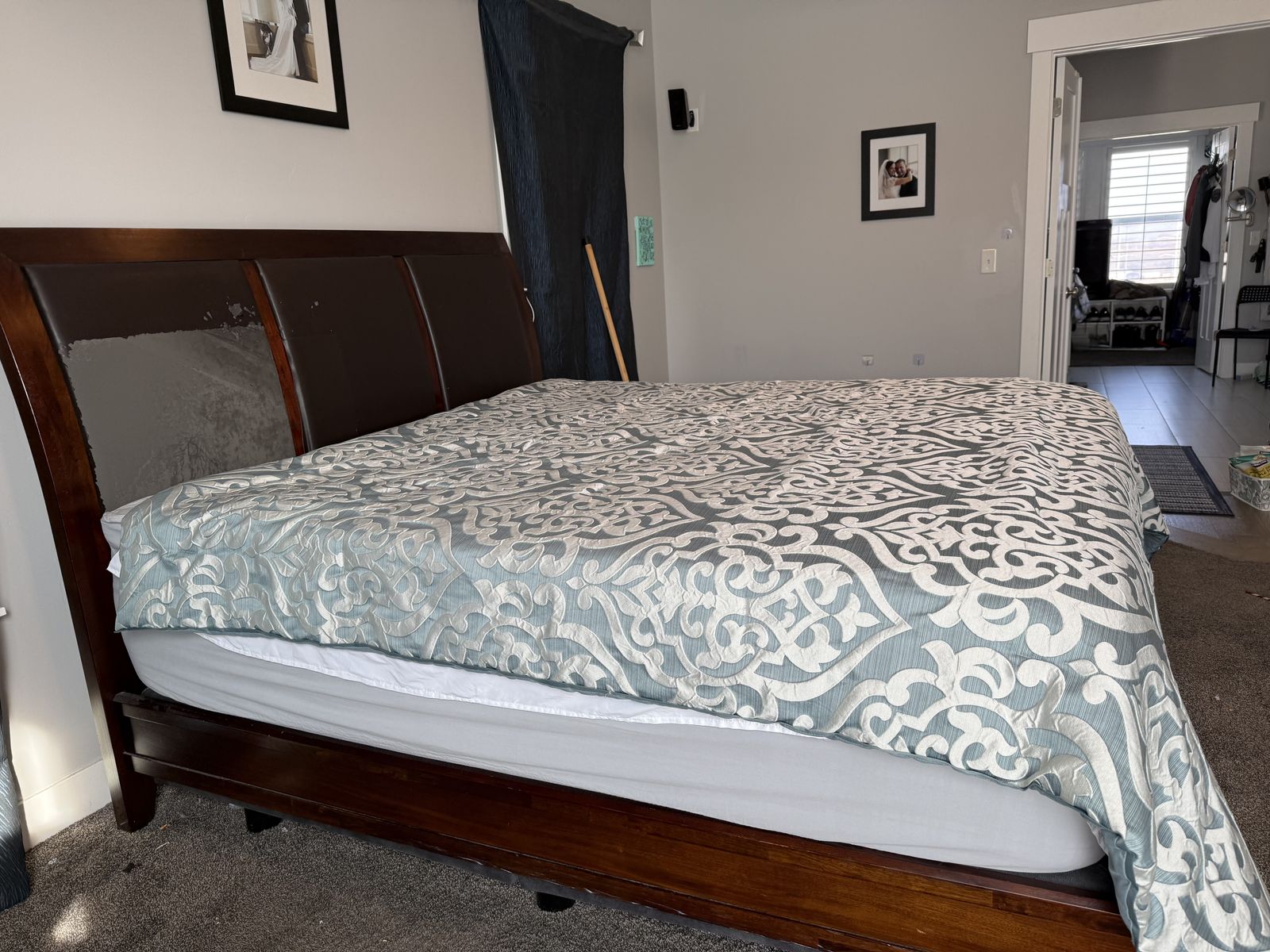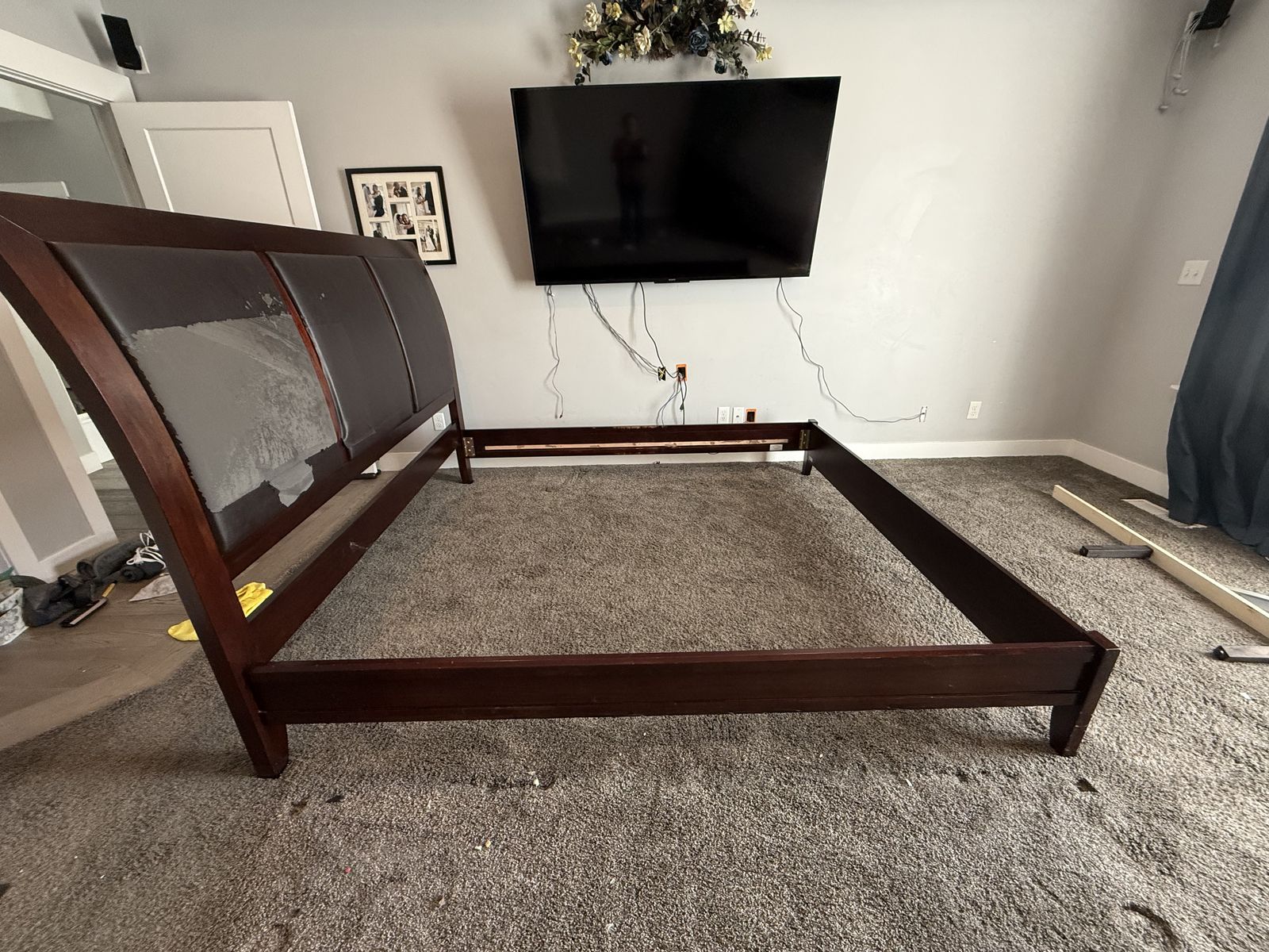 This is a King Size bed frame. It is a beautiful dark cherry wood, solid wood not cheap ikea stuff. The 3 leather squares on the back of the head board had 2 that were worn, as you can see in the pictures. We recovered them with a full size leather patch. Looks brand new now!