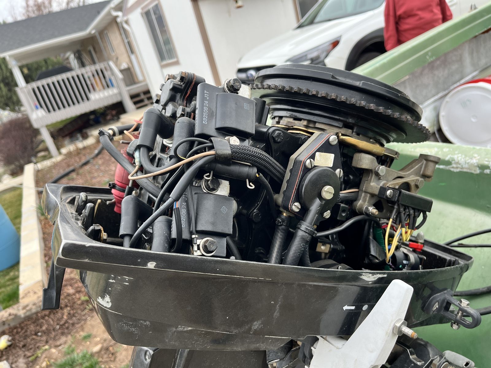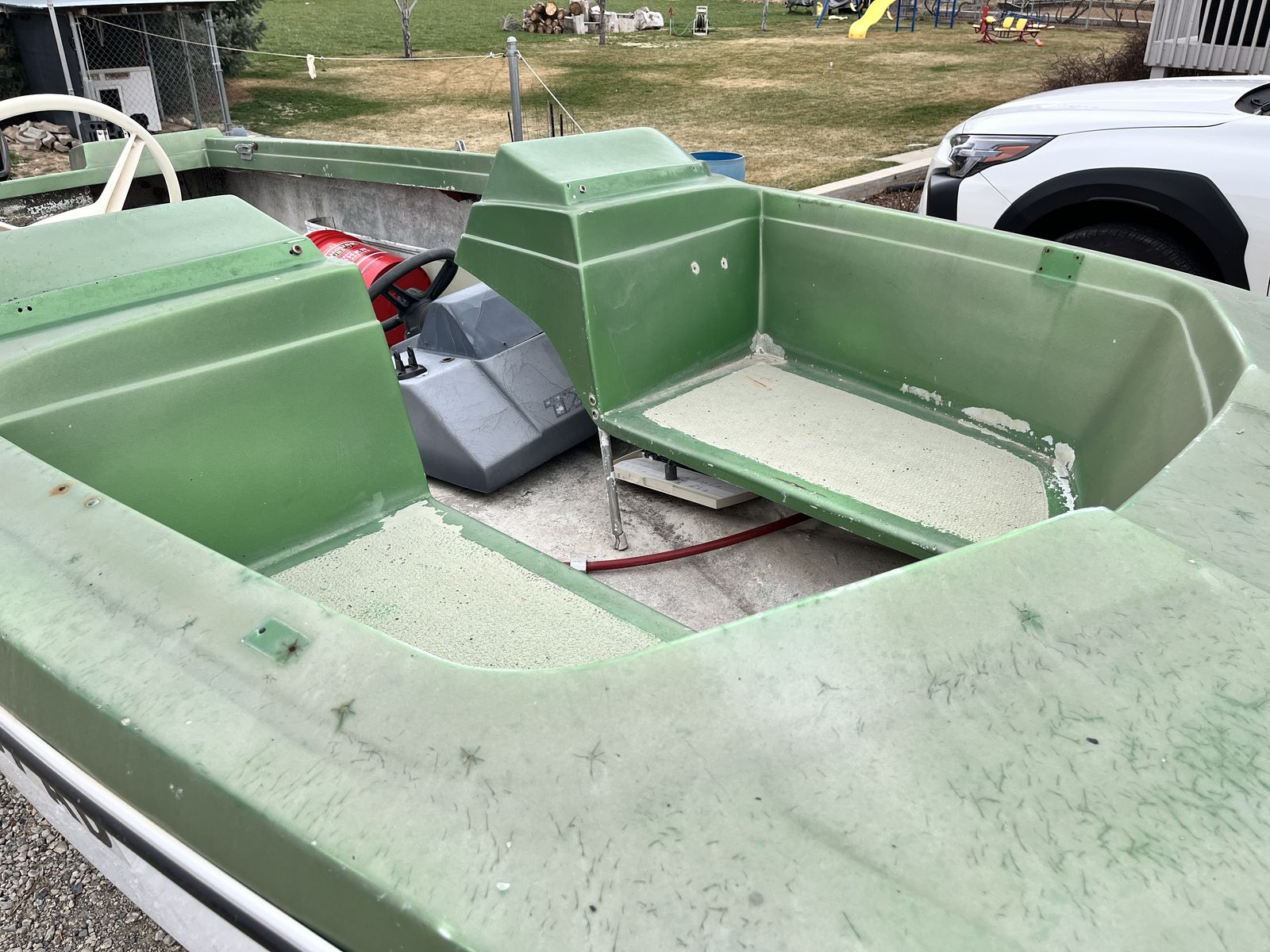 VenmoProject boat. Fiberglass. Don’t have time to pull this one together. Need gone. Johnson Tracker 25 horsepower with ignition/controller. Compression good. Could just be ignition coils. Comes with Fuel cell, 2-stroke oil. Trailer lights work. New 2” hitch installed. New tongue jack. Prepped for body work and paint. Parts in glove box. Color matched metallic green paint included. Boat floats. Bill of sale. Cash or Venmo. (I’m not parting it out- all or nothing). May trade for a motorcycle.