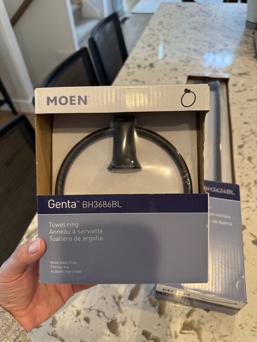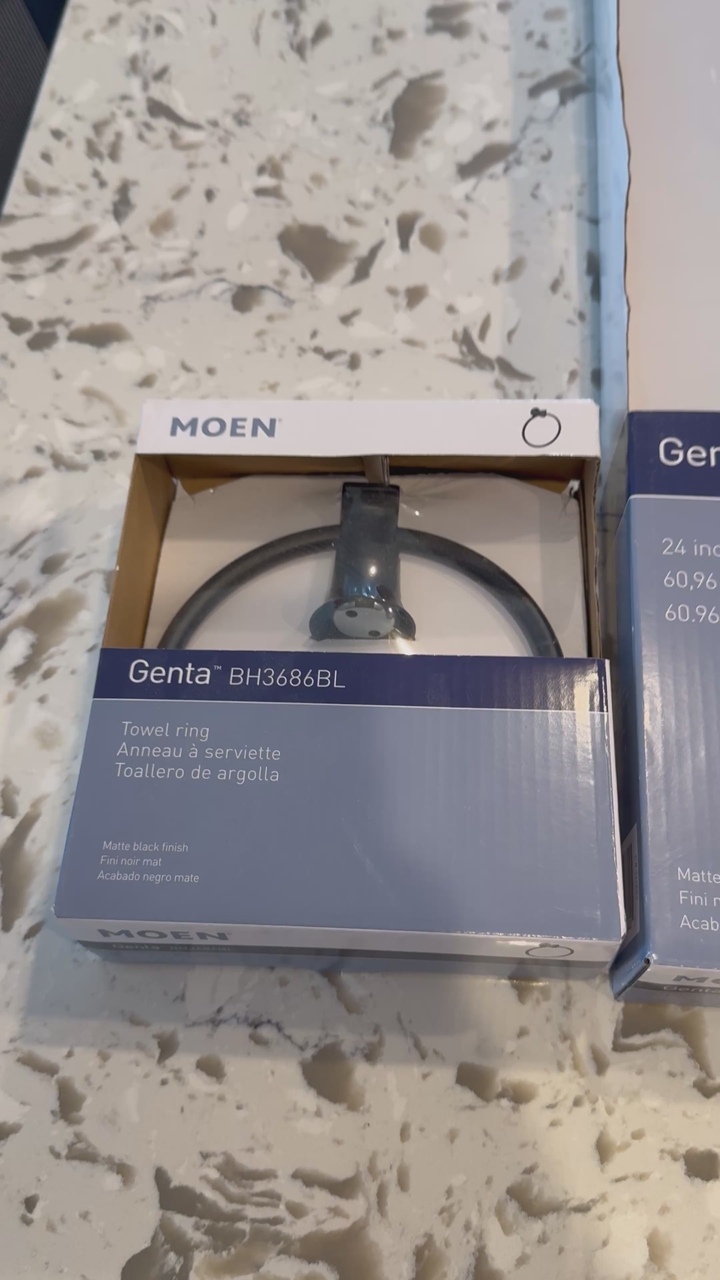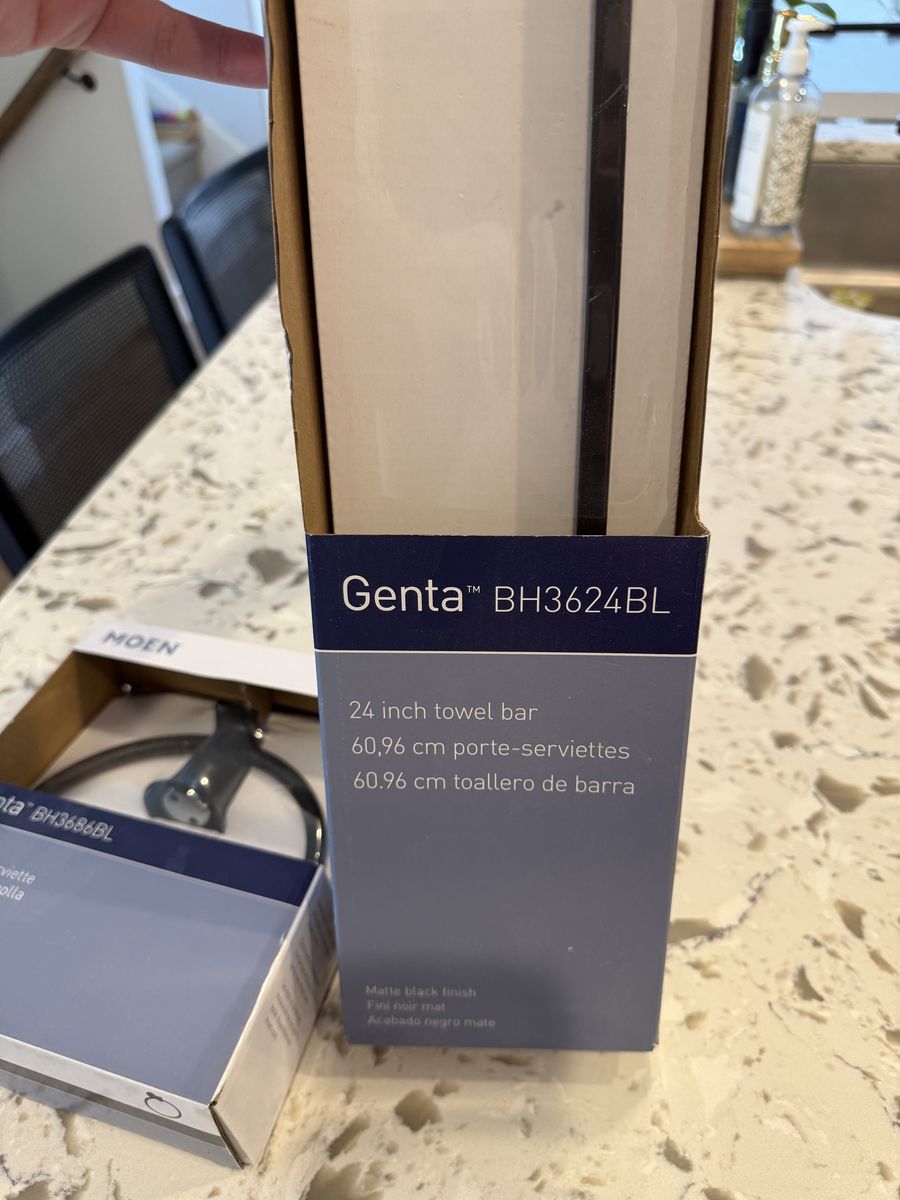 VenmoStylish Moen Genta collection bathroom hardware. Has matte black finish. Includes a 24-inch towel bar and matching towel ring. Both are new in box.