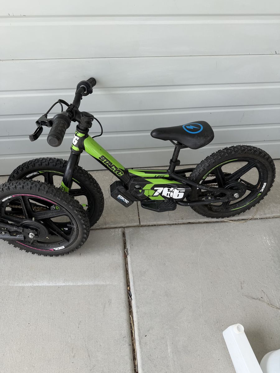 I have two 16 inch Stacyc bikes for sale. Both are in good condition. They have some scratches but are overall clean bikes. Each will come with a large capacity Stacyc brand battery and charger. They are great bikes with adjustable power settings. Only owned for one summer. My kids out grew them over the winter. Price is for each bike