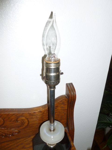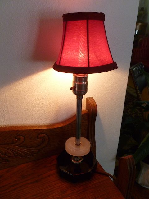 VenmoVery unusual type desk lamp. This has a octagon shaped black glass/stone base with a white type marble ring above it. It is 14 1/2 inches tall x 4 inches wide. This has the nice old cloth cord on it. It works and it is in great condition. The shade pulls right off it you prefer a different color of shade or style. Price is firm.