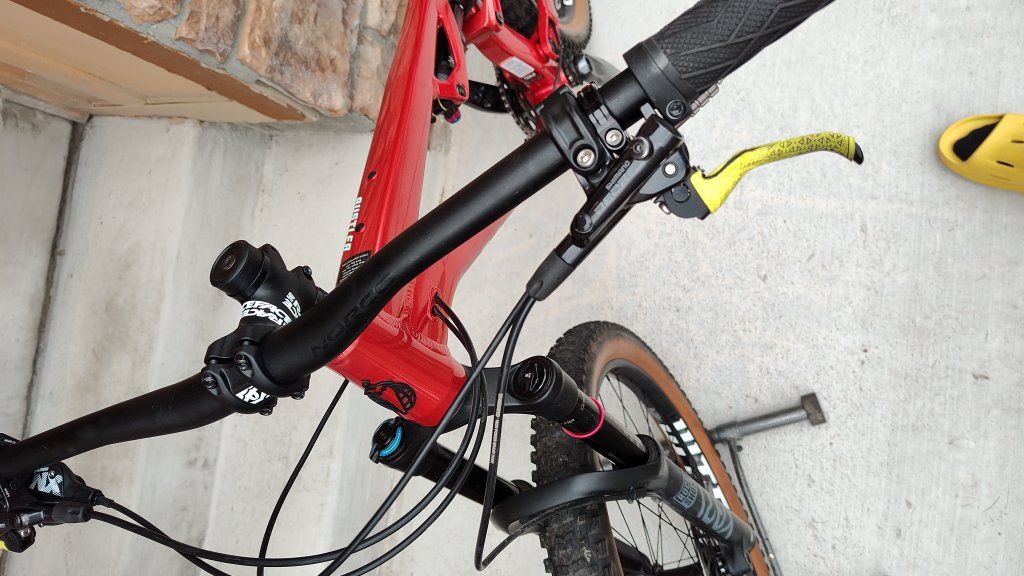 Fox DPS rear shock 130mm Rockshox Yari fork 150mm 170mm dropper post, wolftooth chess piece lever WTB i35 wheel set Maxxis Rekon 27.5x2.80 Shimano Deore 4 piston brakeset Norco alloy bar raceface stem Giant saddle GX 170mm cranks, NEW NX cassette, derailleur, and shifter
