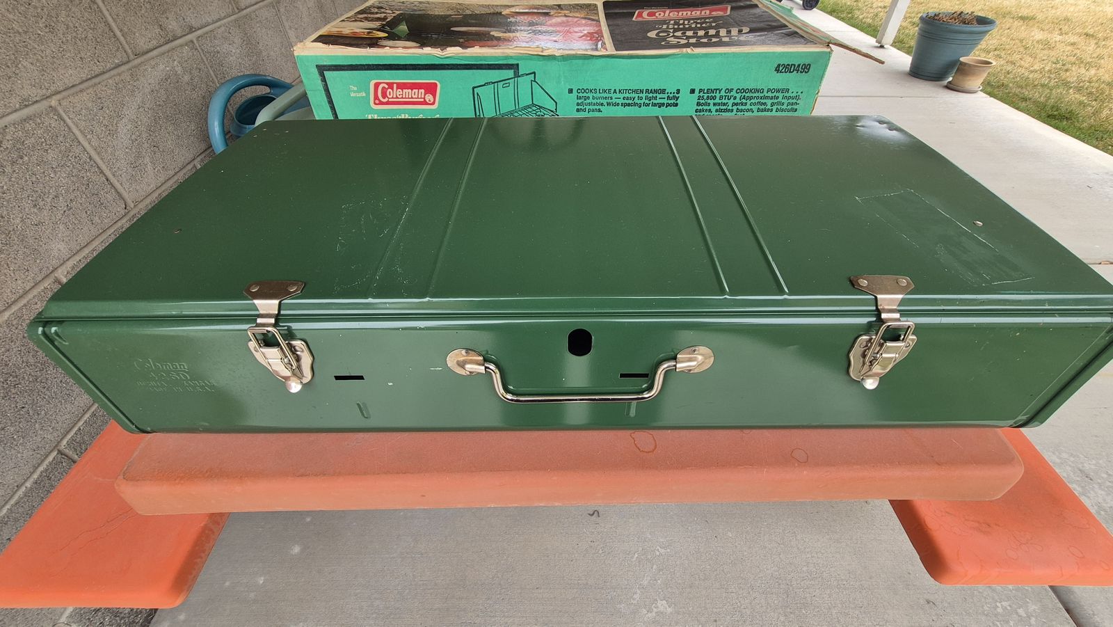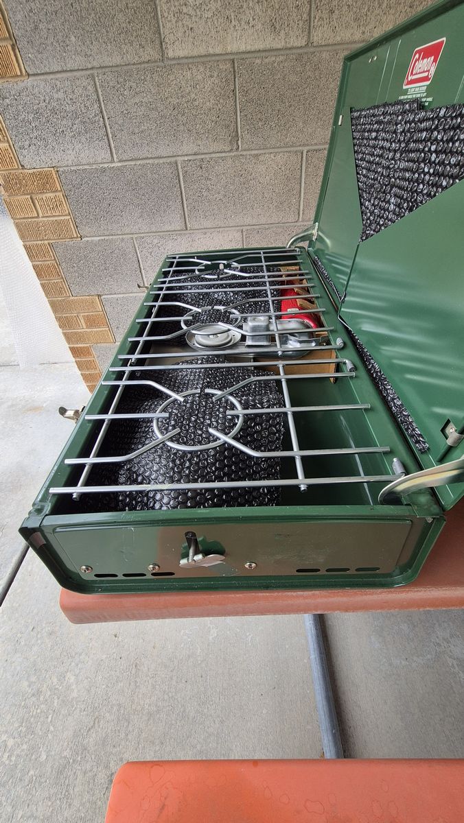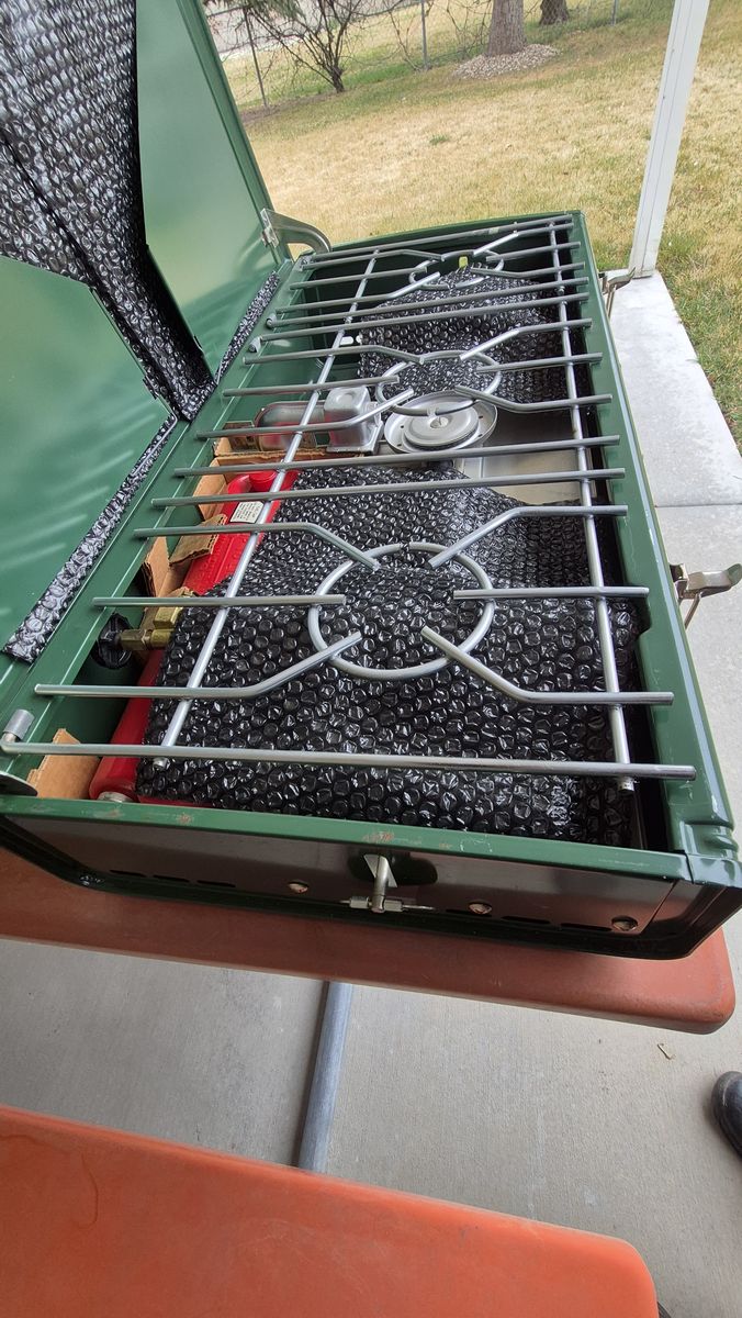 I'm selling a Coleman 426D, THREE burner stove that is NEW IN THE BOX. It is MINT. It doesn't get better than this. It has never been used - ever. Check out the photos. The burners and grate show zero wear. The plastic bubble wrap, cardboard, and packaging is original. The lines on the cover are from the original tape which I removed. They are not scratches. They can be rubbed off. I purchased it several years ago, put it on the shelf in the garage, and never used it. I thought I'd use it, but never did. If you want it, it's yours. $299.99.