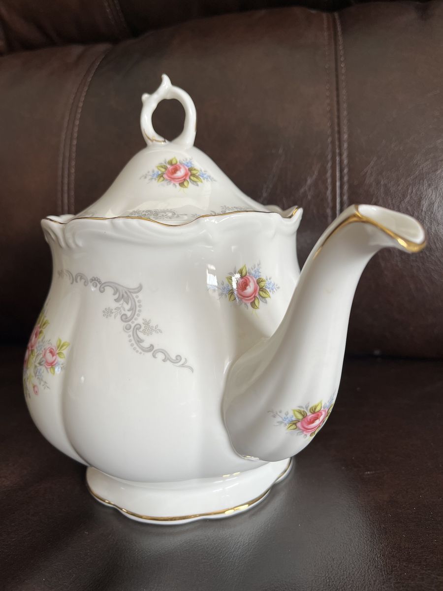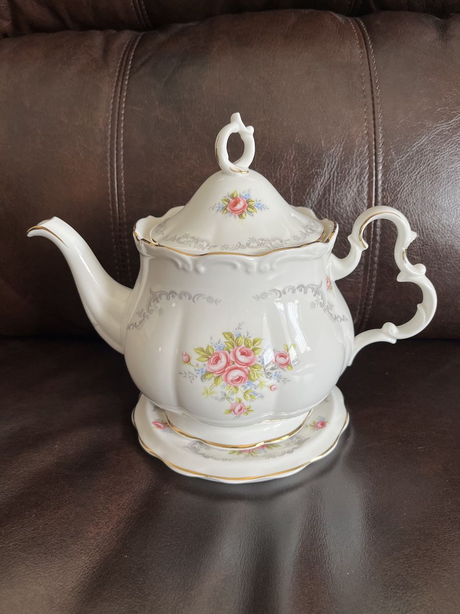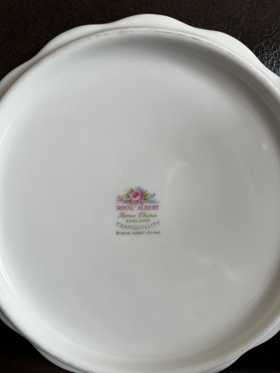 VenmoThis is a one of a kind find! A matching set of bone china, made in England from the 1960's. This has been in my moms antique china cabinet for over 50 years. It is in excellent-mint condition! She thought it was just too pretty to use! The tea pot measures 7 1/2 inches tall x 10 1/4 inches wide. I believe it holds six cups. The matching trivet measures 6 inches across. Both pieces are marked Royal Albert - Bone China - England - TRANQUILLITY -Royal Albert LTD. 1969. The tea pot lid has a air hole in the lid, to let steam out and it is made to fit the top perfectly with the one square side. The pattern has pretty pink roses, silver gray swags, and tiny blue flowers with a beautiful gold trim. Never do you find a matching teapot and a matching trivet. This is sold as a set. Selling for a parent. No trades and I will not ship this. Price is firm