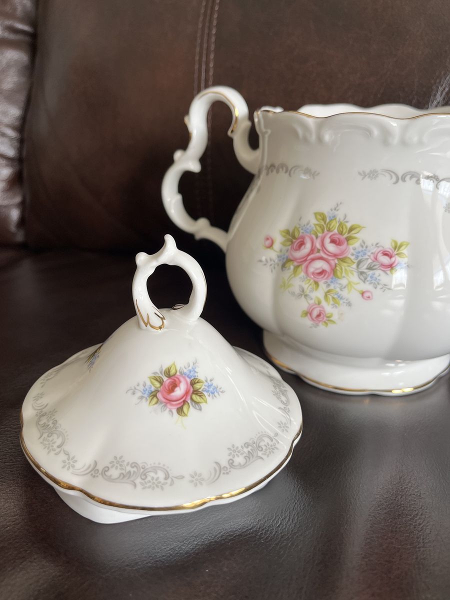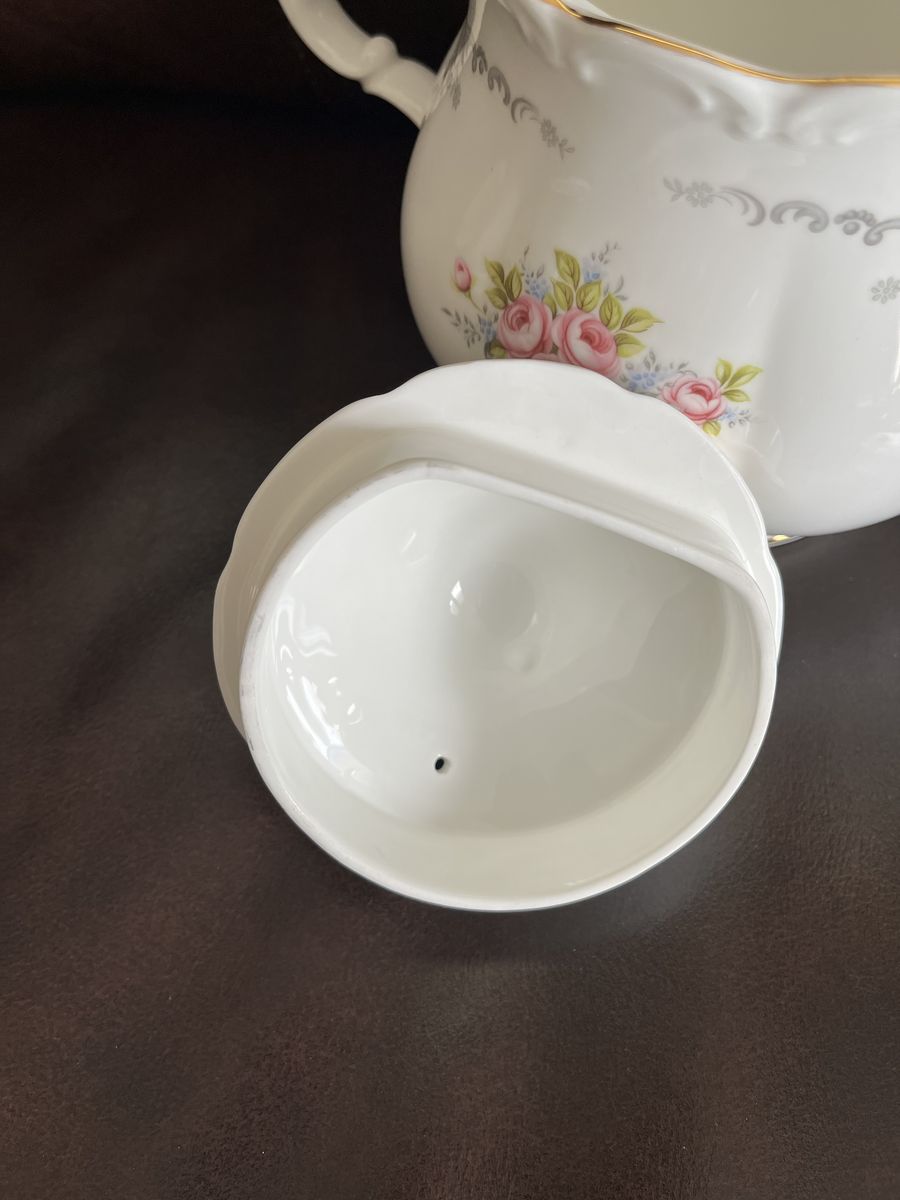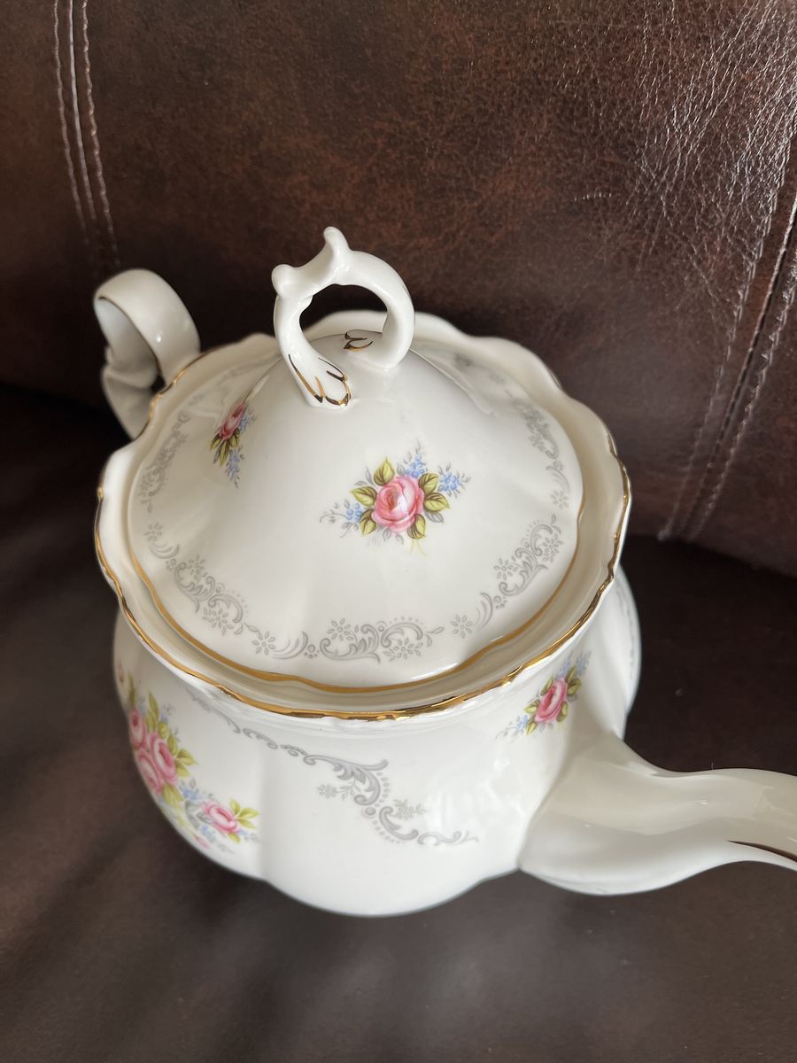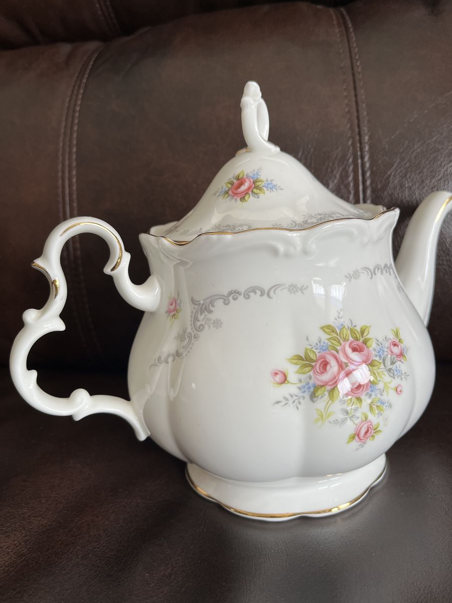 VenmoThis is a one of a kind find! A matching set of bone china, made in England from the 1960's. This has been in my moms antique china cabinet for over 50 years. It is in excellent-mint condition! She thought it was just too pretty to use! The tea pot measures 7 1/2 inches tall x 10 1/4 inches wide. I believe it holds six cups. The matching trivet measures 6 inches across. Both pieces are marked Royal Albert - Bone China - England - TRANQUILLITY -Royal Albert LTD. 1969. The tea pot lid has a air hole in the lid, to let steam out and it is made to fit the top perfectly with the one square side. The pattern has pretty pink roses, silver gray swags, and tiny blue flowers with a beautiful gold trim. Never do you find a matching teapot and a matching trivet. This is sold as a set. Selling for a parent. No trades and I will not ship this. Price is firm