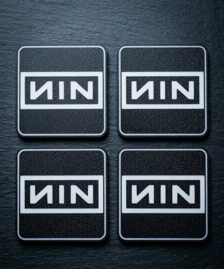 Set of four Nine Inch Nails coasters. High-quality industrial look with a textured matte finish.