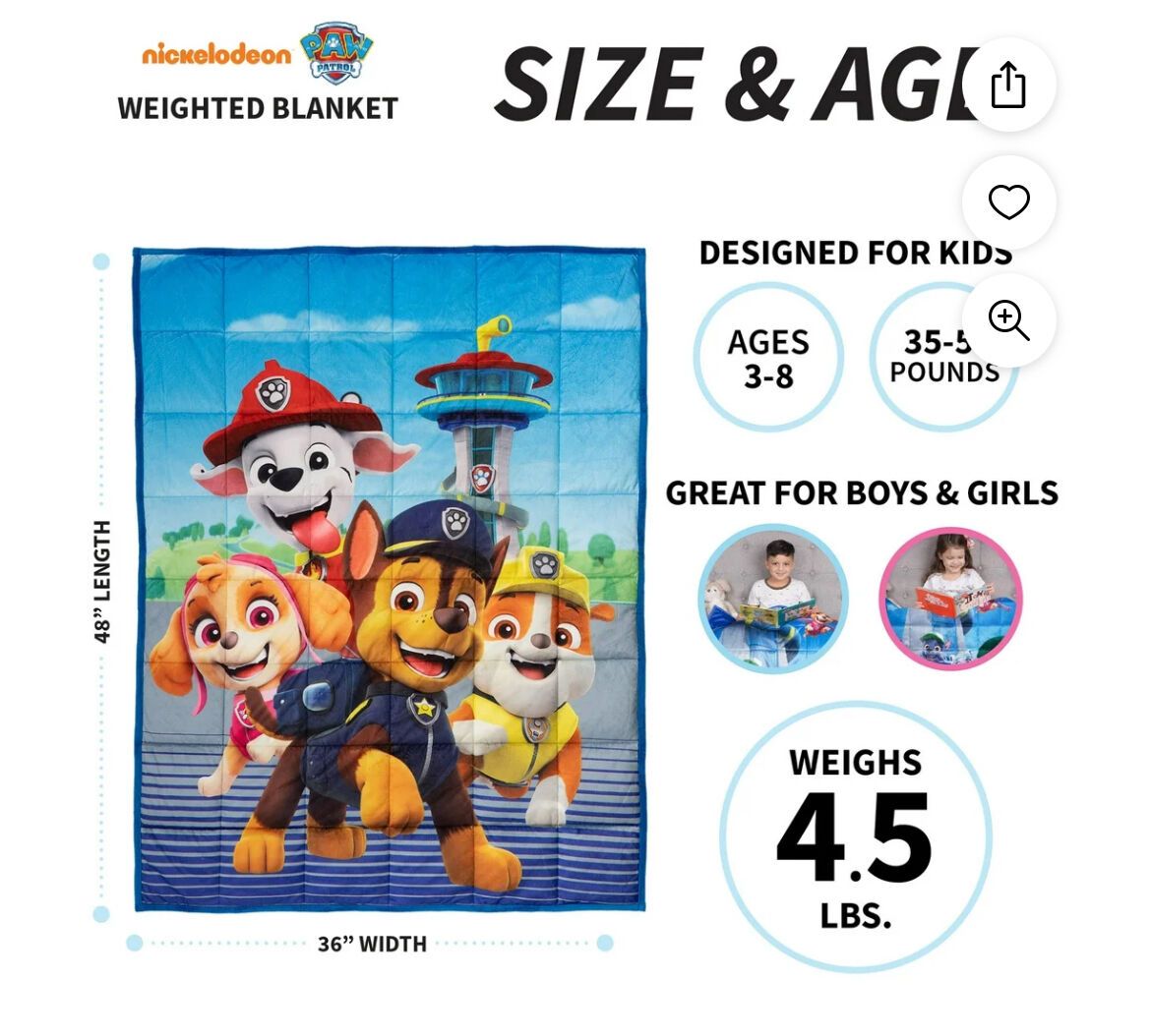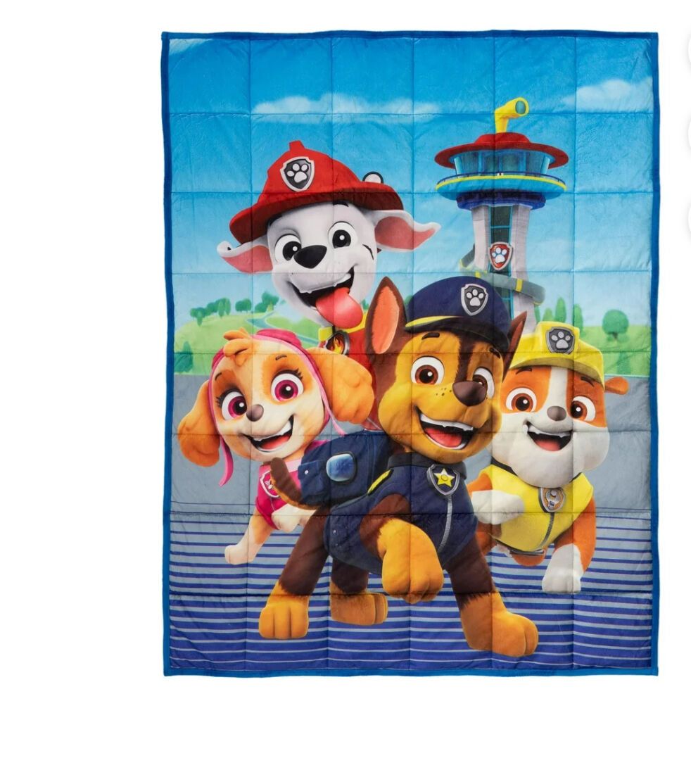 The pups of Nickelodeon's hit animated series Paw Patrol will help kids feel safe and sound with this weighted blanket. Featuring rescue pups Marshall, Chase, Skye, and Rubble in a colorful Paw Friends pattern, this plush blanket is always ready for action. This super soft weighted blanket is a warm and cozy way to help kids feel more secure while resting, sleeping, traveling, or cuddling up to watch Paw Patrol. It is designed to apply gentle, even pressure that mimics the feeling of being hugged. The safe, durable design features glass beads that are securely contained within the blanket's inner pockets. Kids love to watch the adorable antics of the brave and friendly pups on Nickelodeon's Paw Patrol. Bring the excitement home with a high-quality weighted blanket that makes them feel safe and snug while they await their next rescue mission.
