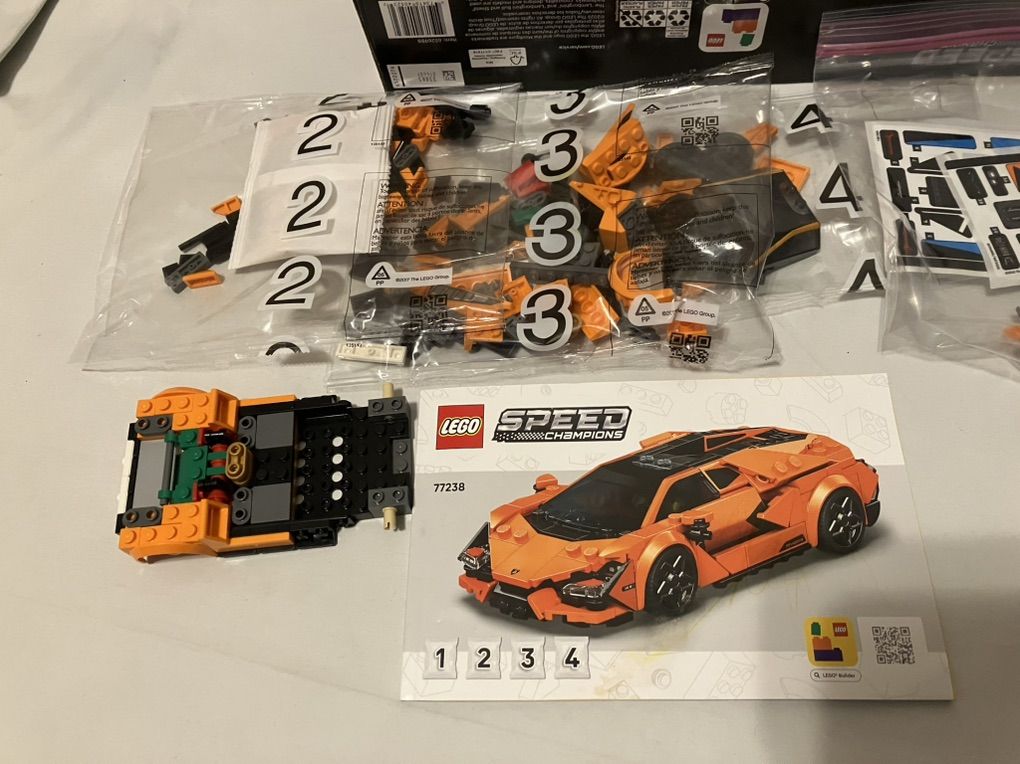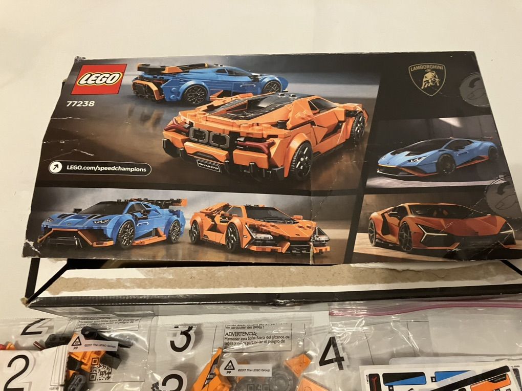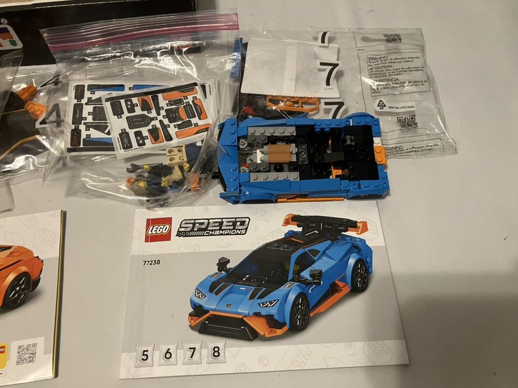 LEGO 77238 Lamborghini race cars. Incomplete. I think the orange car is complete except for some wheel rims, bags 2-4 are unopened. The blue car is missing a handful of pieces and all of bag 8, bag 7 is still unopened. Sticker set is unused. Both manuals included (orange manual has a stain on the front) and the box.