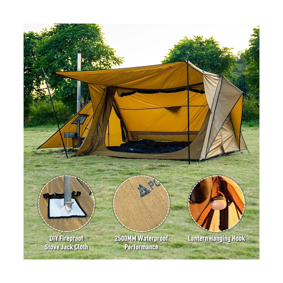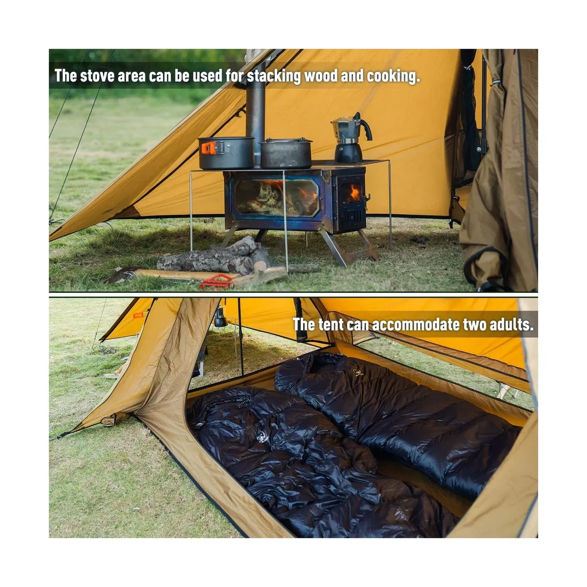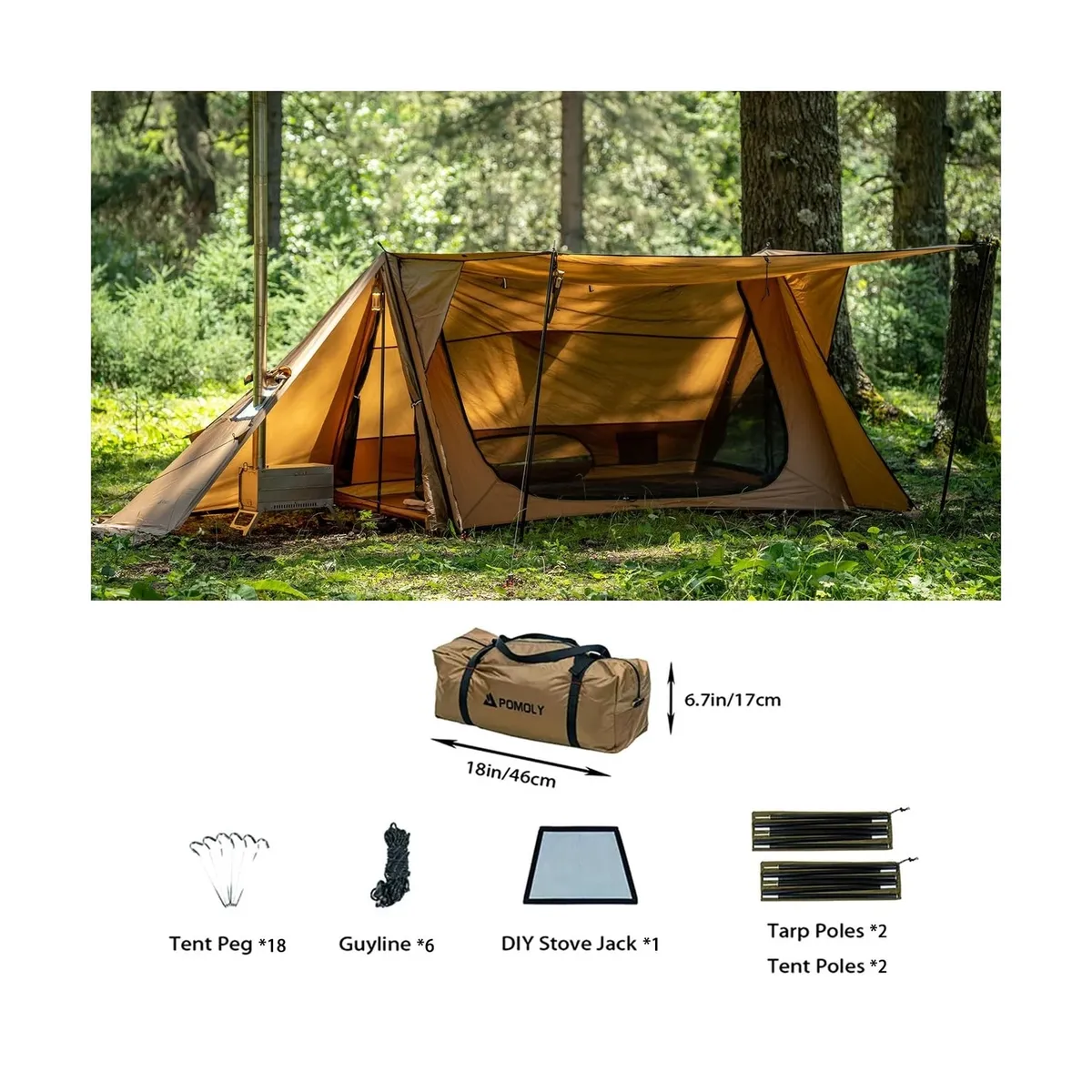 VenmoOne time use only on this awesome hot tent/shelter built for 2 people! (although after use I would suggest two people would be a tight squeeze). Stove Jack, Tent Pegs, Guylines all included with sale however, no tent poles or tarp poles included. Ability to use some standard hiking poles, anything telescopic will work to support/stabalize tent. Hard to find!