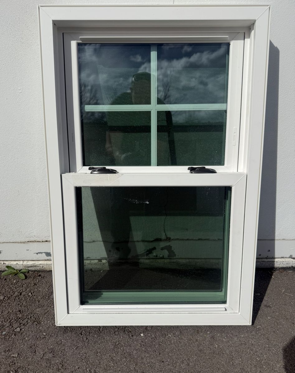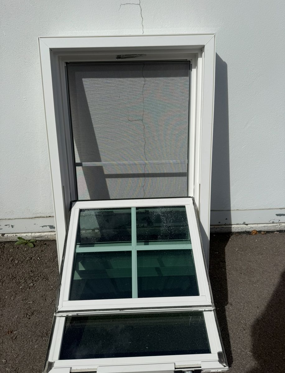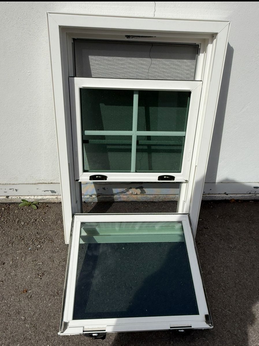 This is a brand new Beige Exterior White Interior double hung window. This windows upper & lower glass slide up & down as well as the screen. Both upper & lower pane fold inwards for easy cleaning.