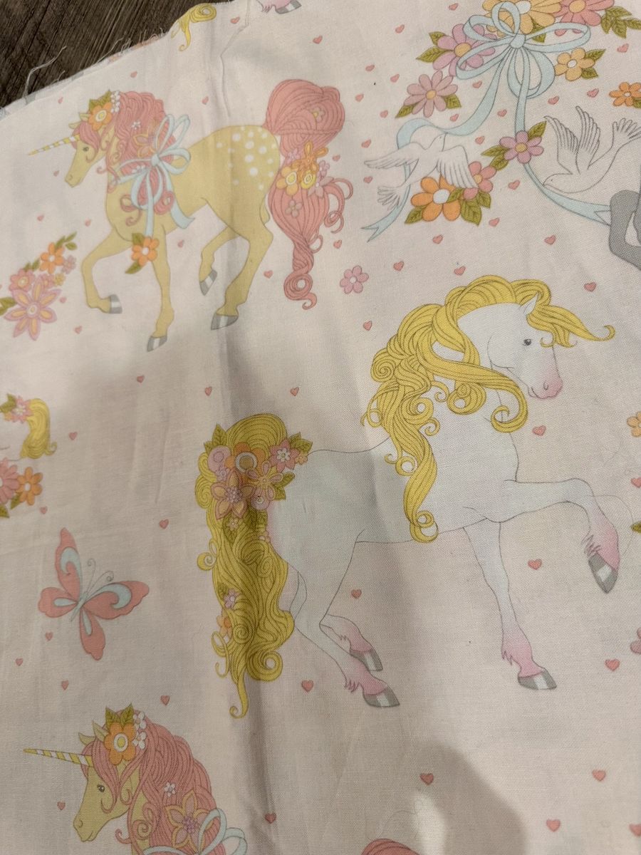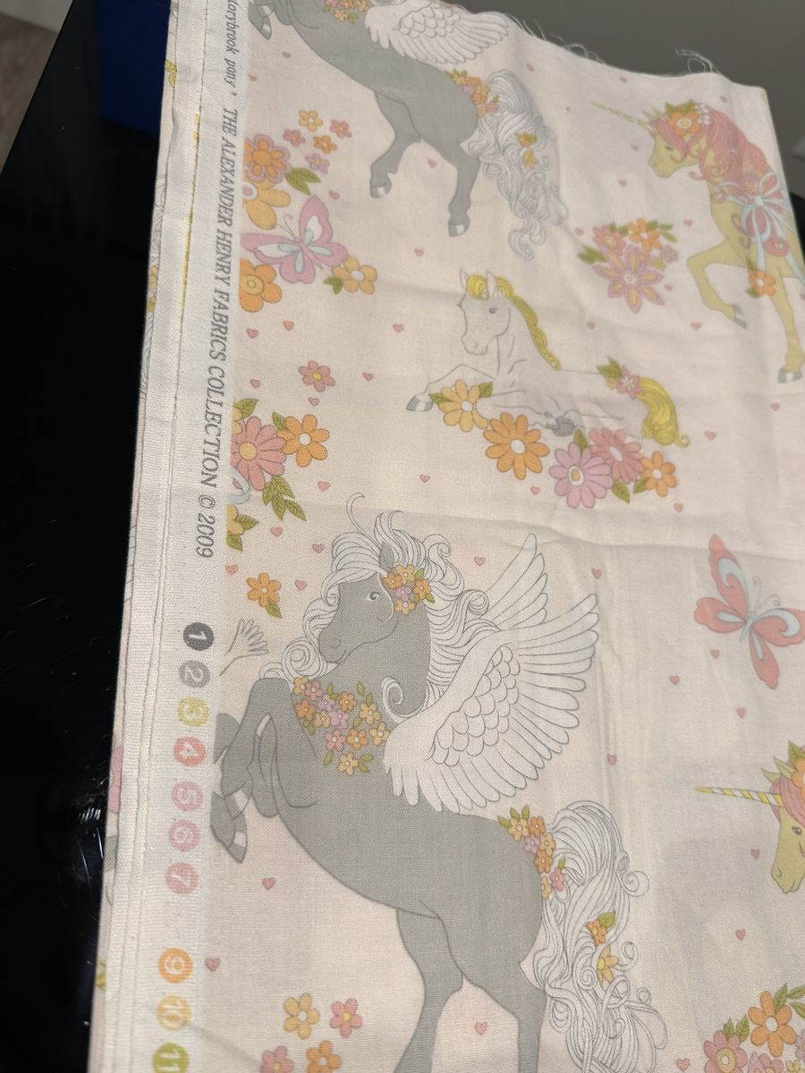 ApplePayOne yard of adorable “Storybook Pony” quilting fabric from the 2009 Alexander Henry Fabrics collection. Features whimsical unicorn and pegasus ponies with flowers and butterflies in soft pastel colors. Perfect for quilting, children’s clothing, crafts, or anyone who loves vintage novelty fabrics.