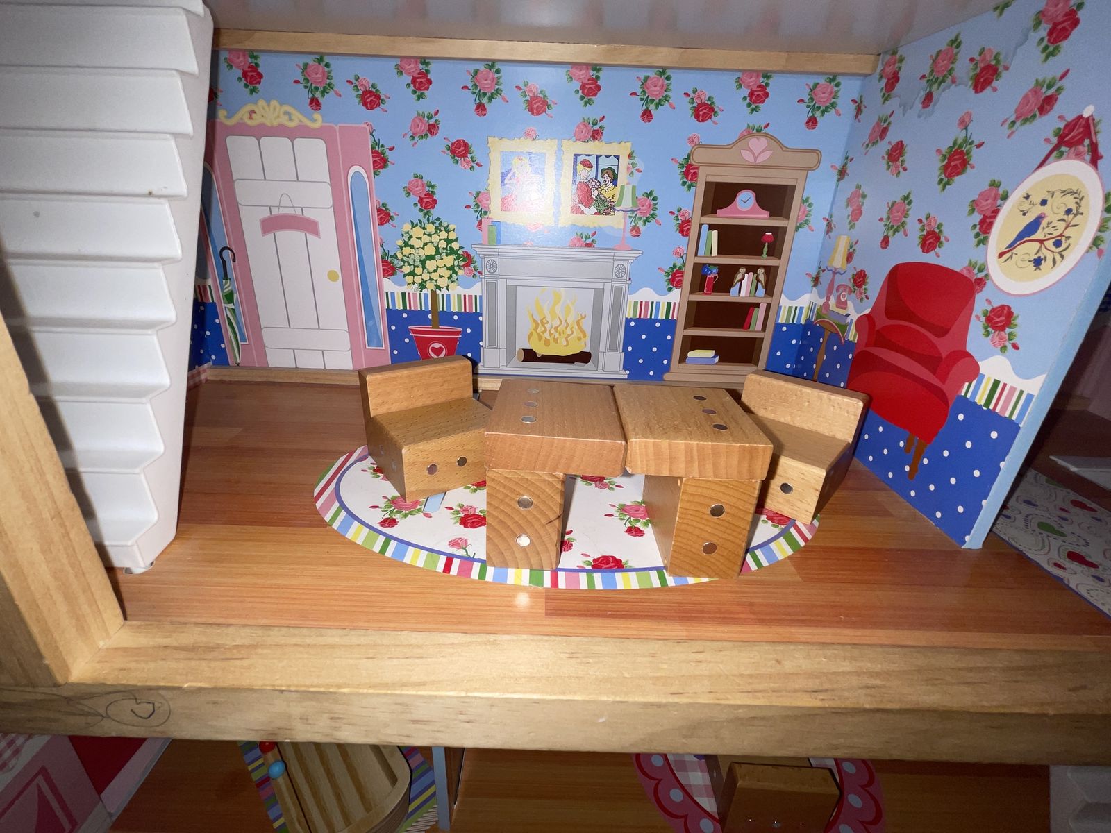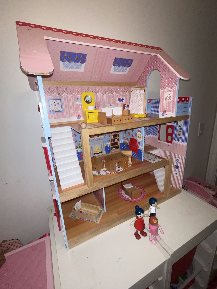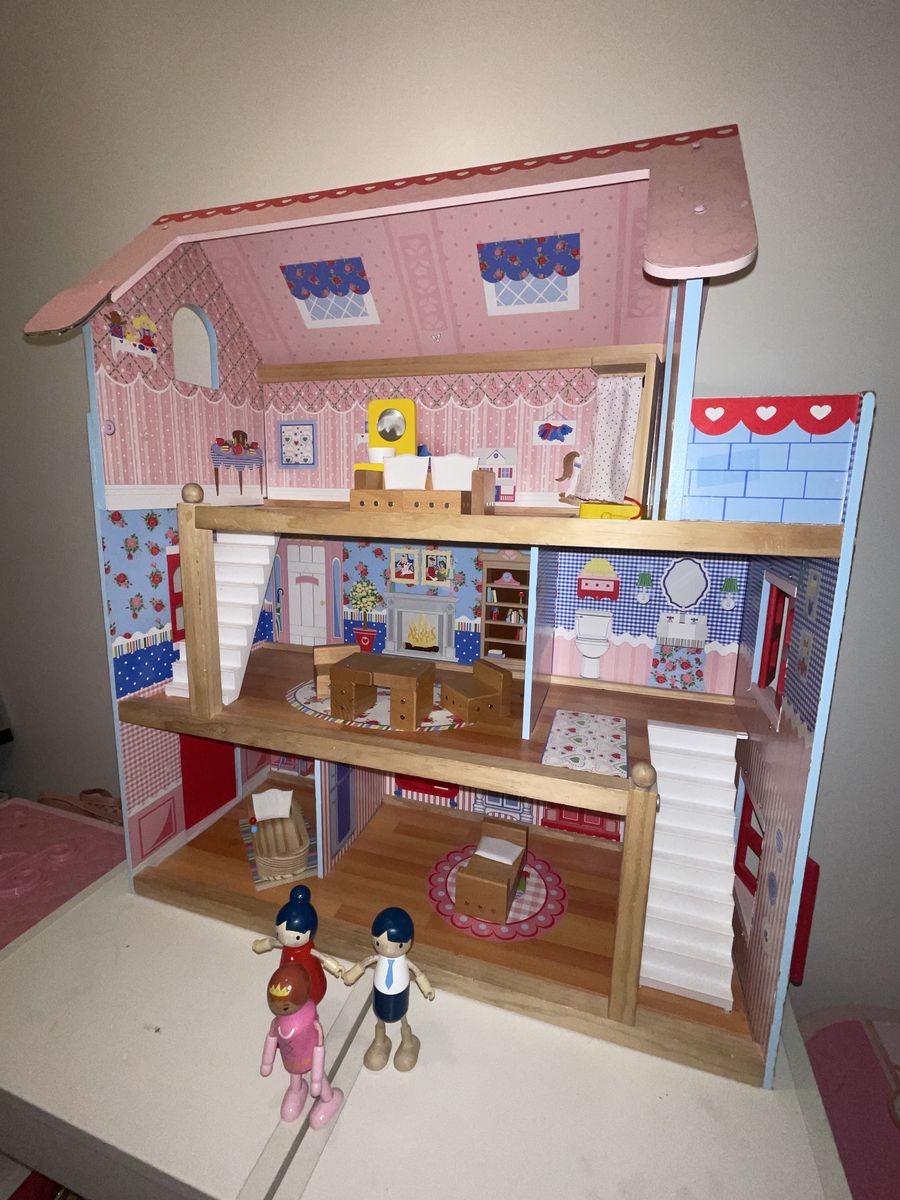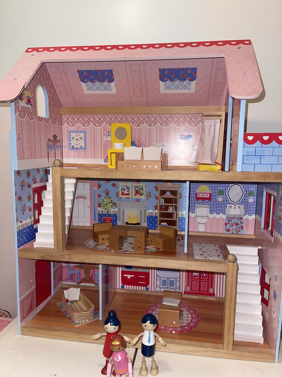 PayPalThis is a cute KidKraft dollhouse. It comes with some furniture and a family. The dollhouse has some wear and tear (there is a picture of part of the roof that needed to be covered.) But this is a cute set!