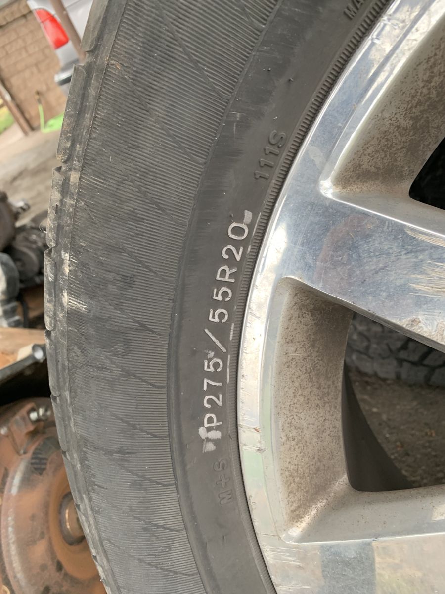 These came off a 2005 Cadillac Escalade. They’re a 20” diameter, with a 275/55-20 tire size. The tire tread varies from wheel to wheel, but they hold air and can be used.