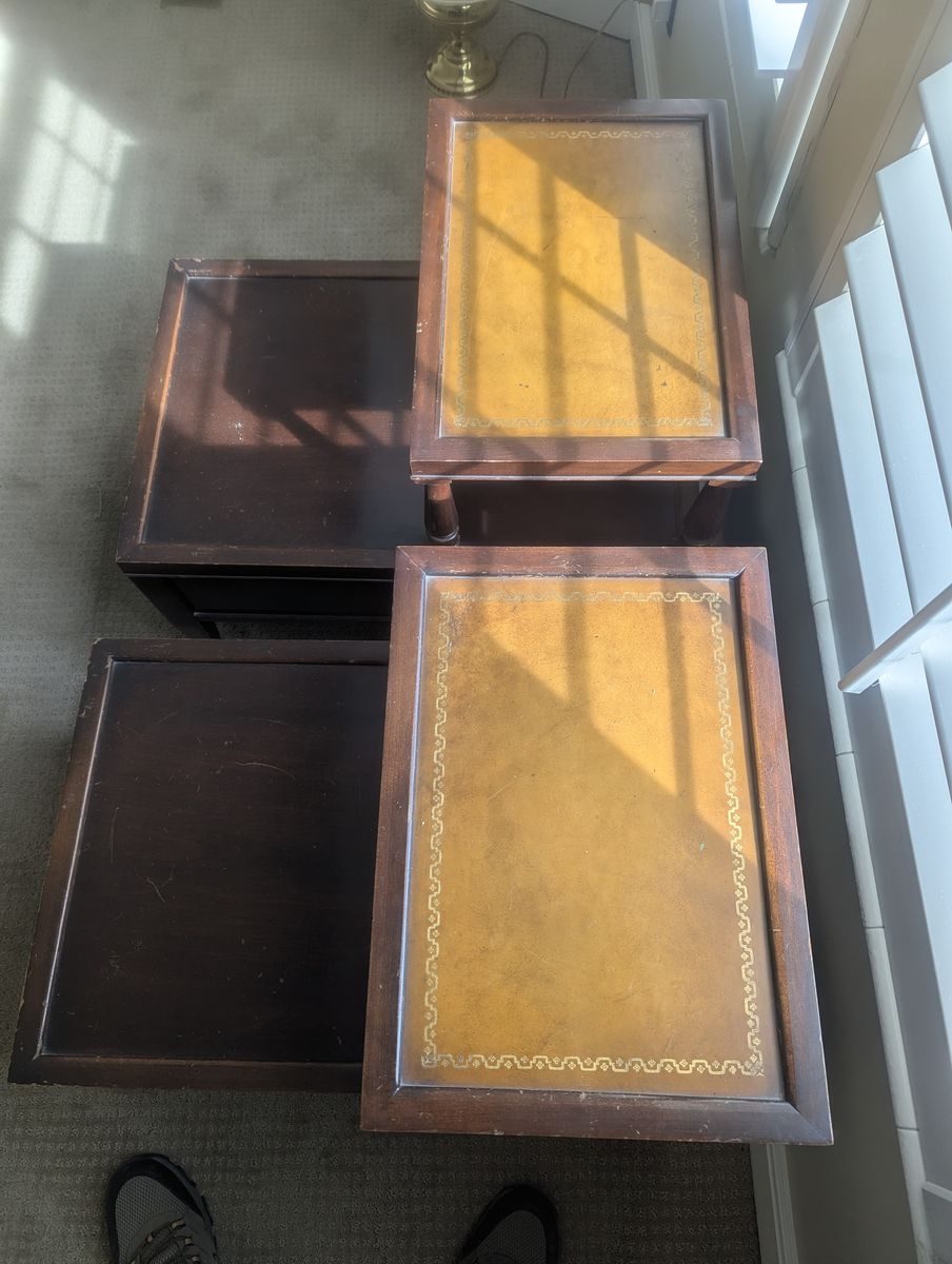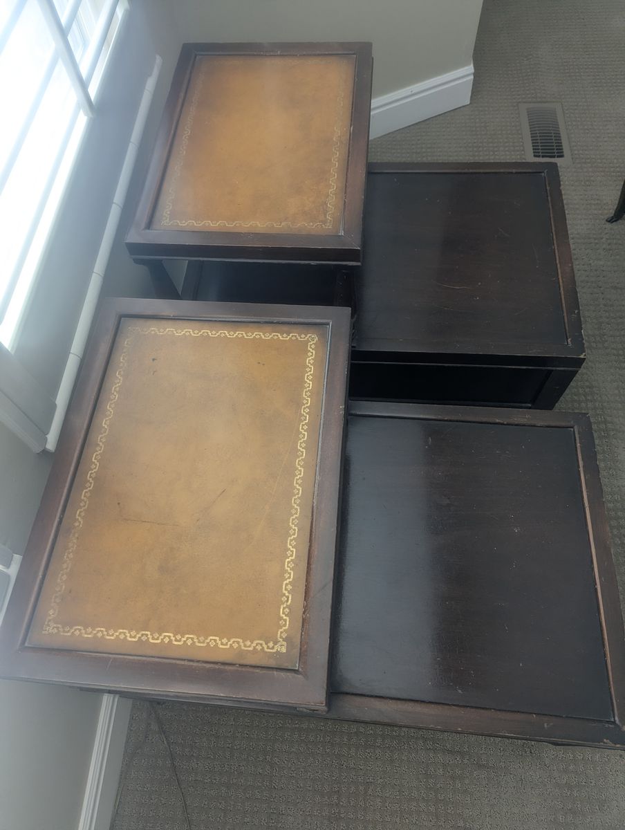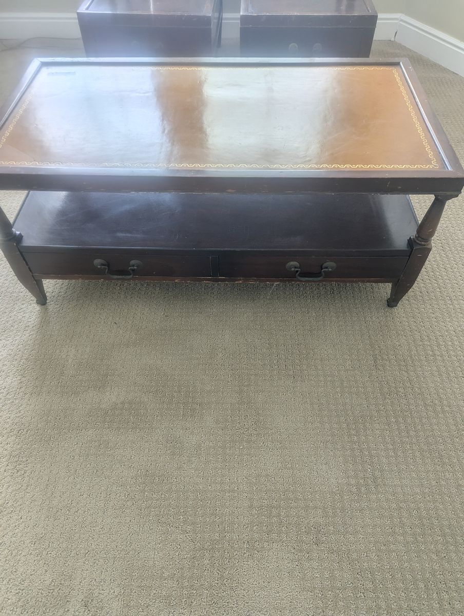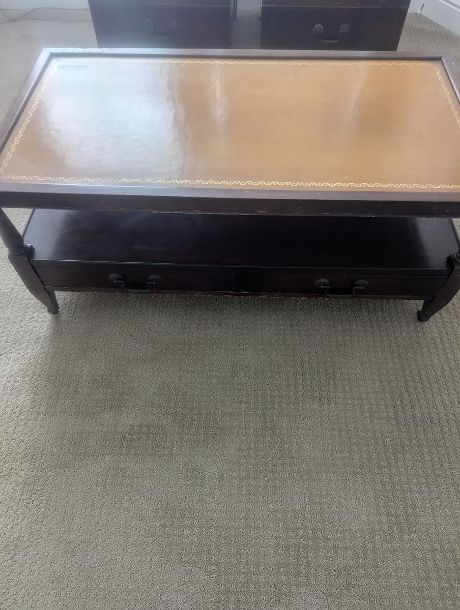 VenmoAntique 1950's vintage coffee table and end tables featureing a brown leather inlay top, mahogany wood finish, and decorative gold inlays.