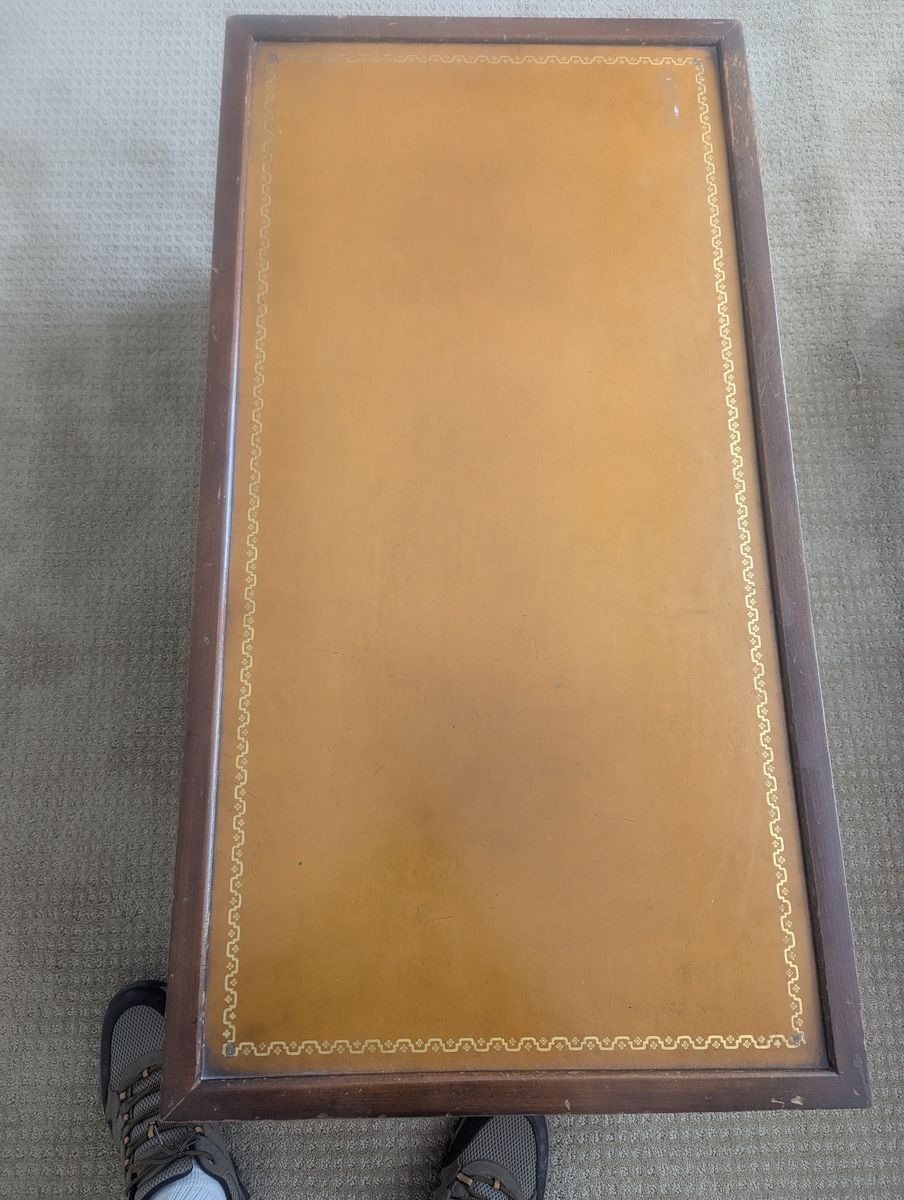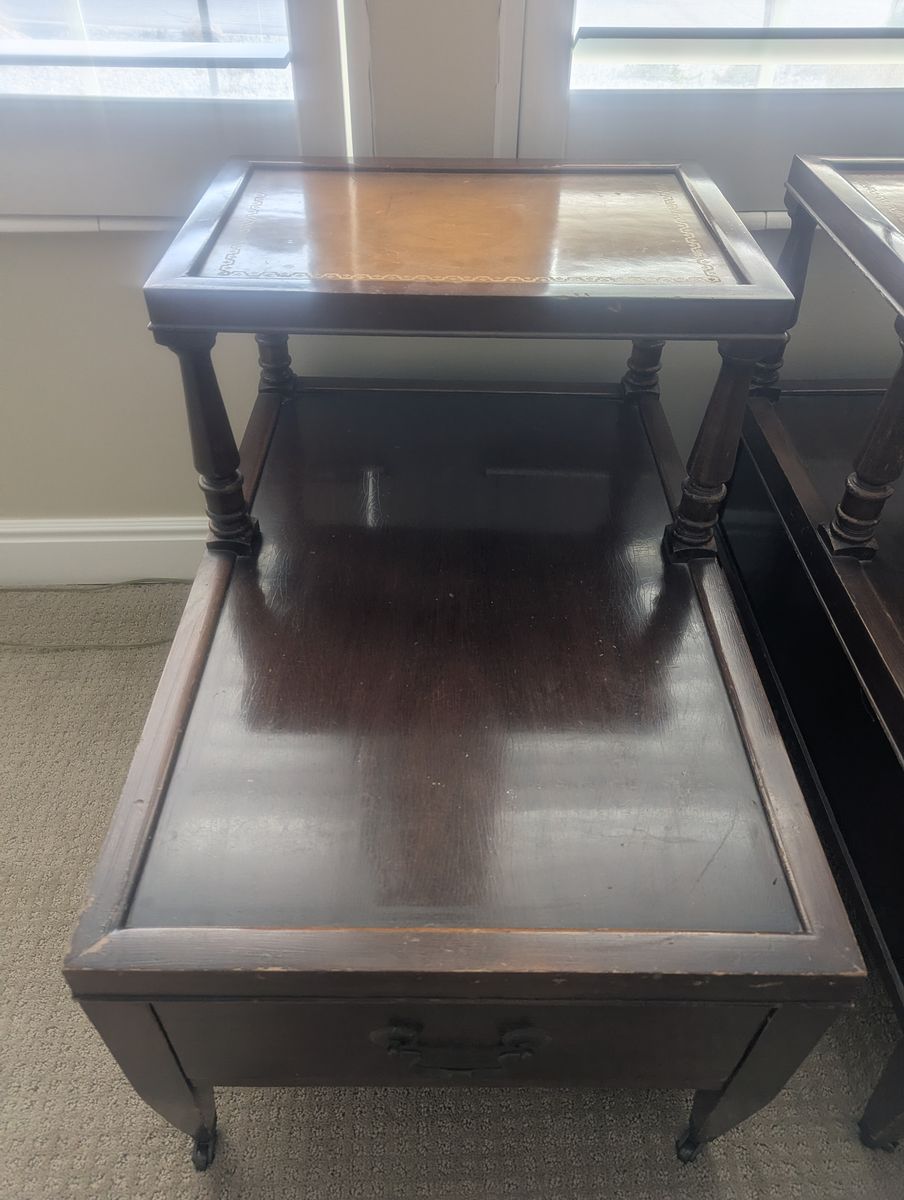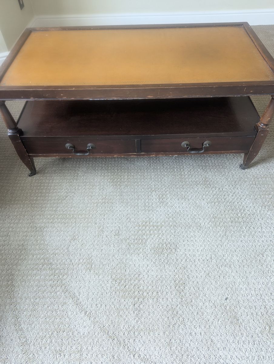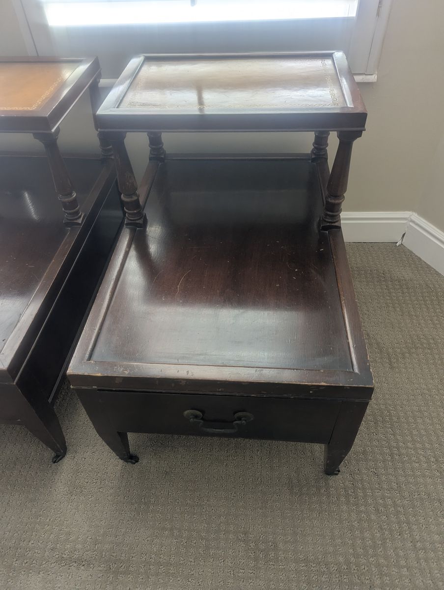 VenmoAntique 1950's vintage coffee table and end tables featureing a brown leather inlay top, mahogany wood finish, and decorative gold inlays.