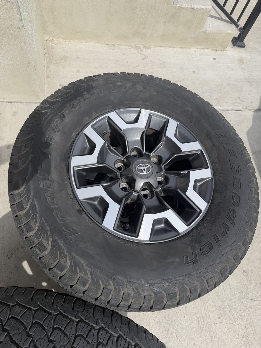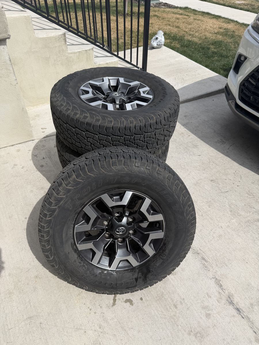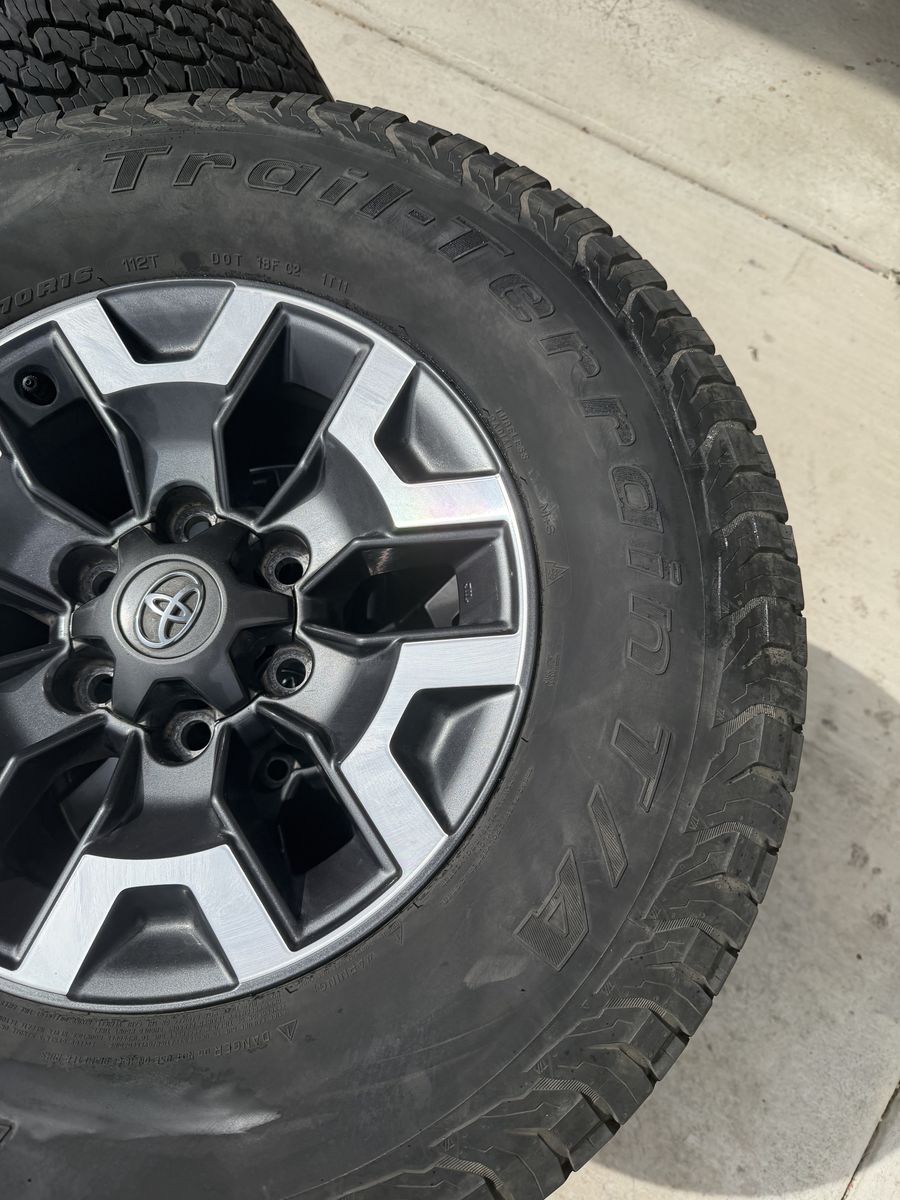 VenmoSet of 4-Toyota Tacoma Rims and Tires 265/70R16 Bfgoodrich Trail Terrain like new in excellent condition asking,asking $1000 Tires are like new Rims are in excellent condition no scratches or curb rash I can sell the rims or tires separately Bolt pattern 6-5.5 or 6-139.7 Text anytime 385-402-2292