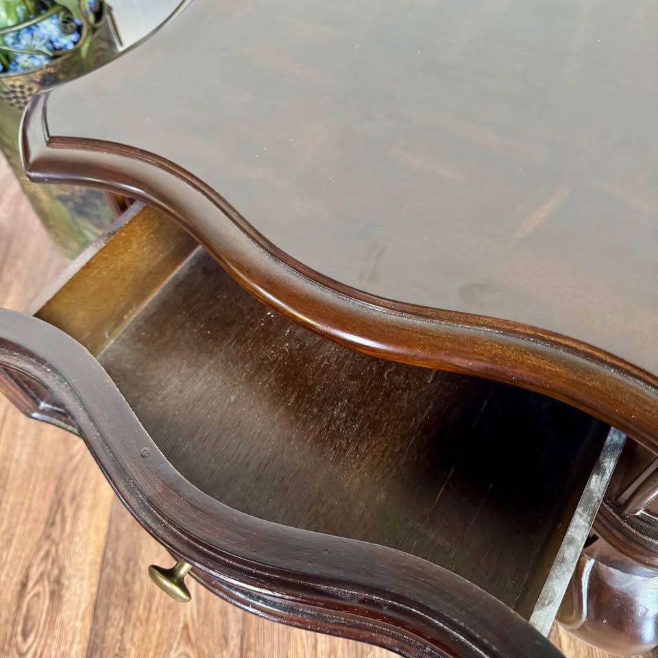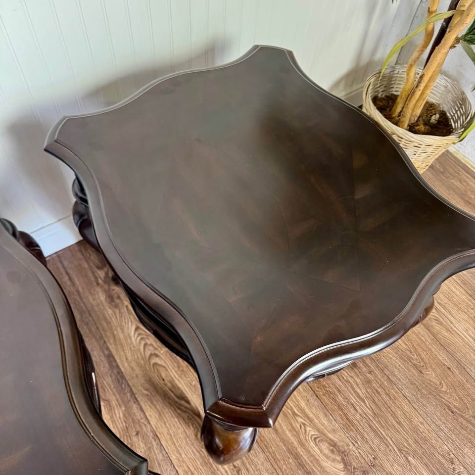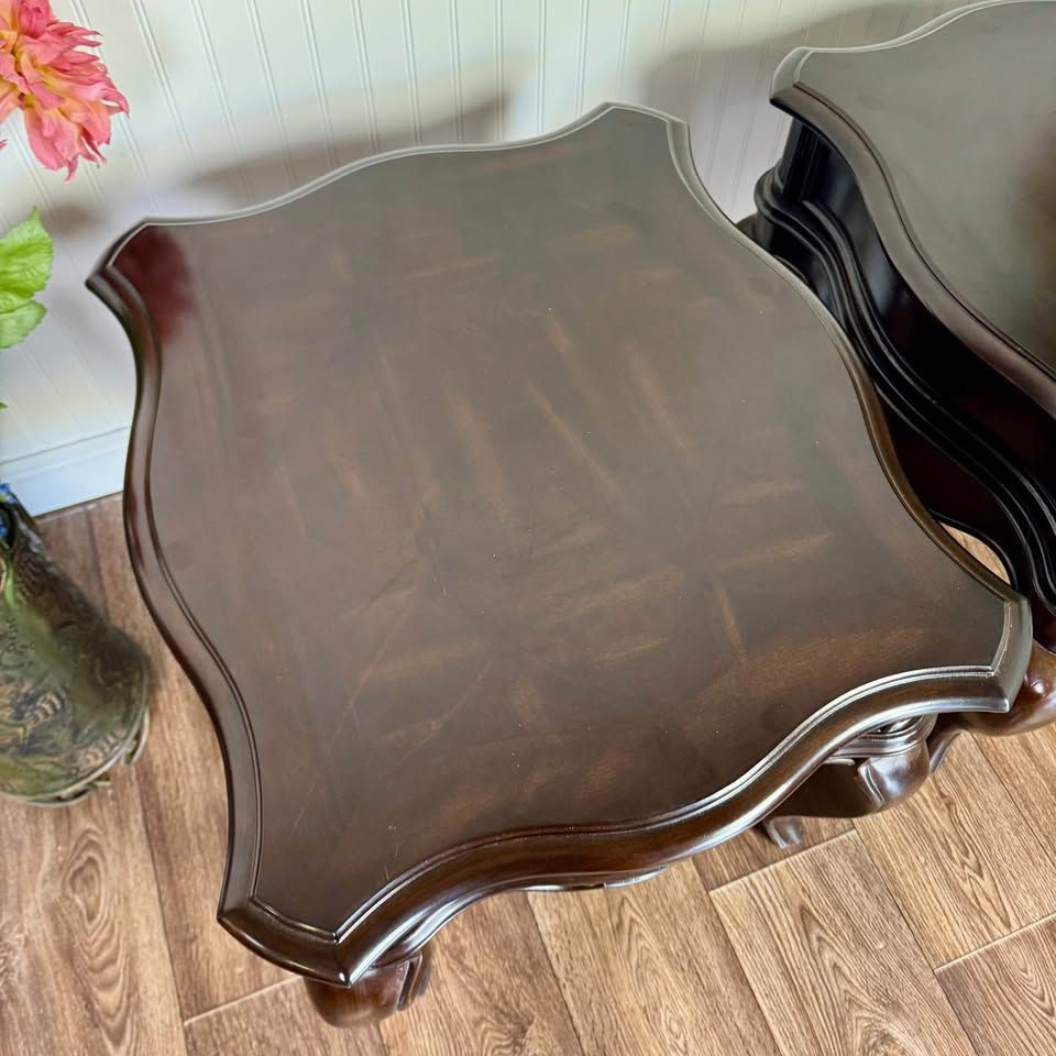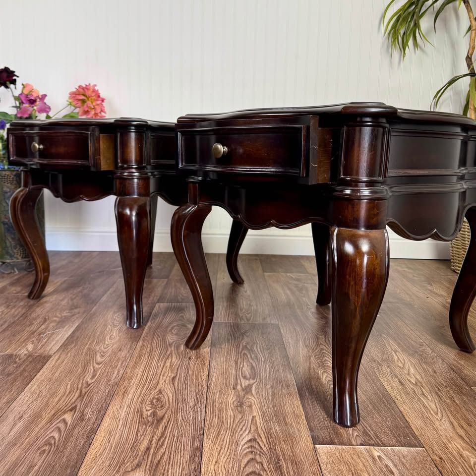 VenmoHigh-quality vintage set of side tables or nightstands featuring elegant cabriole legs, serpentine-scalloped aprons, and drawers for stature. The tops have a unique diamond-patterned wood inlay.