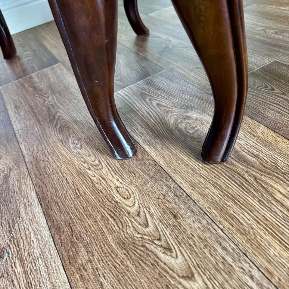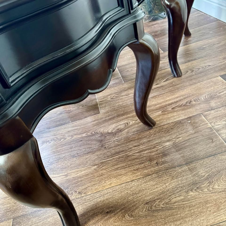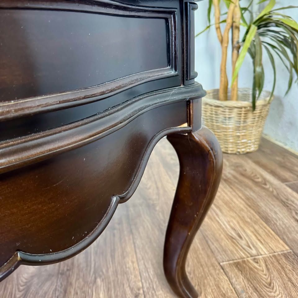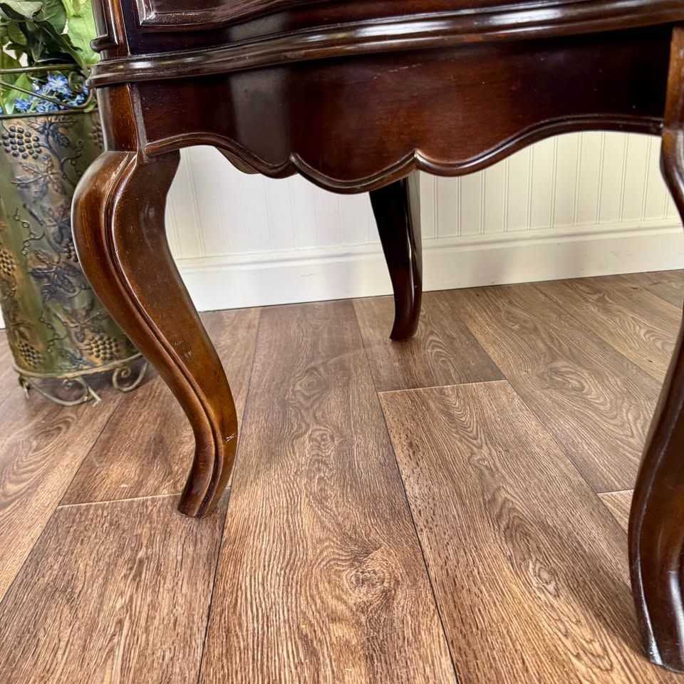VenmoHigh-quality vintage set of side tables or nightstands featuring elegant cabriole legs, serpentine-scalloped aprons, and drawers for stature. The tops have a unique diamond-patterned wood inlay.