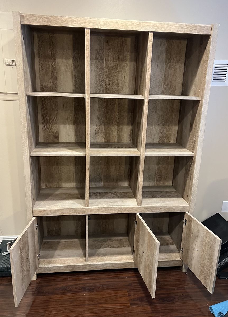 VenmoThis solid wood cabinet is in great condition! It has 3 easy open and close doors, very smooth and is great for multi-purpose storage. 6 adjustable open shelves (individul pieces to be configured how ever you would like!) Measures ~72" High ~49" Wide ~16" Deep