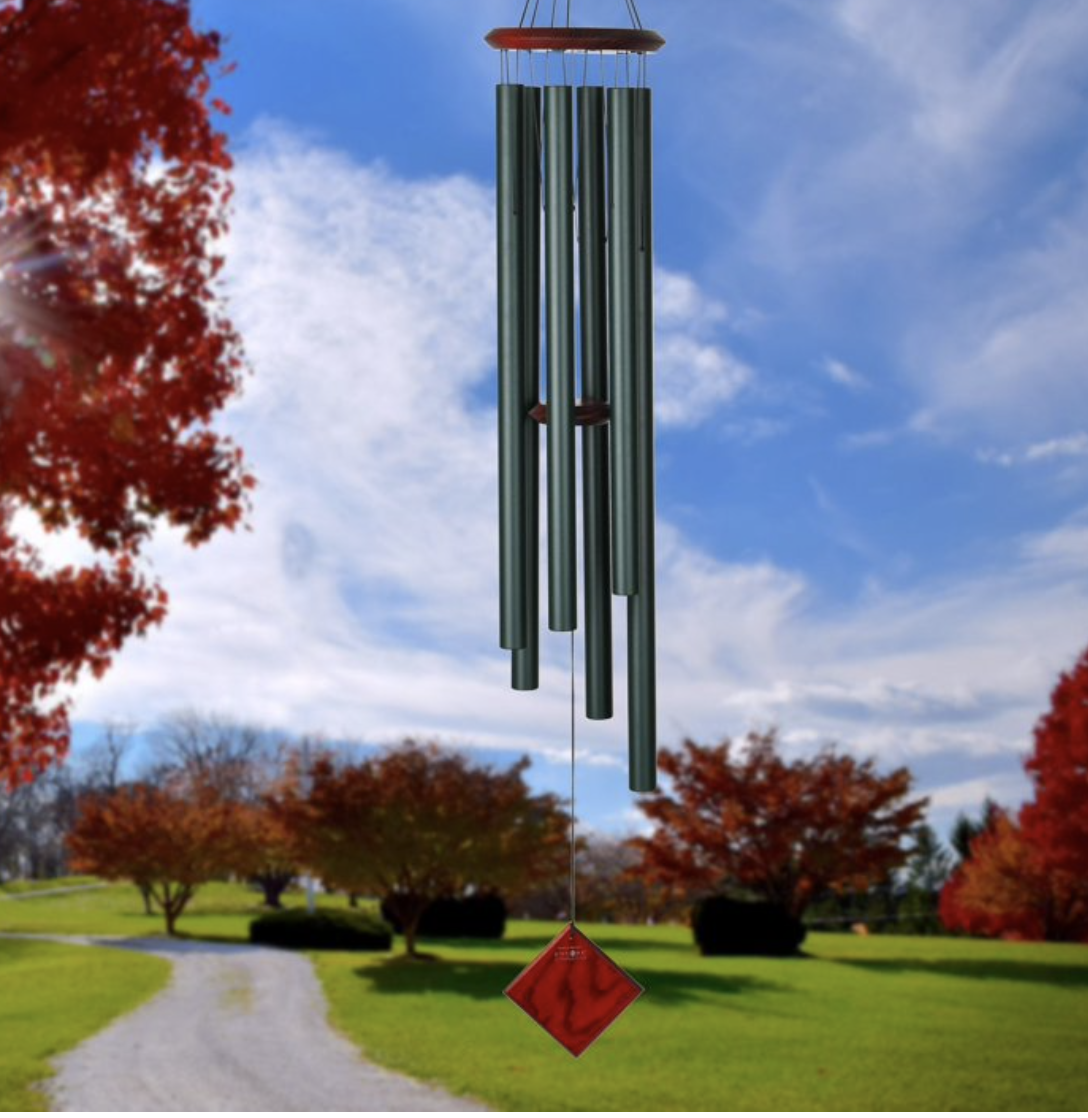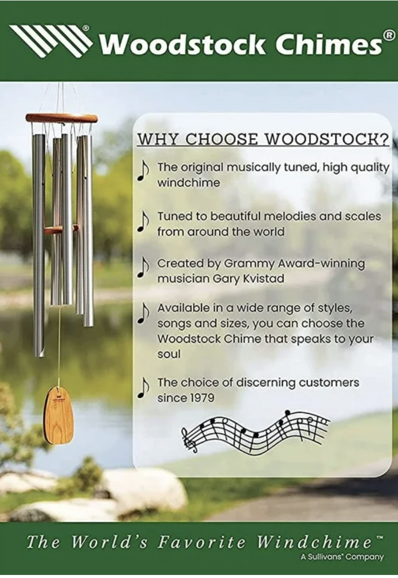 .This wind chime is designed and handcrafted for superior musical performance. It is hand-tuned to a universal, pentatonic (five-note) scale and acts in concert with the wind to create random patterns of wonderful sound. Harmonizes beautifully with all the other Encore Collection windchimes.Removable windcatcher for easy customization.This chime carries a lifetime tuning guarantee.WOODSTOCK CHIMES THE ORIGINAL MUSICALLY TUNED WIND CHIMES. Tuned to beautiful melodies and scales from around the world and available in a wide range of styles, songs and sizes, you can choose the Woodstock Chime that speaks to your soul. HOW IT ALL BEGAN. In 1979, the first Woodstock Chime was created by GRAMMY® Award-winning musician Garry Kvistad from an aluminum lawn chair he found in a landfill. As a professional musician and instrument designer, he was fascinated by the Scales of Olympus, a 7th century pentatonic scale that can't be played on a modern piano. Garry had the idea to cut and tune the lawn chair chime tubes to the exact frequency of the ancient scale.