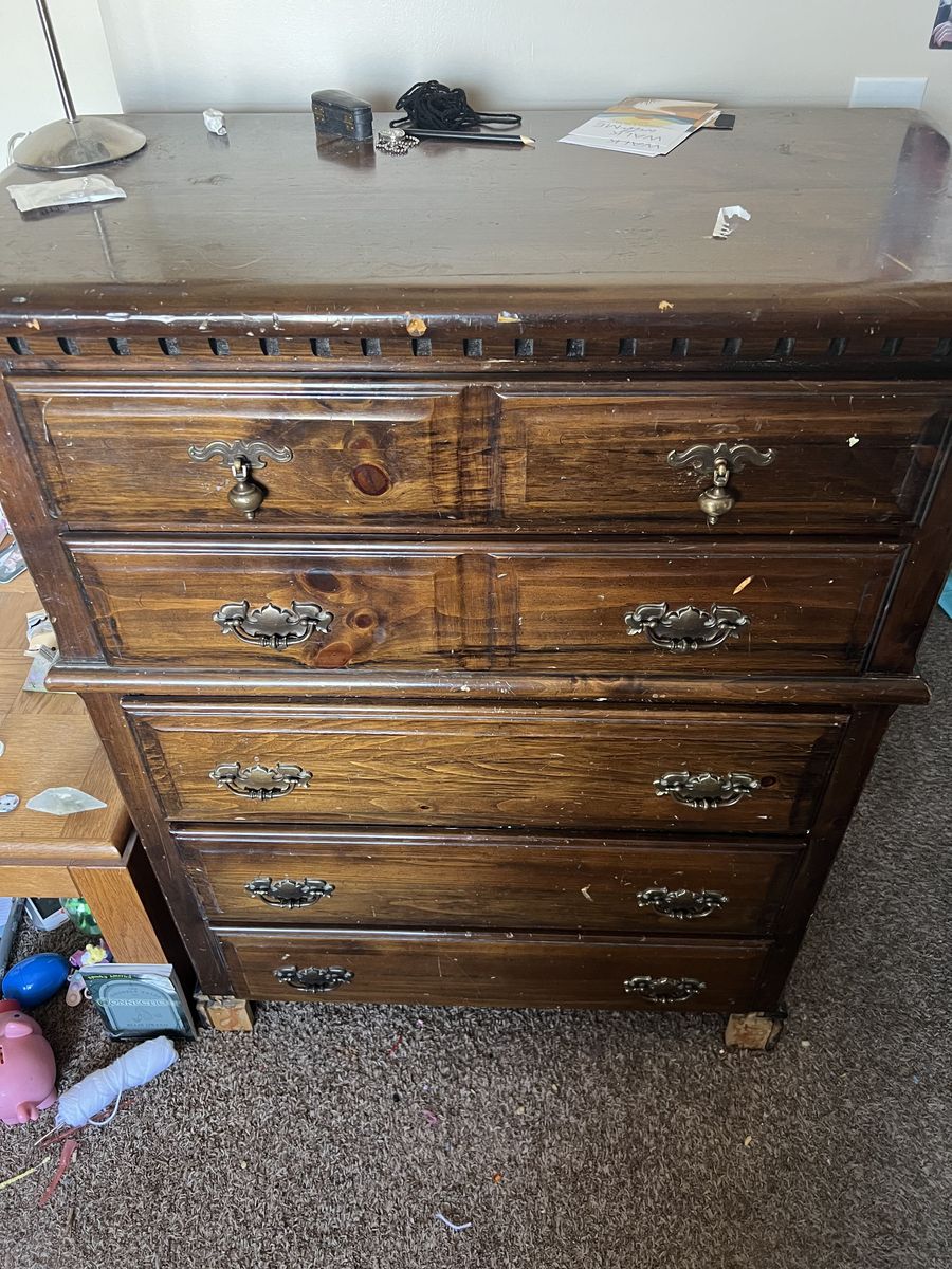 VenmoThis dresser is solid. Like heavy, well built. It has been well loved. It is a little beat up and has been through a few kids! If you can't tell!! It has scratches and is missing the front kick plate. But has lots of life still in it! The drawers are clean and pretty easy to open. Measures ~47" High ~37" Wide 19" Deep