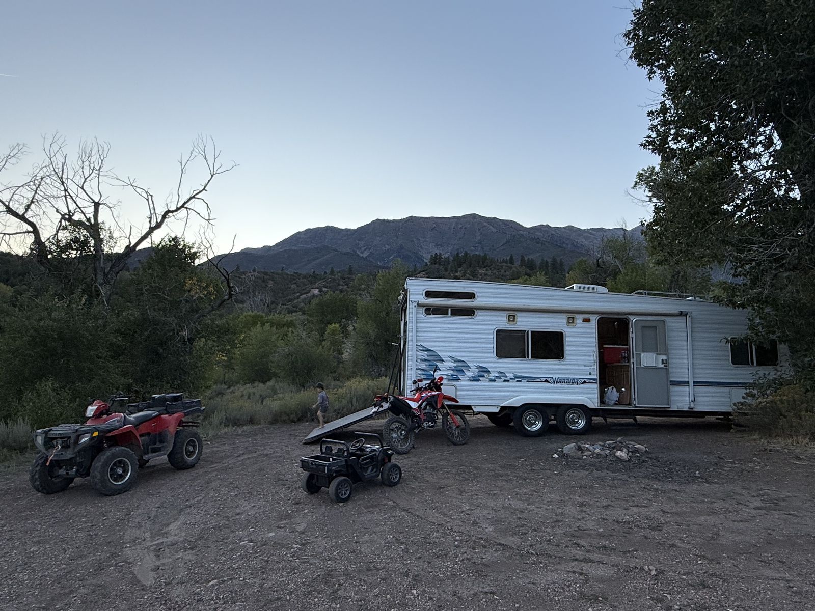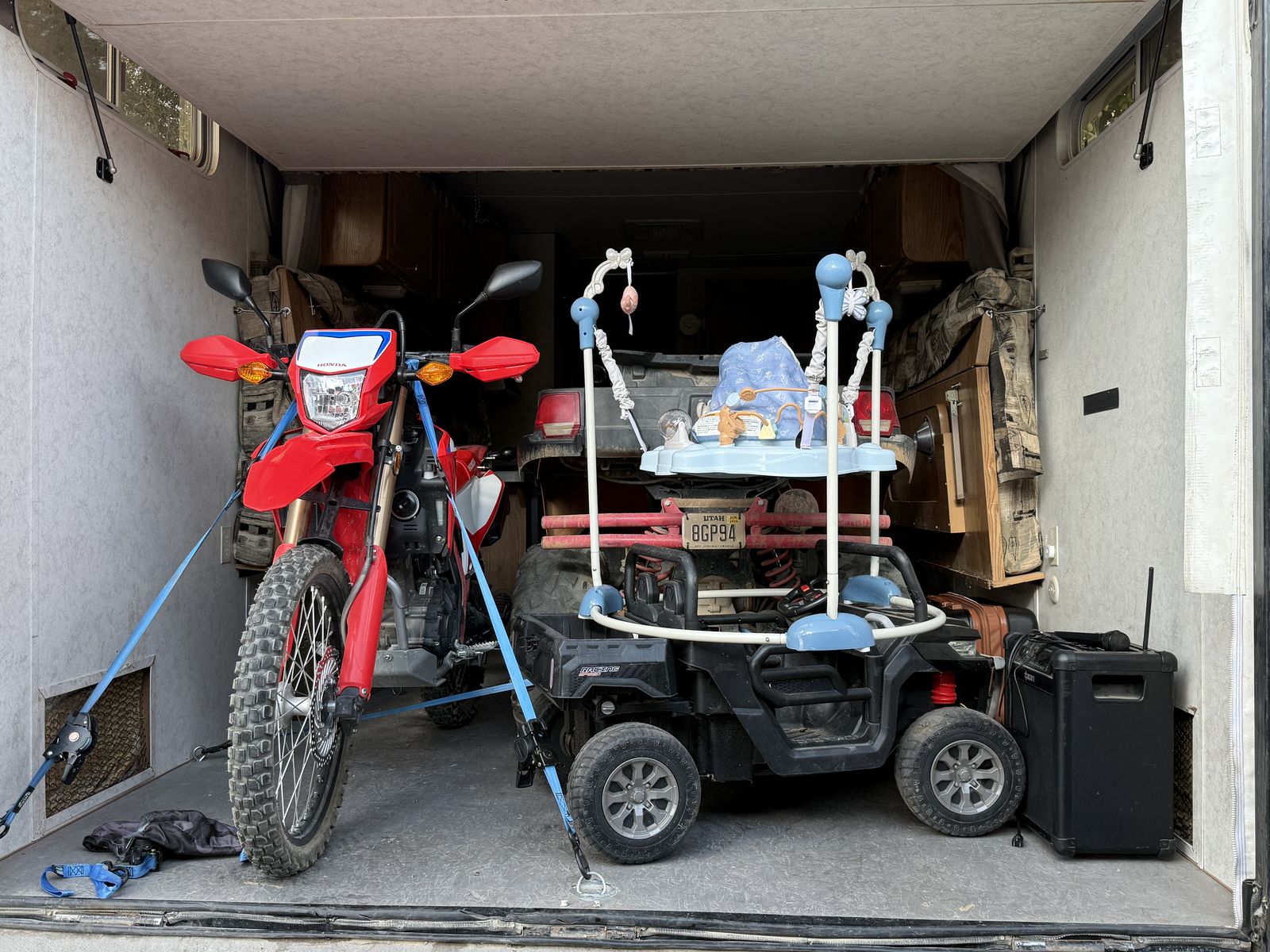 Length: 27 feet long and 8 feet wide. Weight: The dry weight (empty weight) is approximately 5,850 Ibs. Cargo Capacity: The trailer has a cargo carrying capacity (CCC) of around 4,000 lbs. Sleeping: It can typically sleep 6-8 people with a front queen bed, two sofas that convert to beds, and a rear bed that can be raised and lowered manually. Water Capacity: Includes a 100-gallon fresh water tank. Waste Water Capacity: Has a 40-gallon black tank and a 40-gallon gray tank. Fuel Station: Equipped with a 30-gallon fuel station for toys, (pump doesn't work) Generator: Onan 5500 onboard generator. Other Amenities: 3-burner stove, oven, refrigerator/freezer and a bathroom sink and toilet, heater and A/C. Tires have a little over 1000 miles on them. We’ve owned less than a year but previous owner had trailer for over ten years and took great care of it.