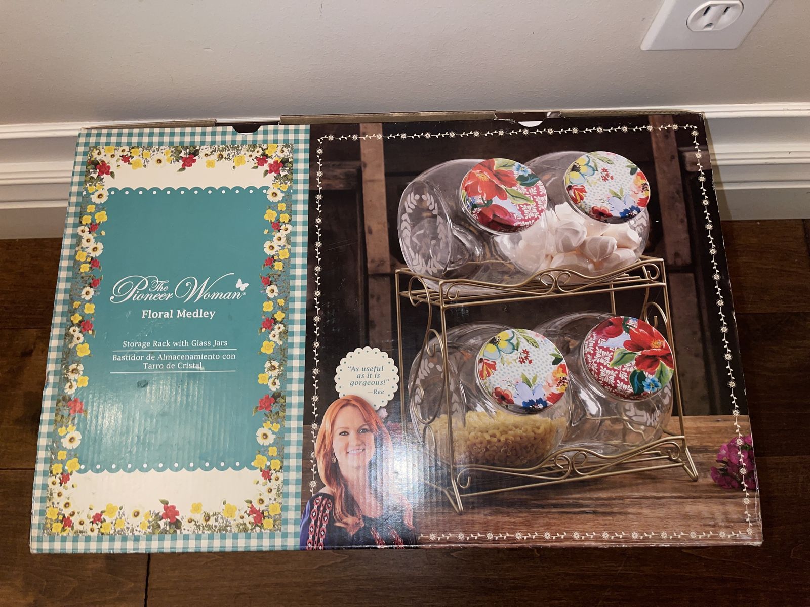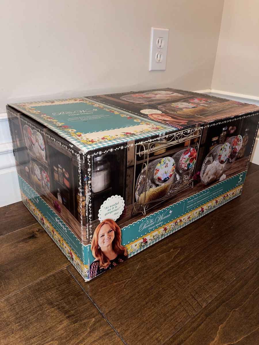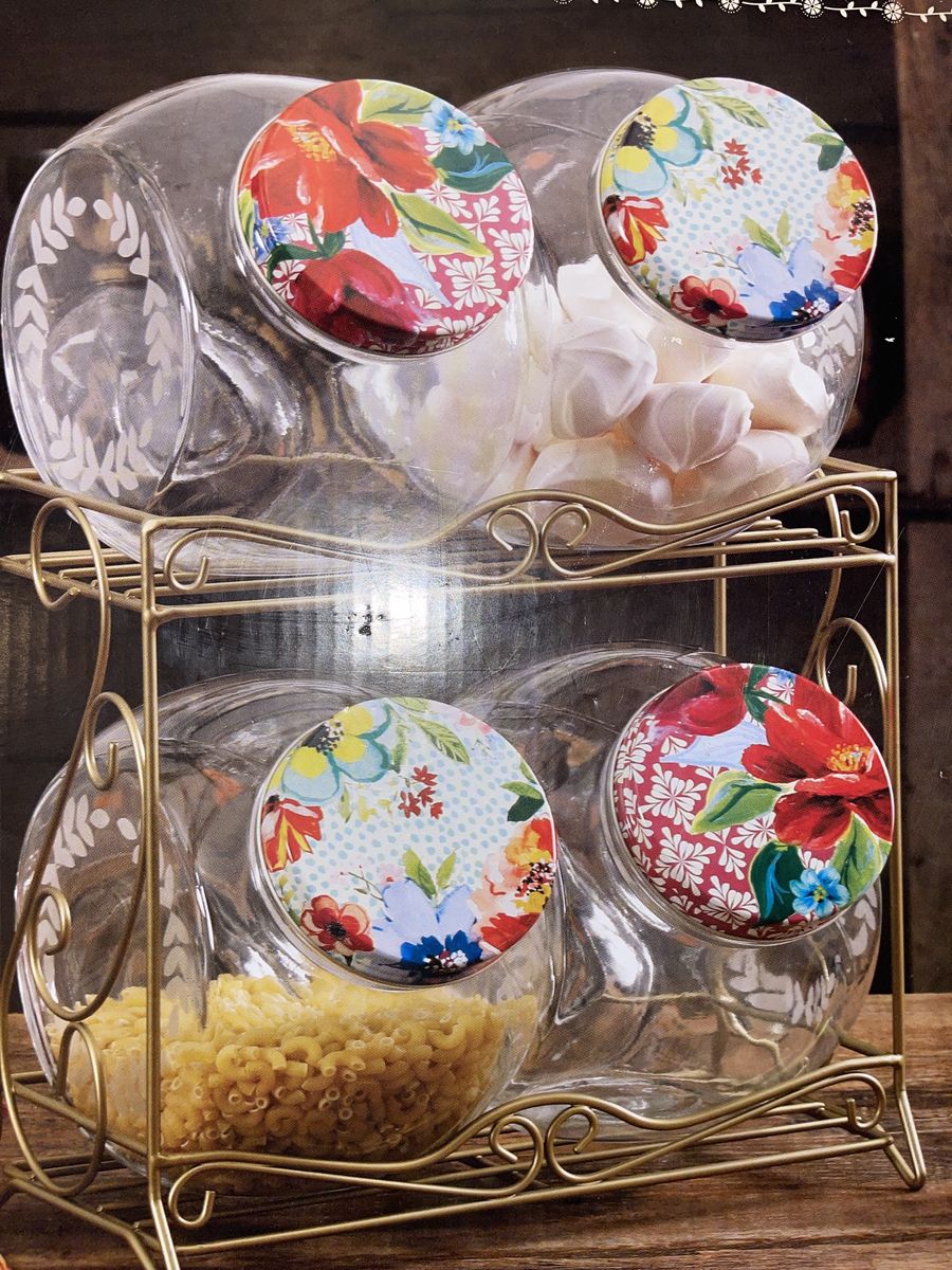 PayPalThis is a nice set of four glass jars and a storage rack. It’s in the floral medley design of Pioneer Woman brand. It’s in excellent condition! It comes with a bonus salt & pepper shaker, if you want them.