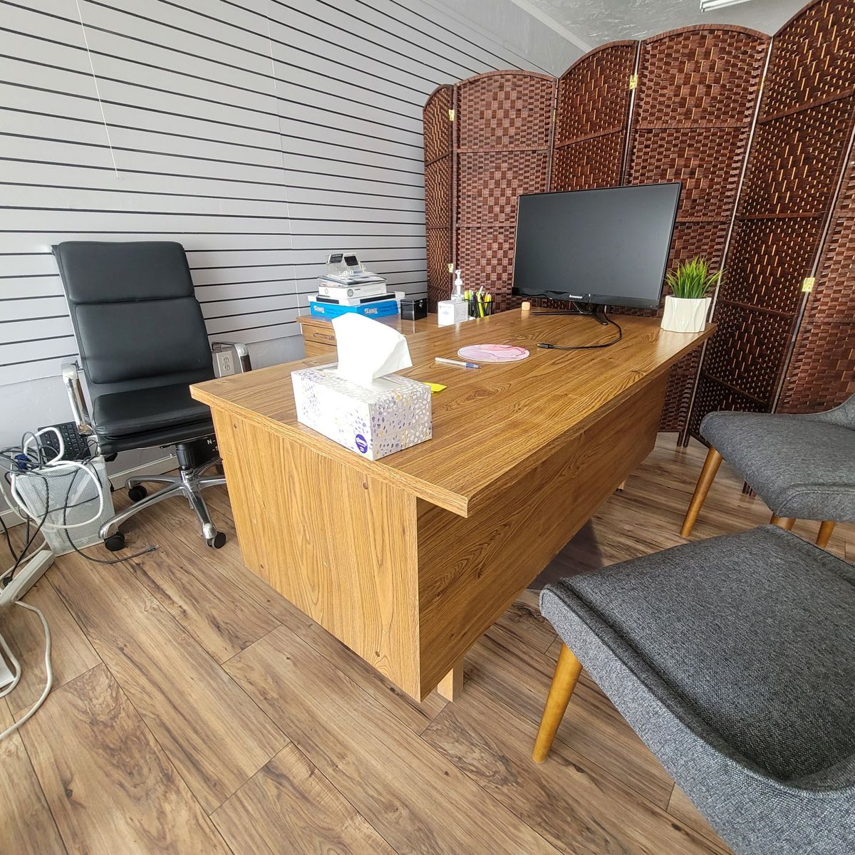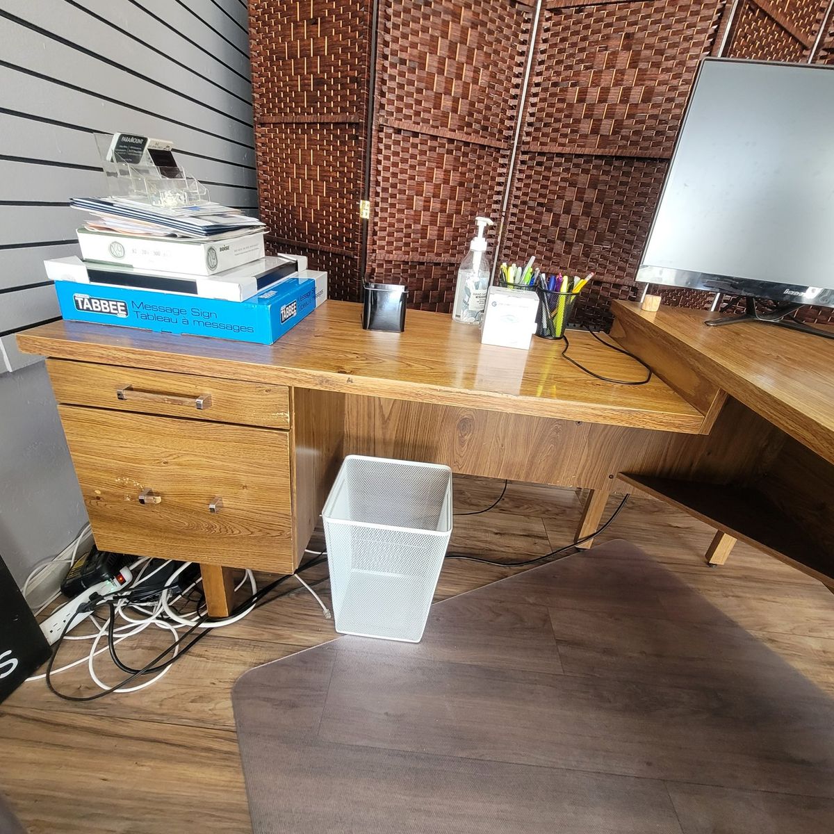 Original wood laminate finish in good condition and recently updated with new knobs. Great setup for a home office or workspace.
