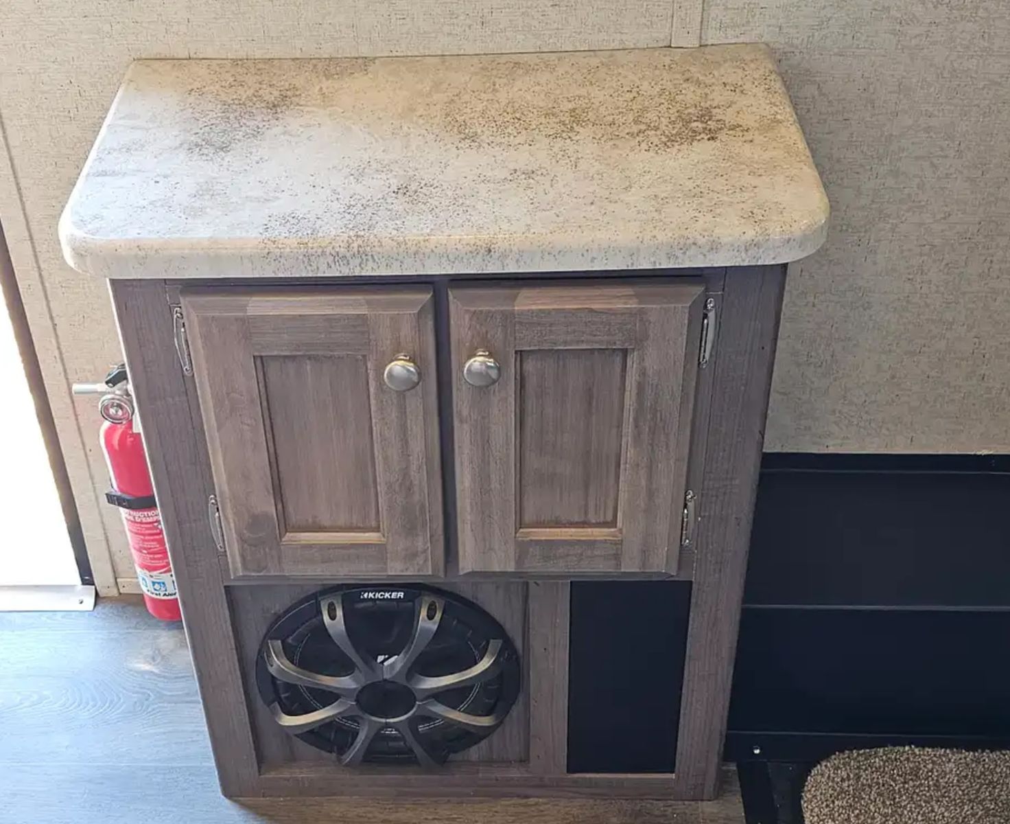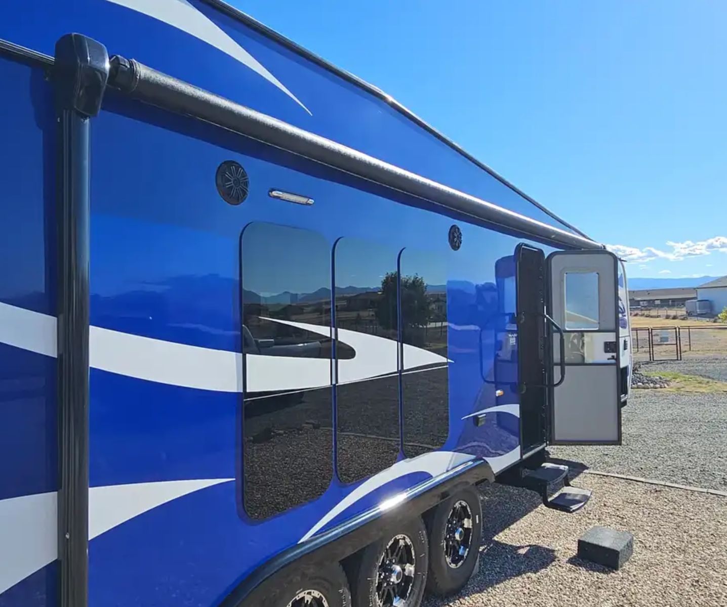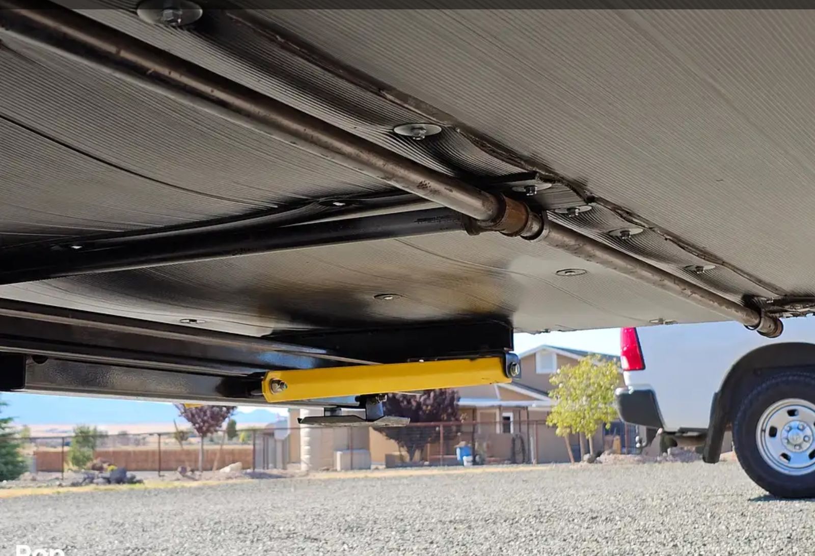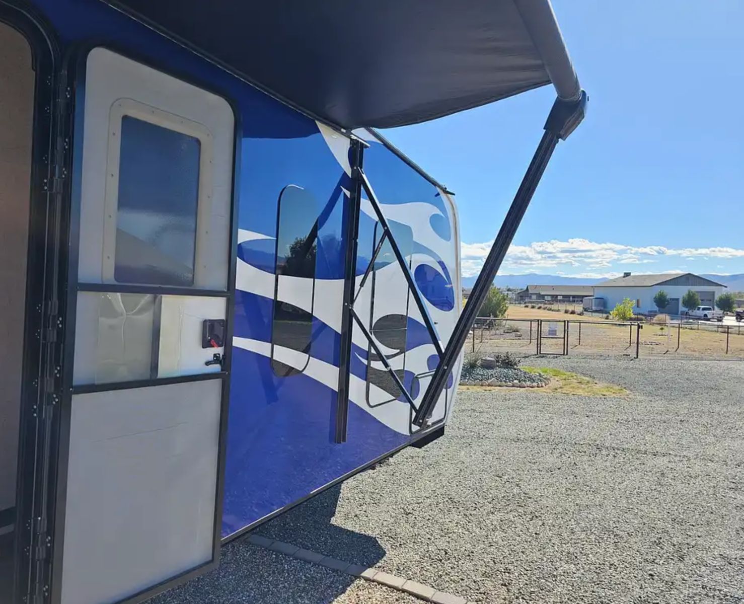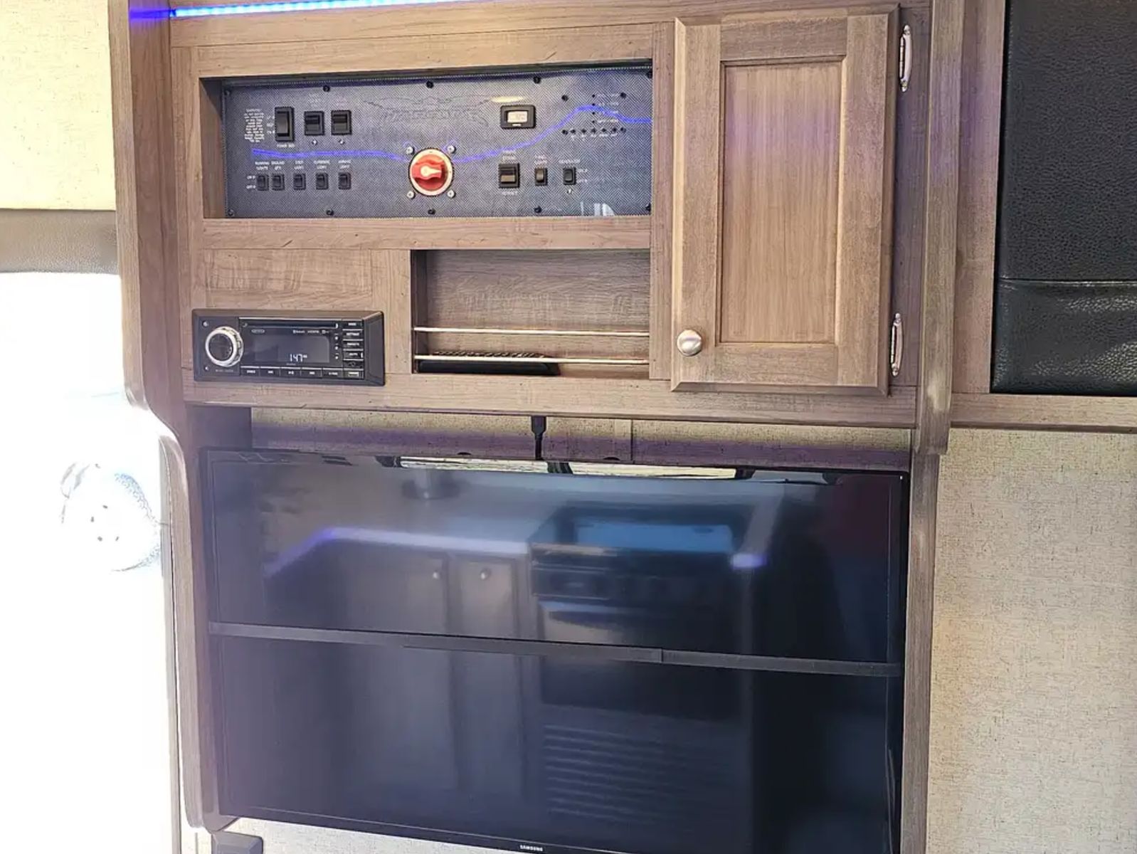 It is solar prepped, electric stabilizer jacks, 21' awning, Kicker sound system installed with amps and a subwoofer, backup camera, and electric jack.
