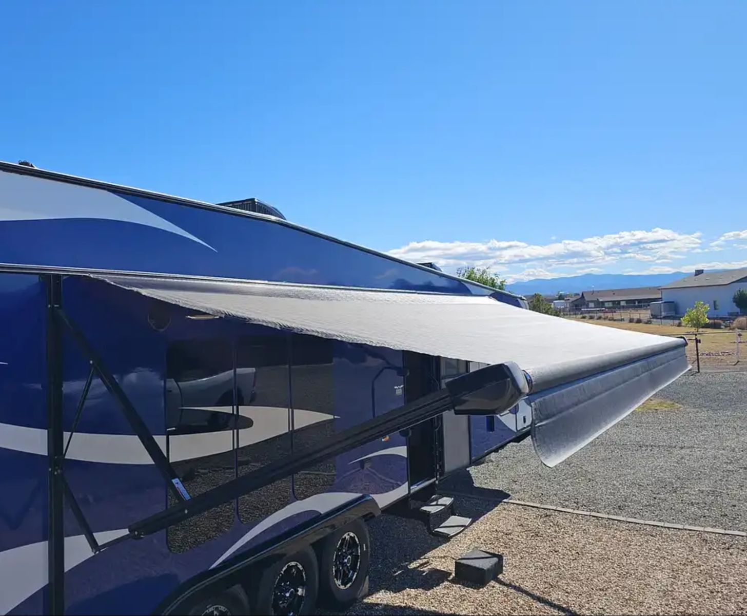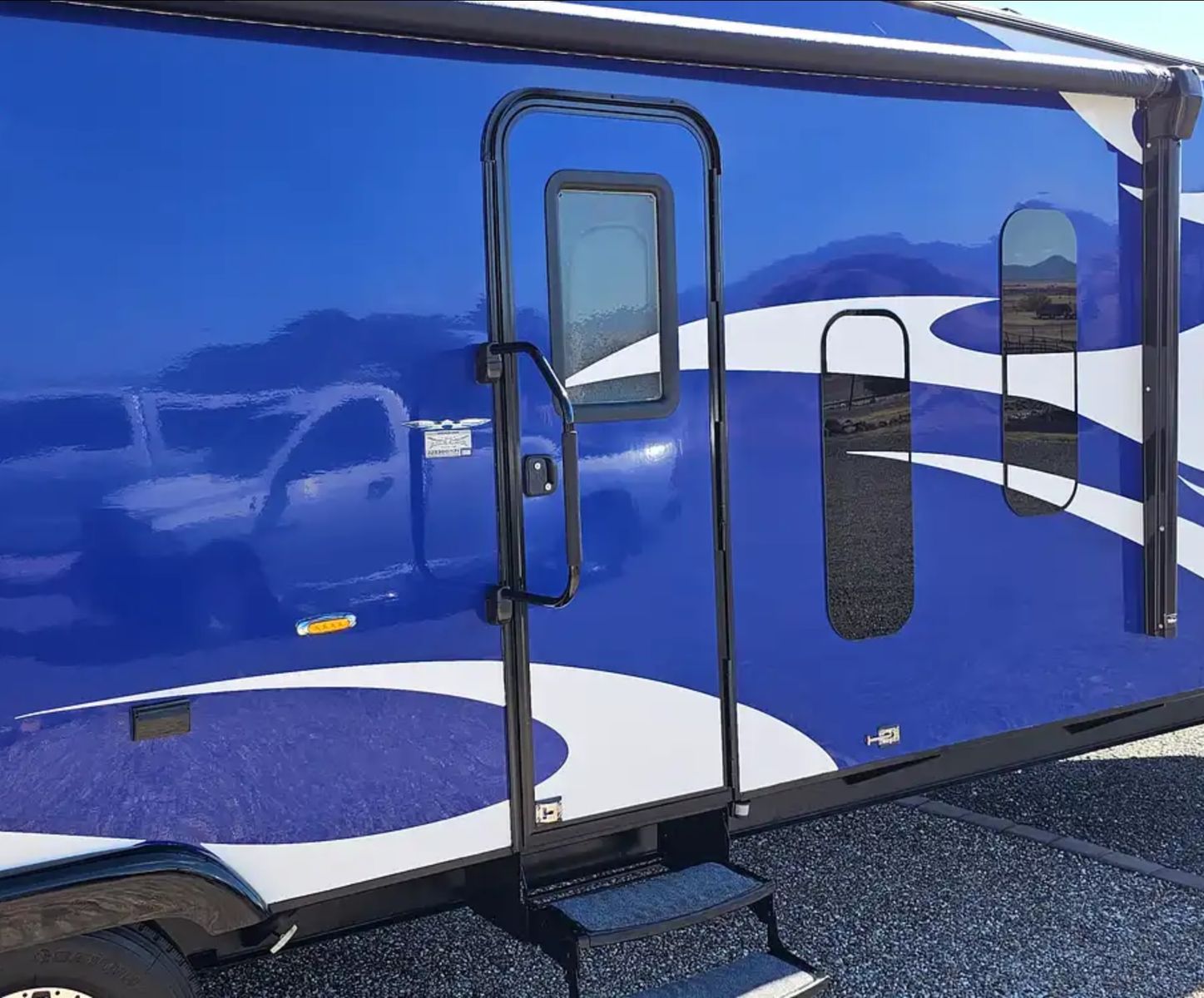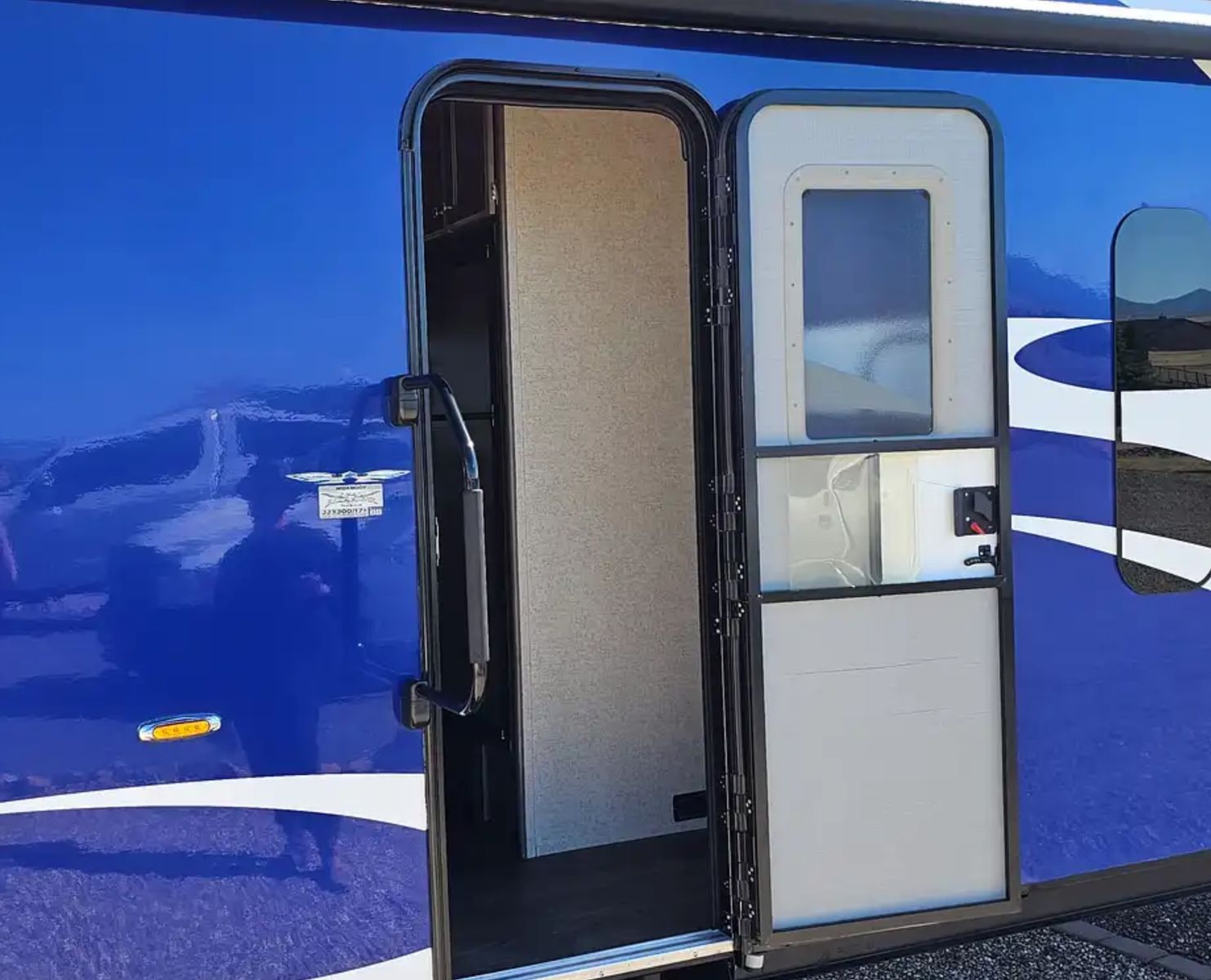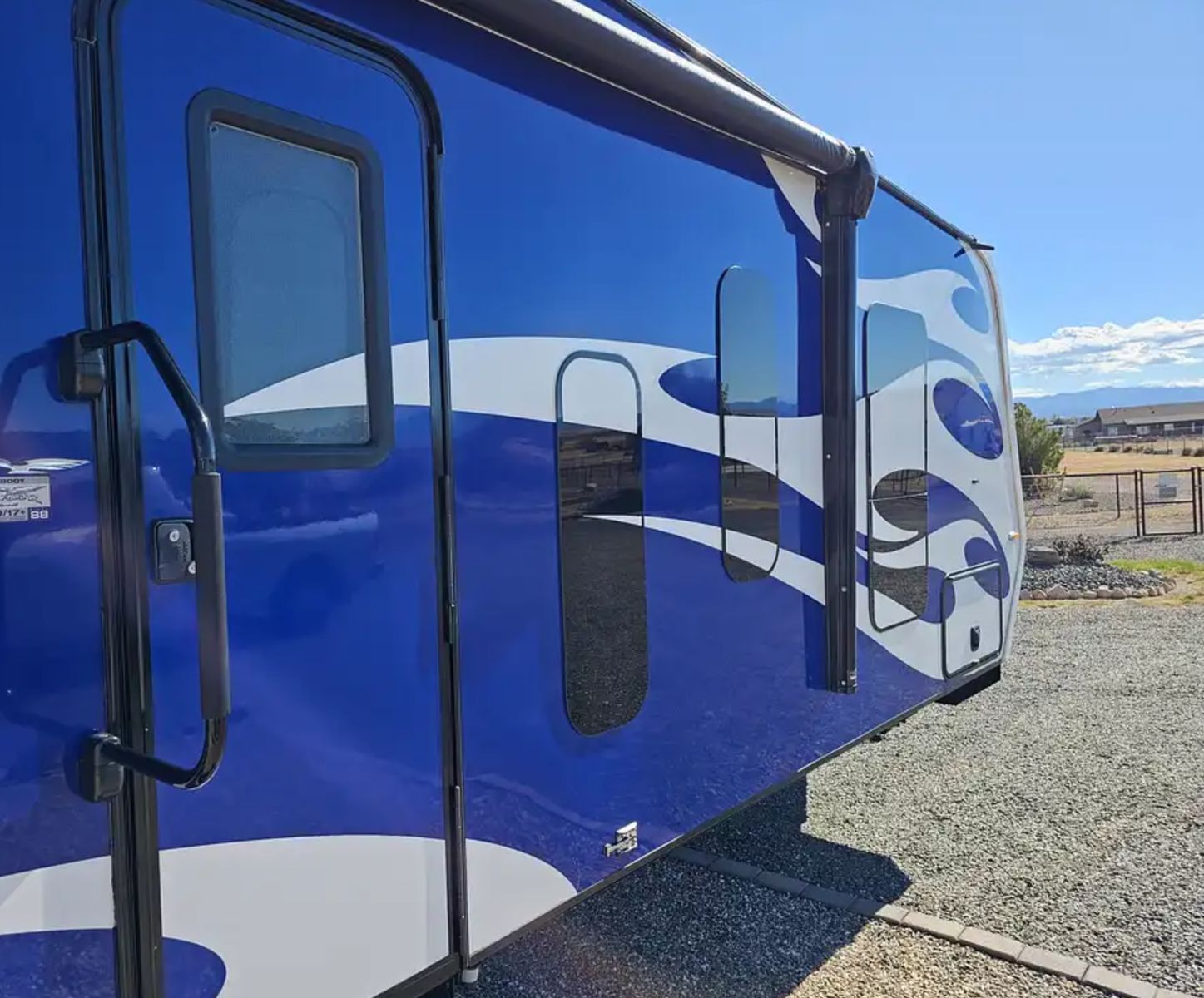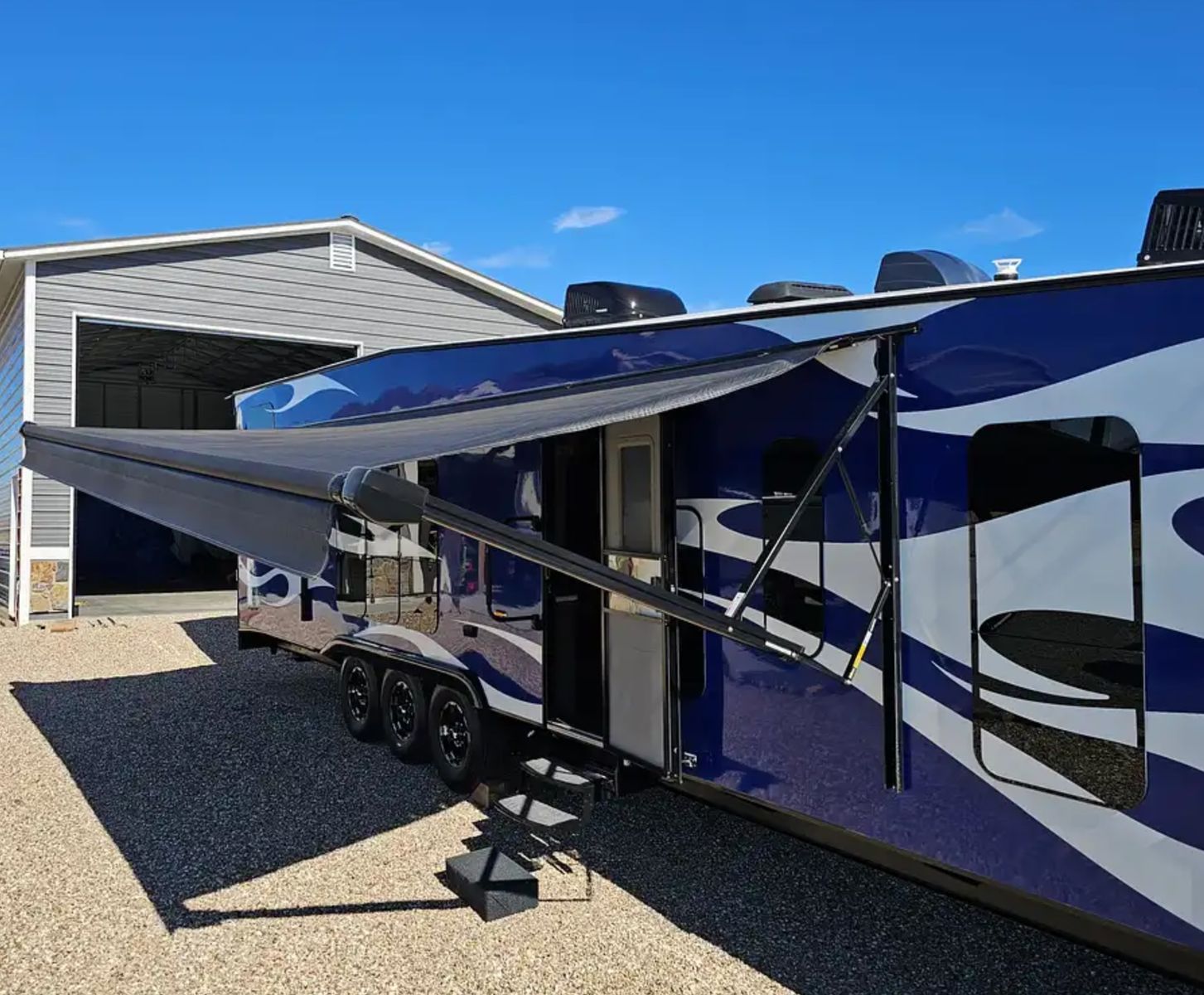 It is solar prepped, electric stabilizer jacks, 21' awning, Kicker sound system installed with amps and a subwoofer, backup camera, and electric jack.