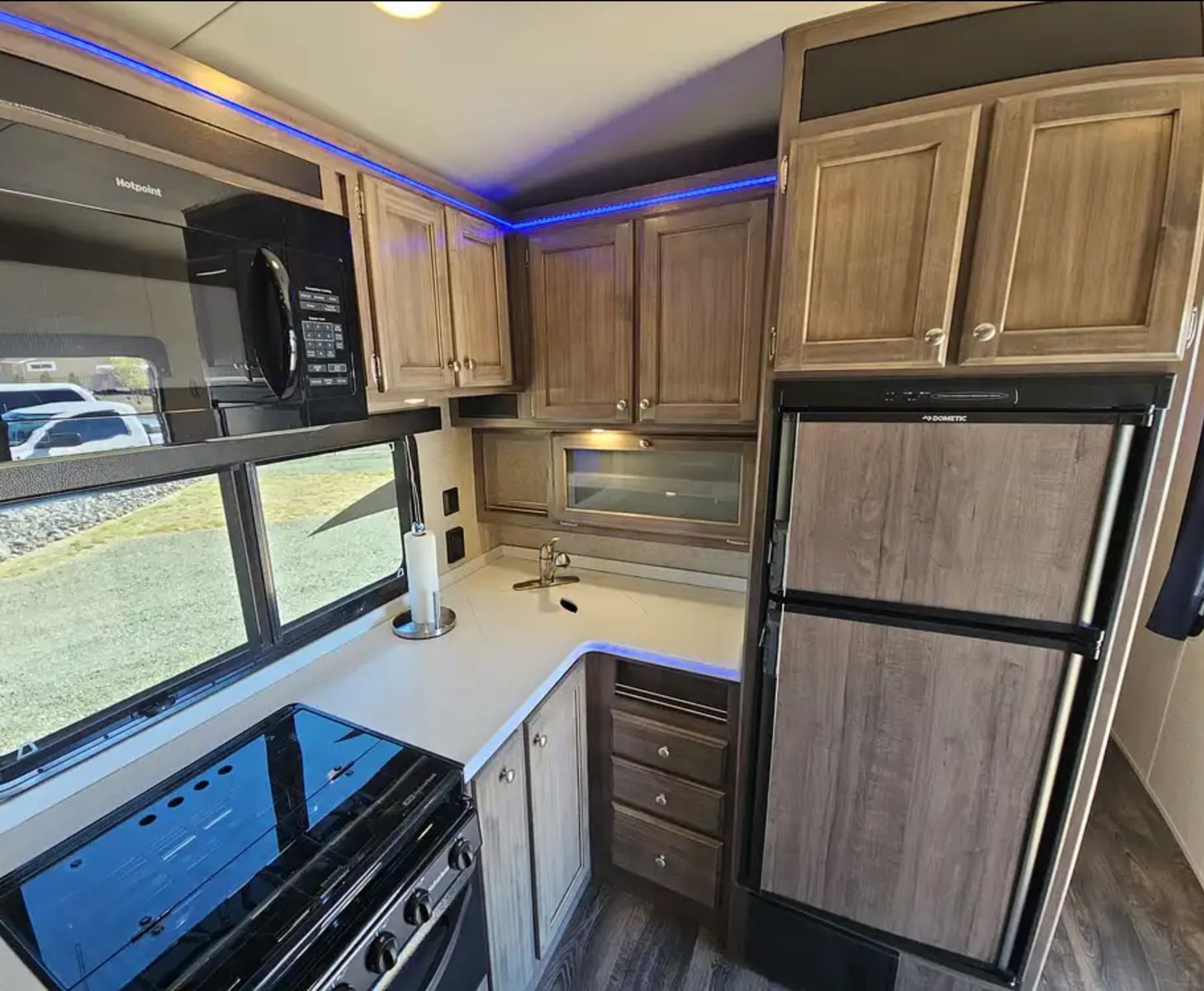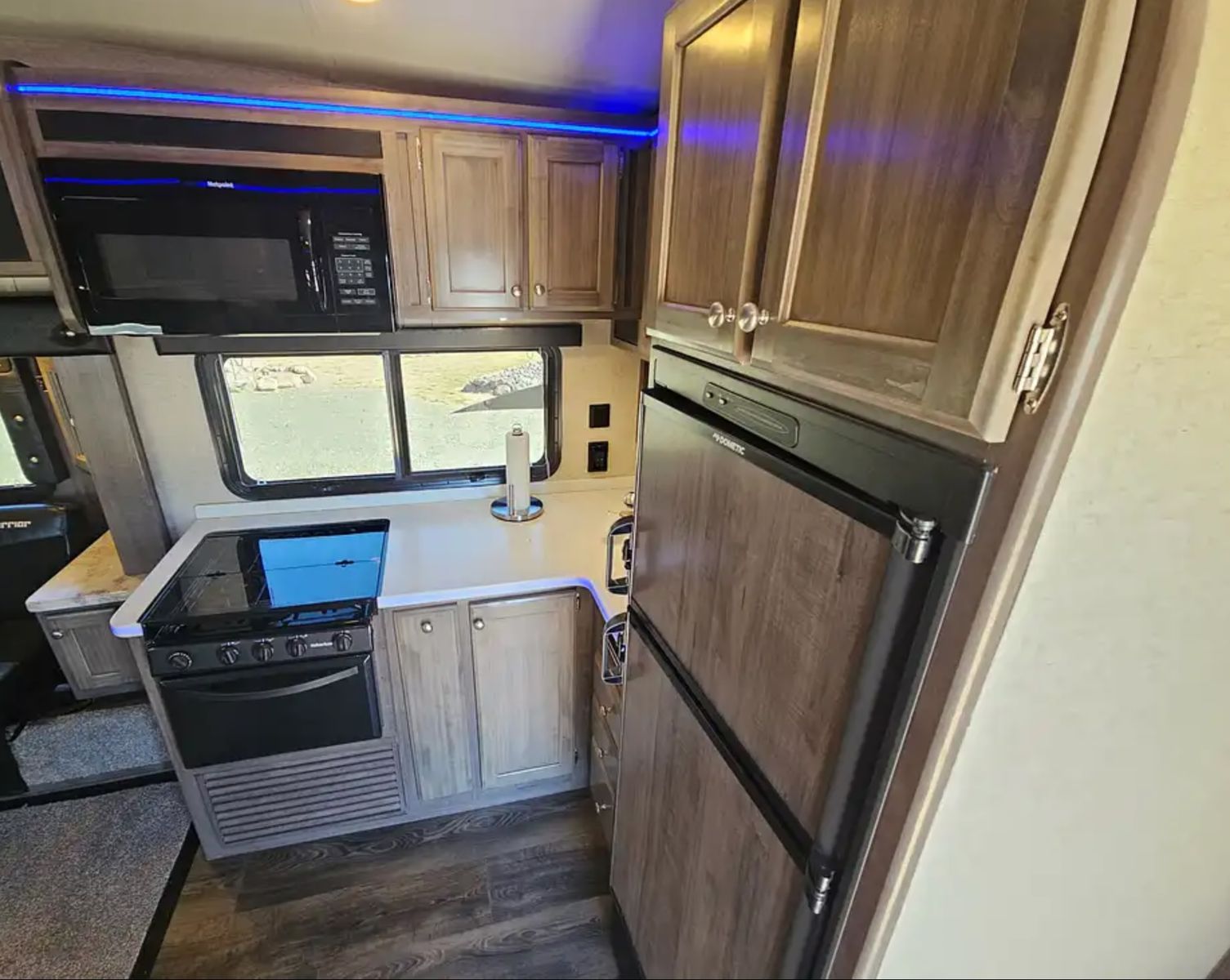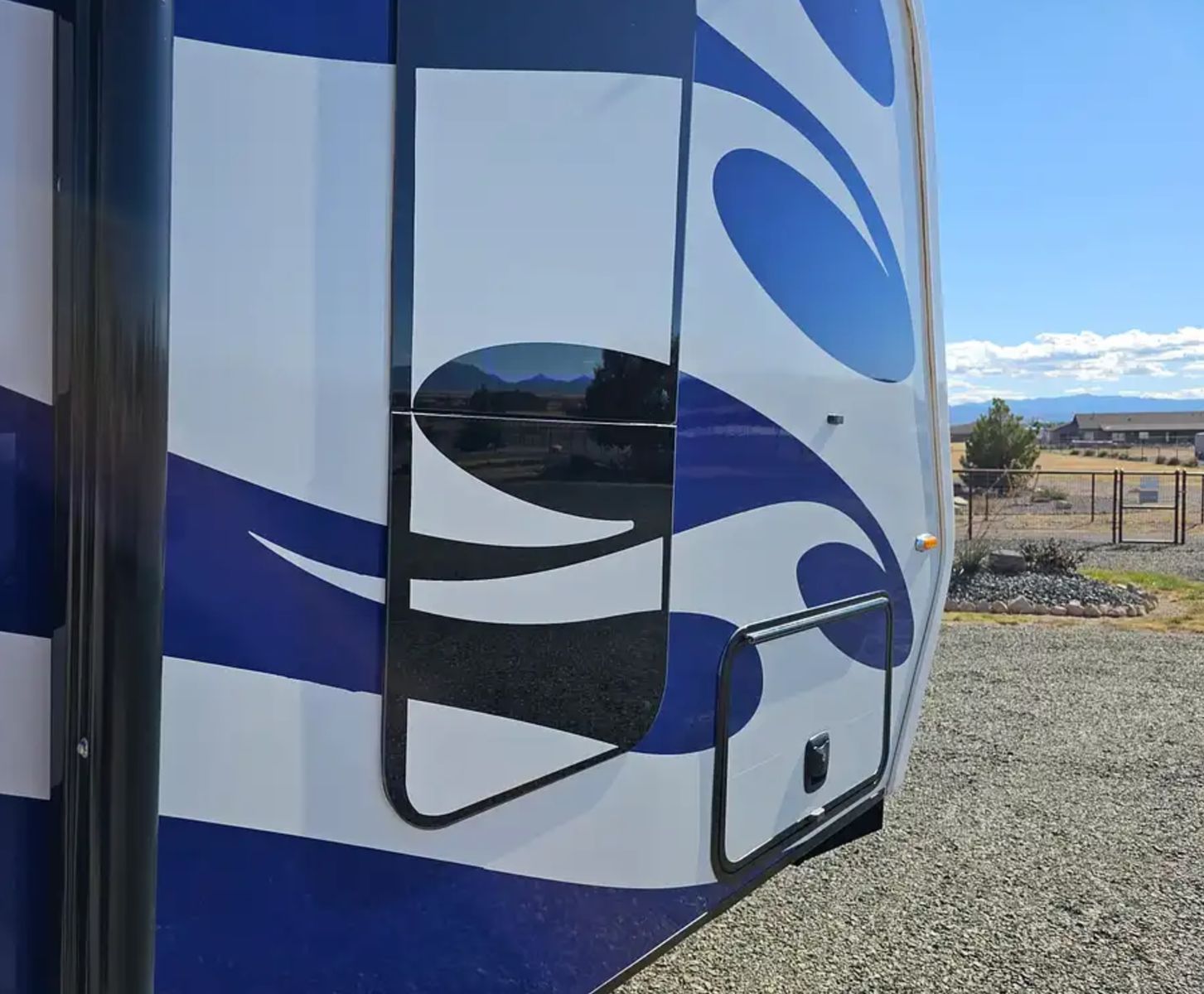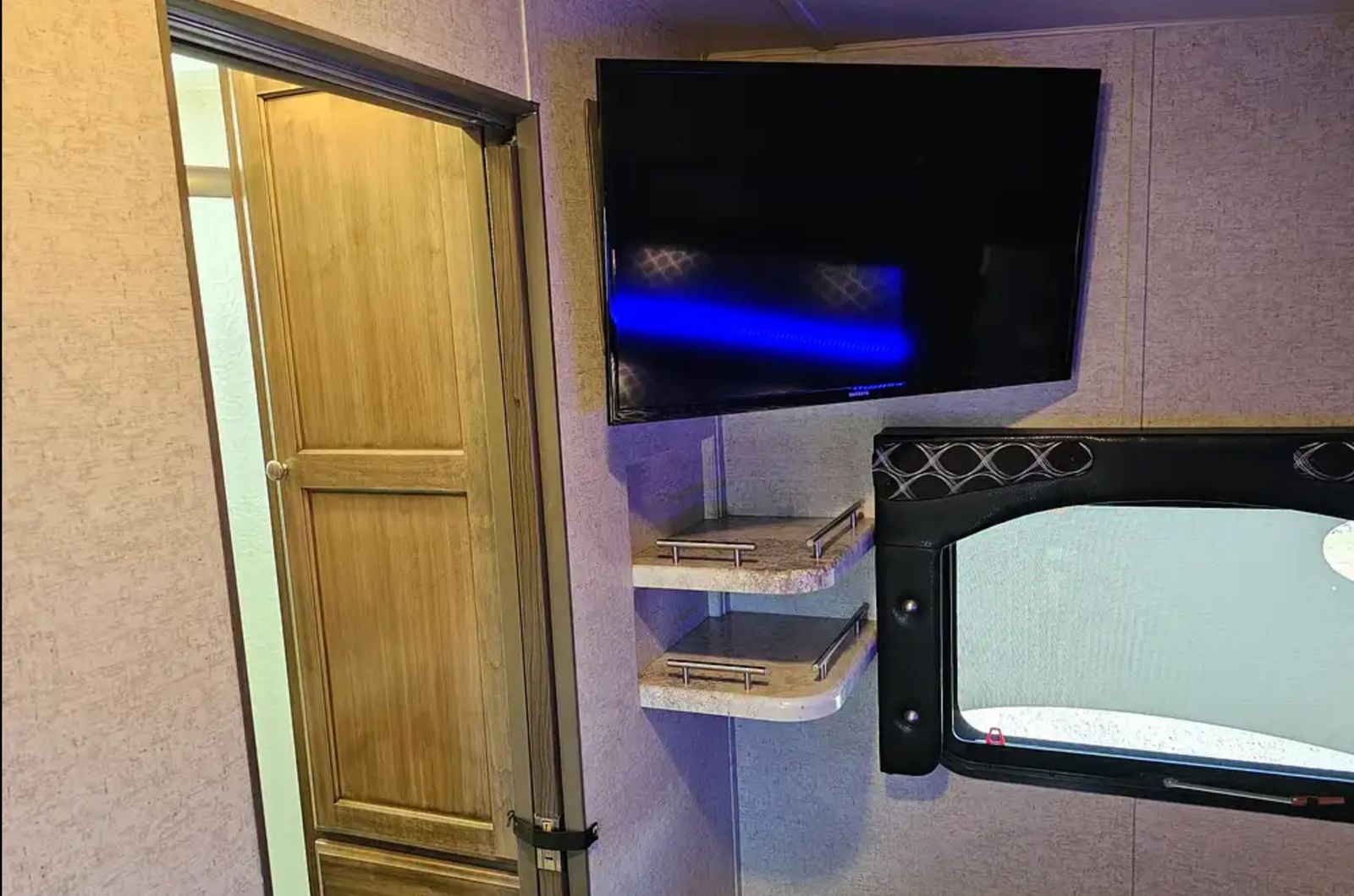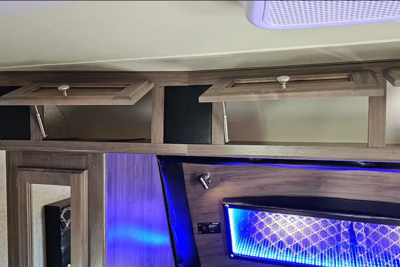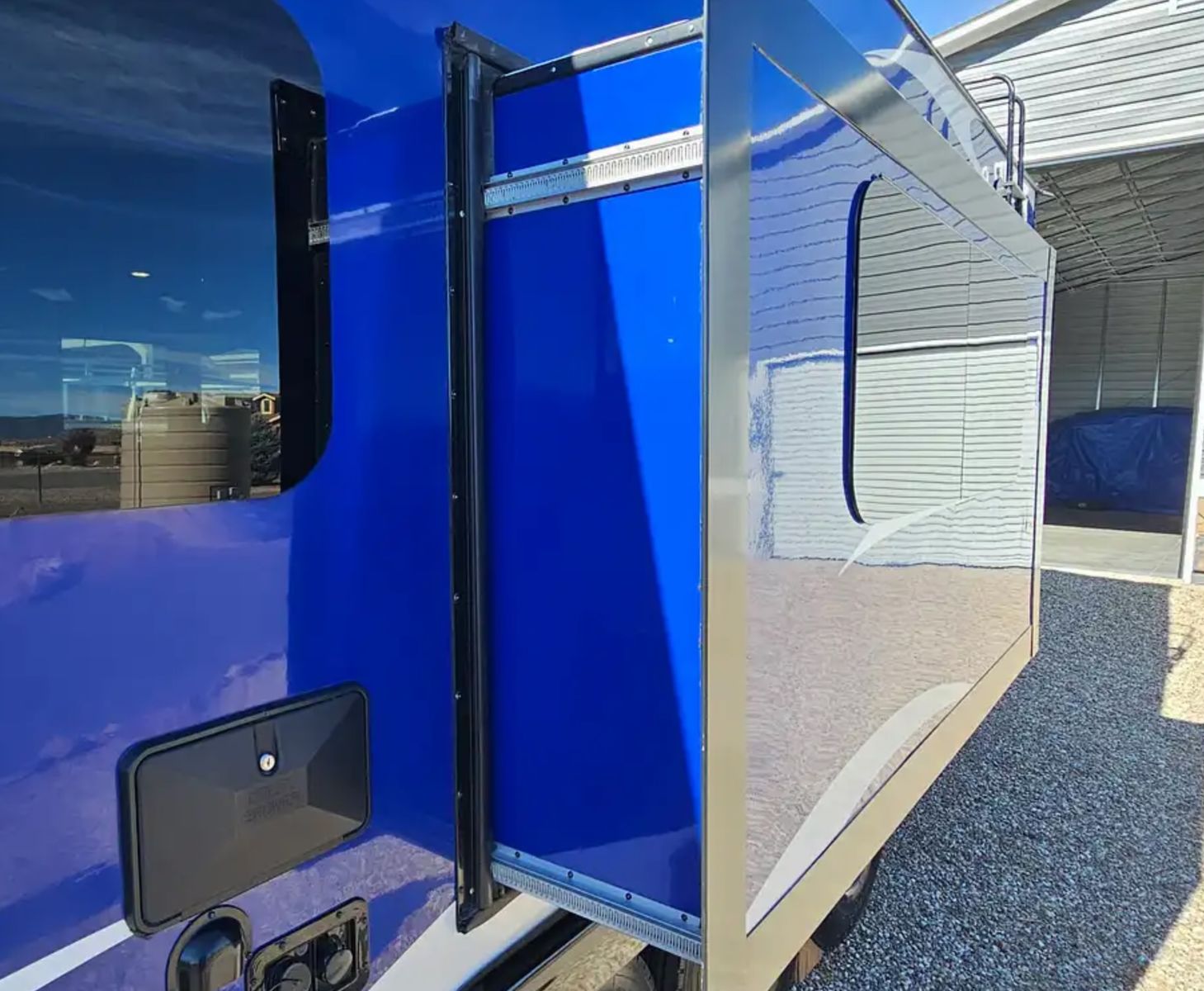 It is solar prepped, electric stabilizer jacks, 21' awning, Kicker sound system installed with amps and a subwoofer, backup camera, and electric jack.