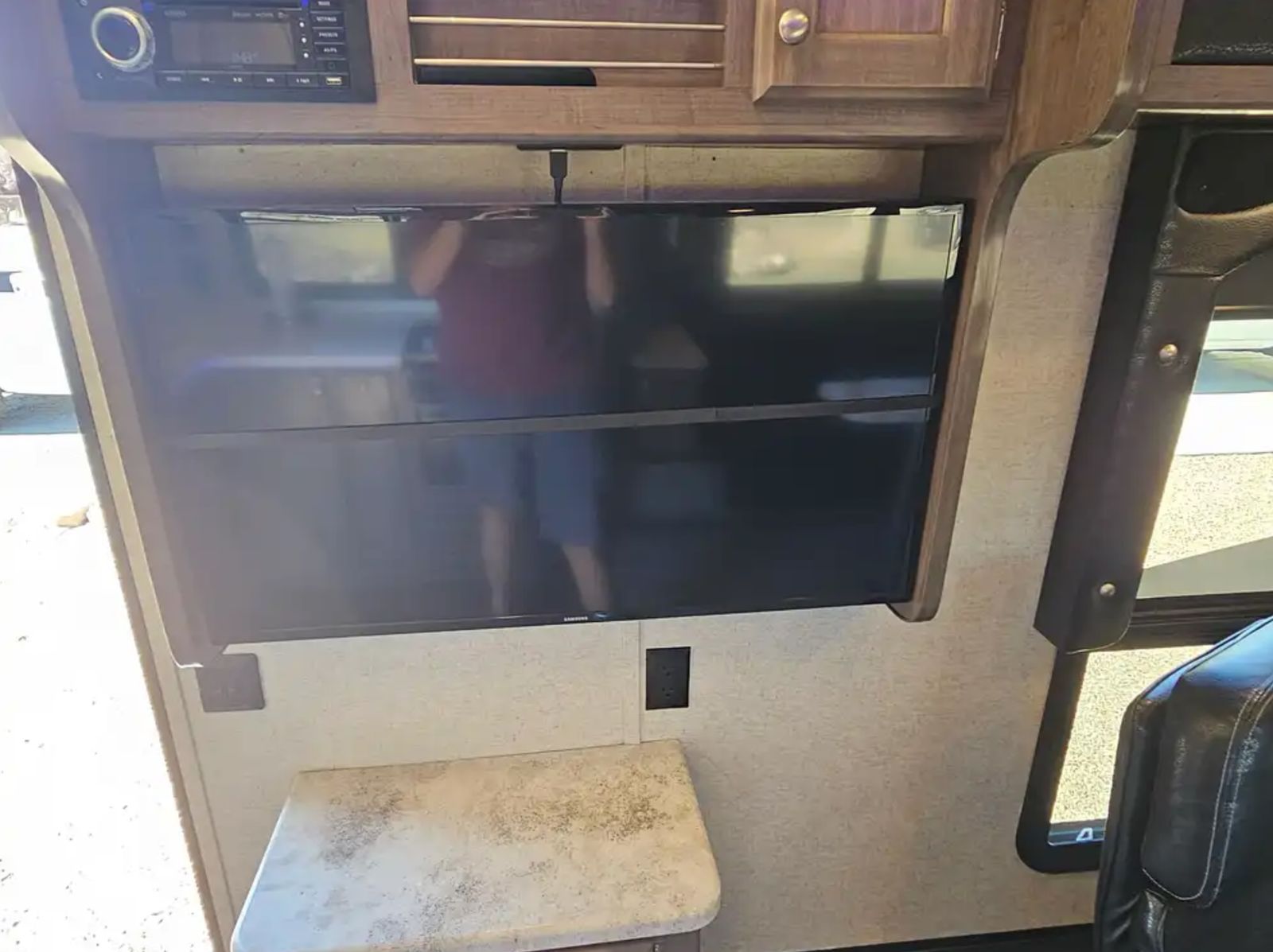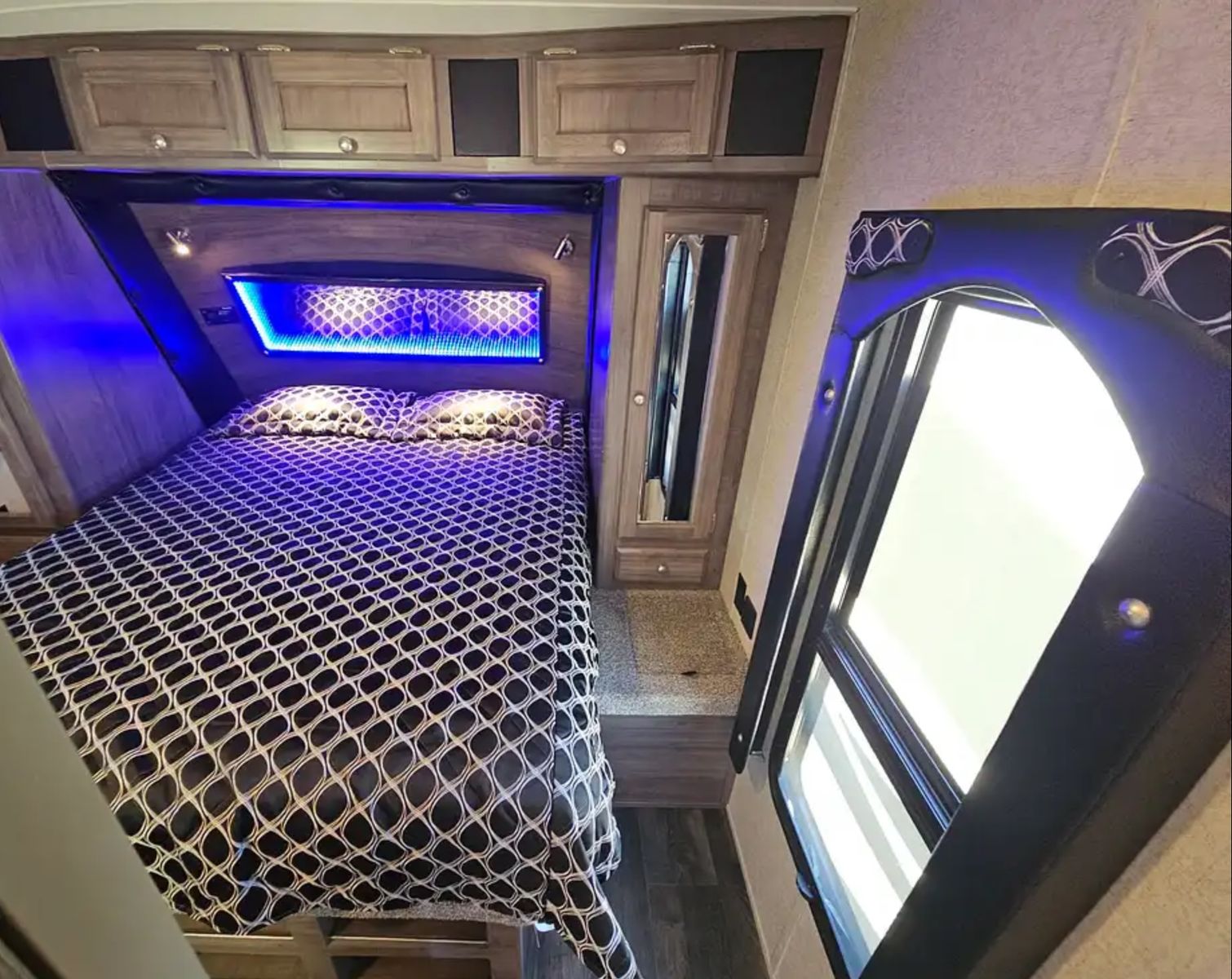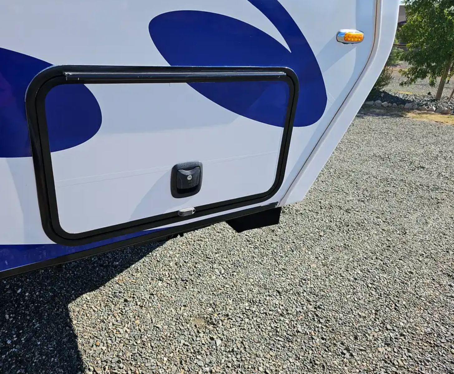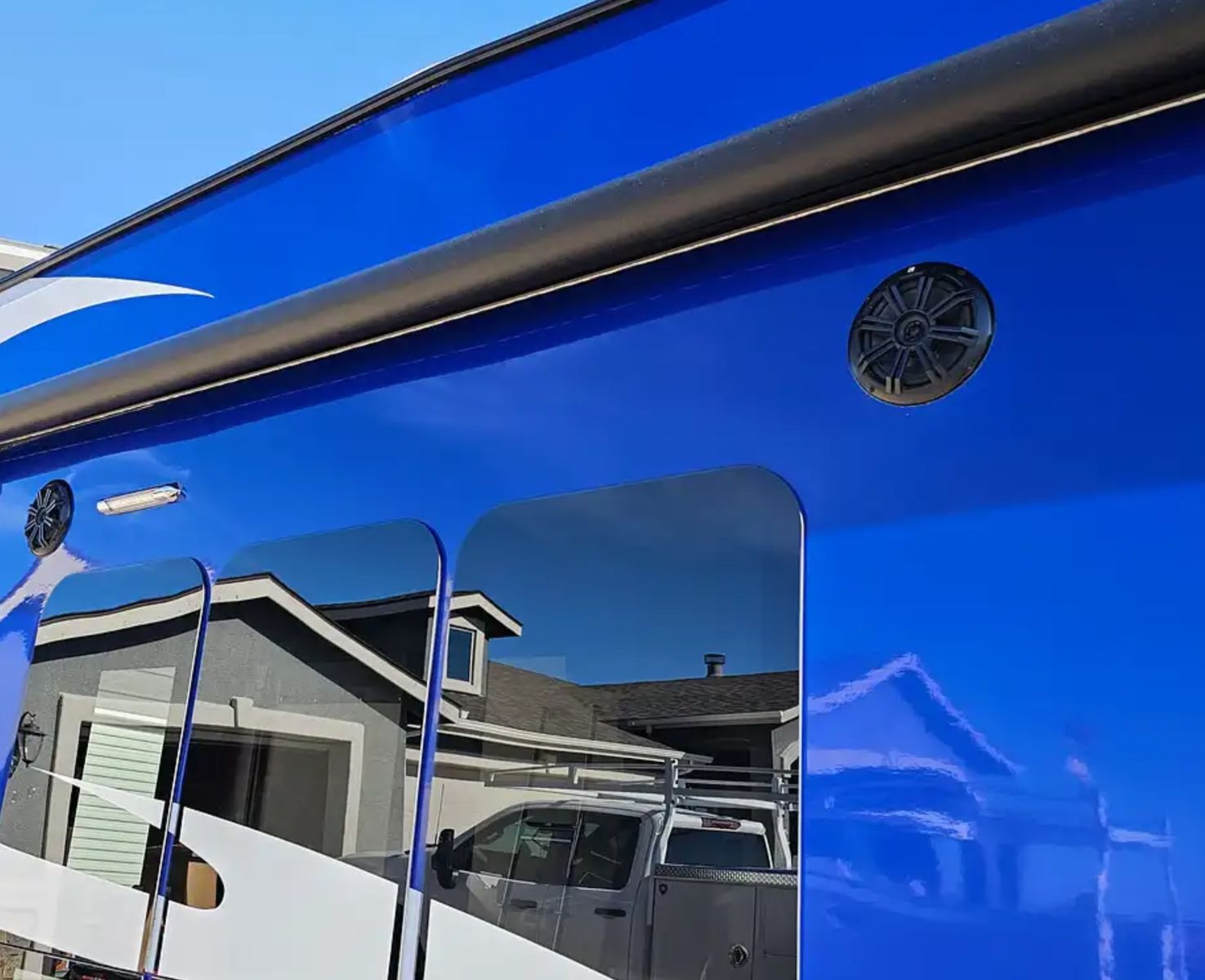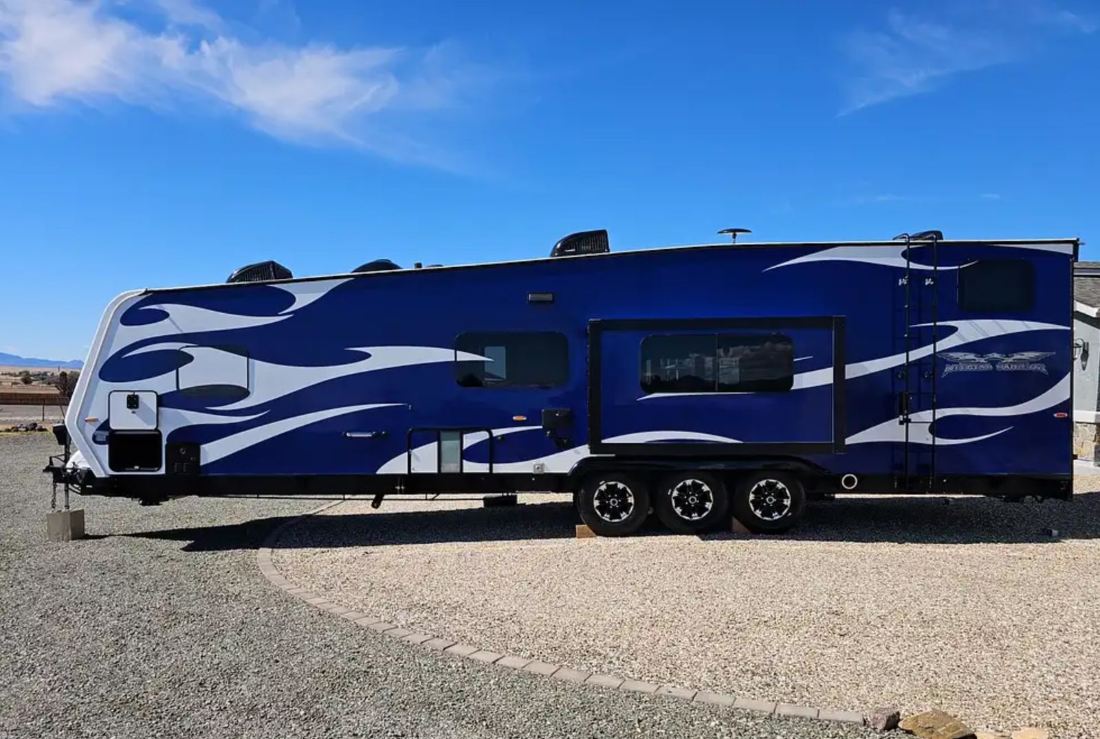 It is solar prepped, electric stabilizer jacks, 21' awning, Kicker sound system installed with amps and a subwoofer, backup camera, and electric jack.