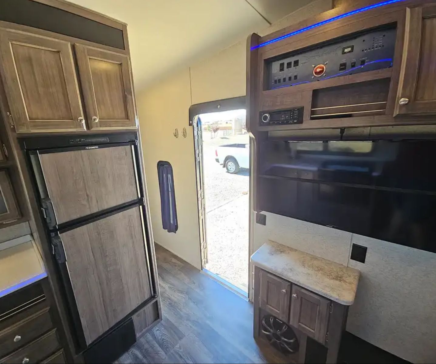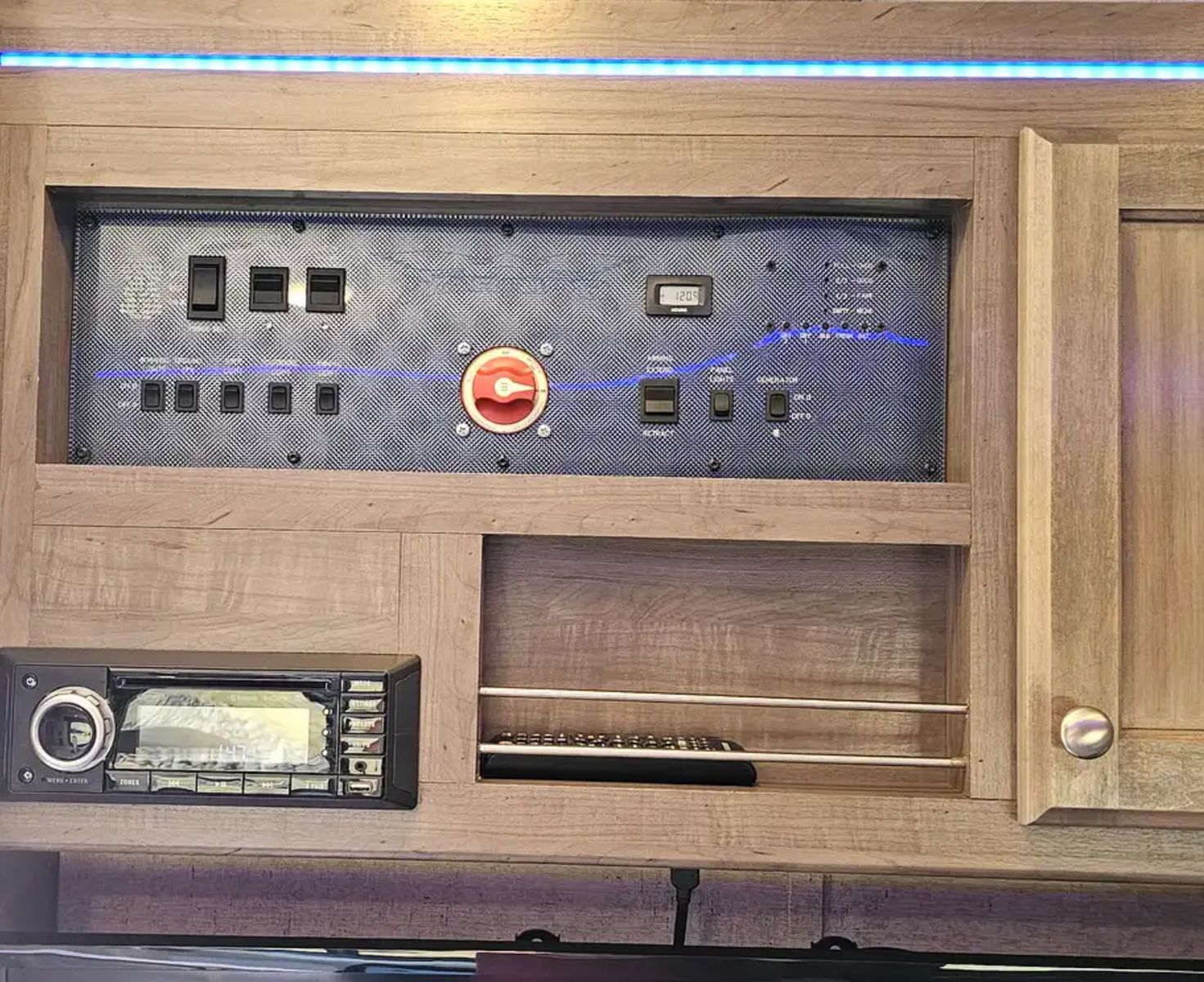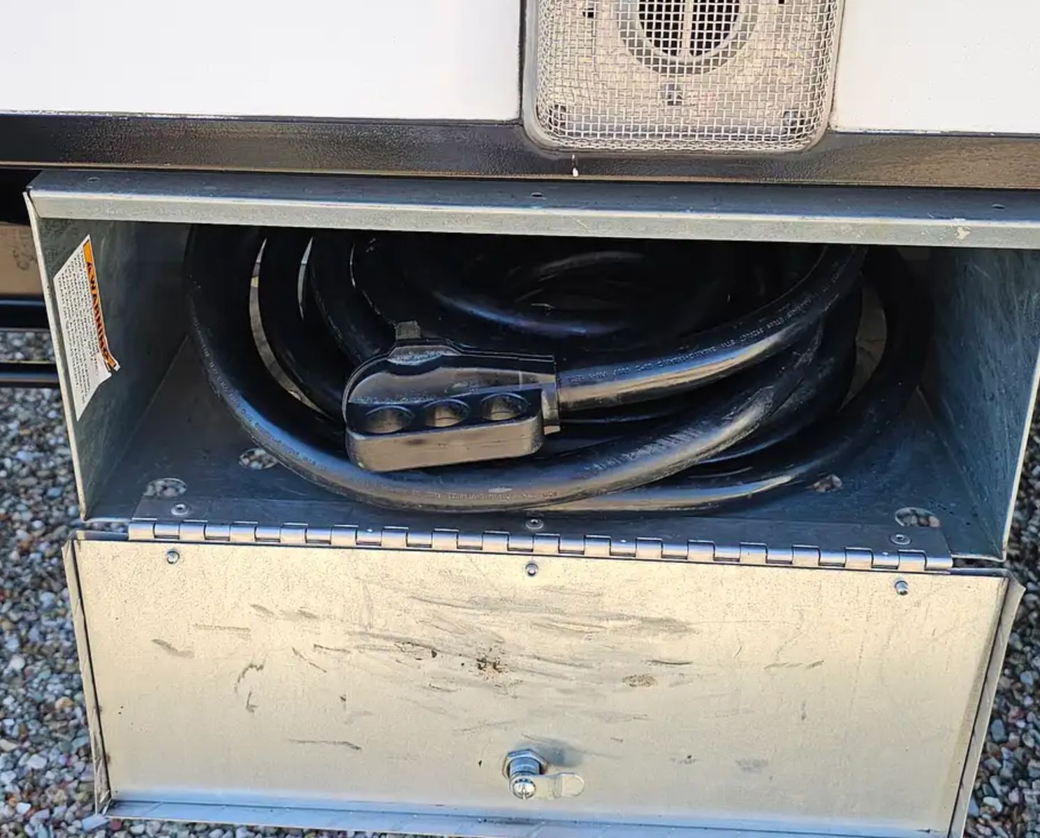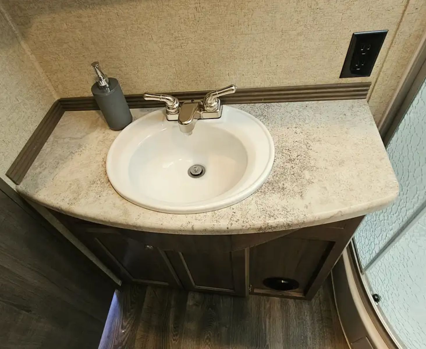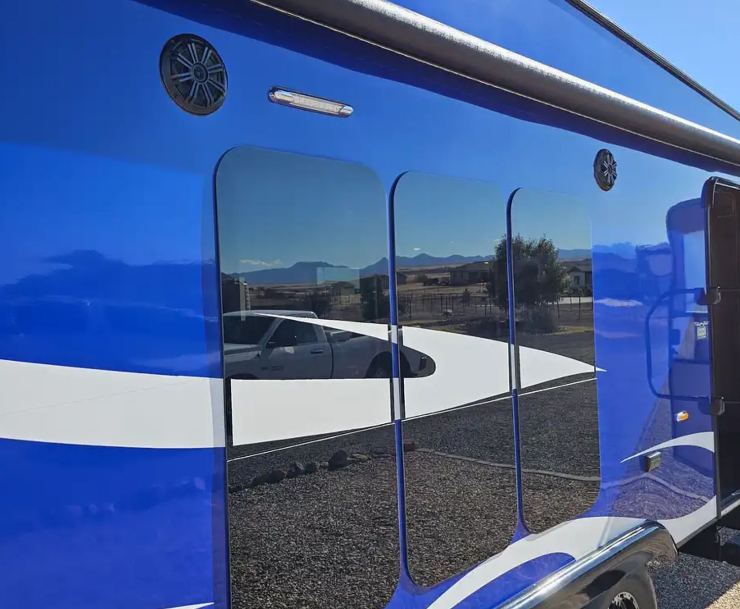 It is solar prepped, electric stabilizer jacks, 21' awning, Kicker sound system installed with amps and a subwoofer, backup camera, and electric jack.