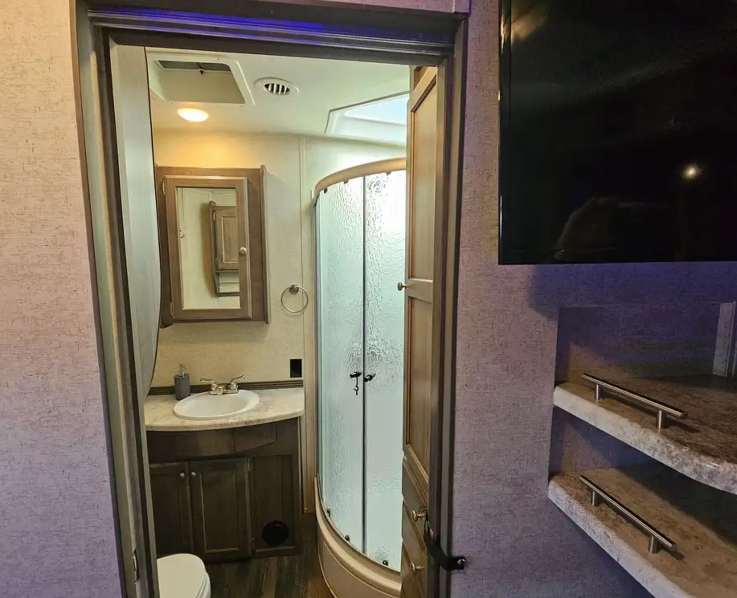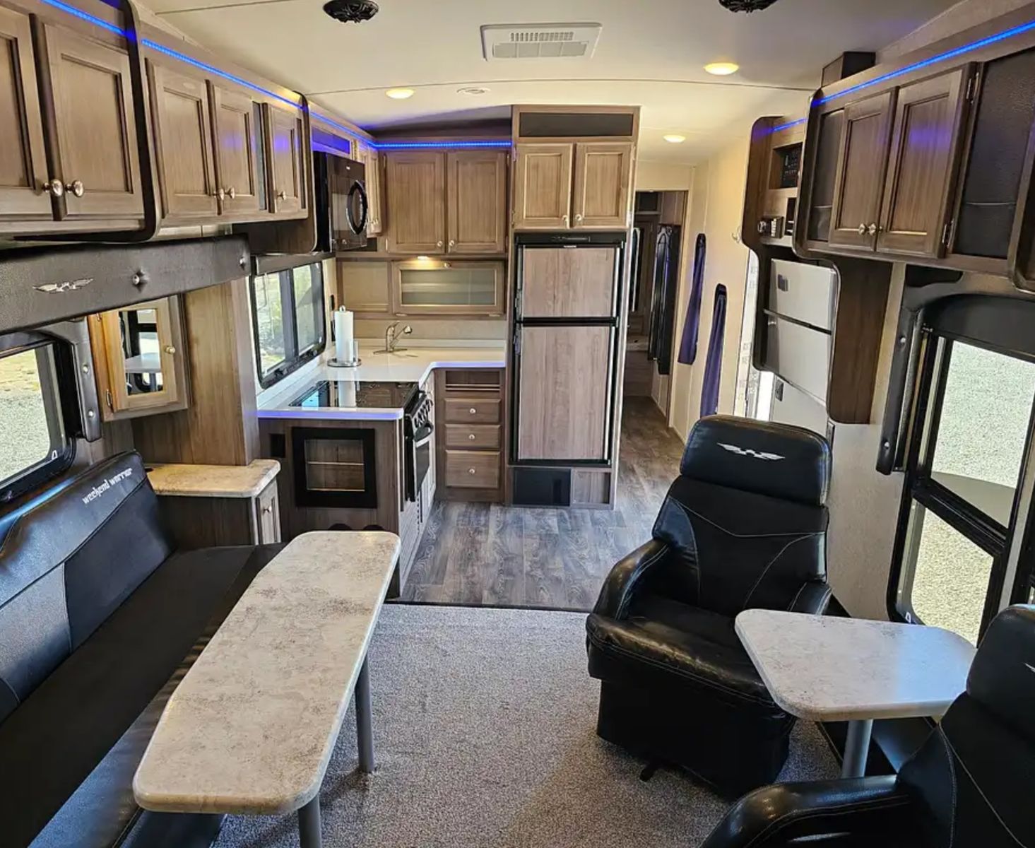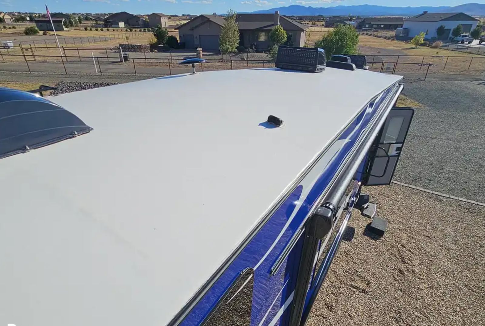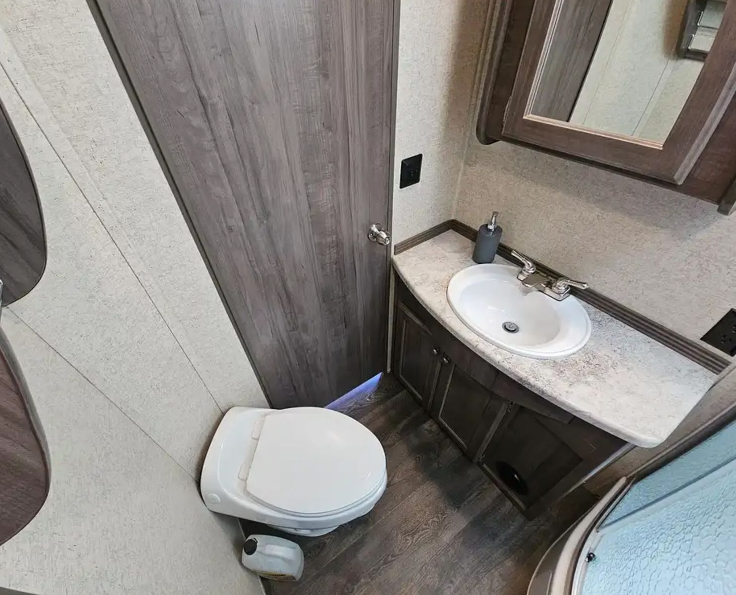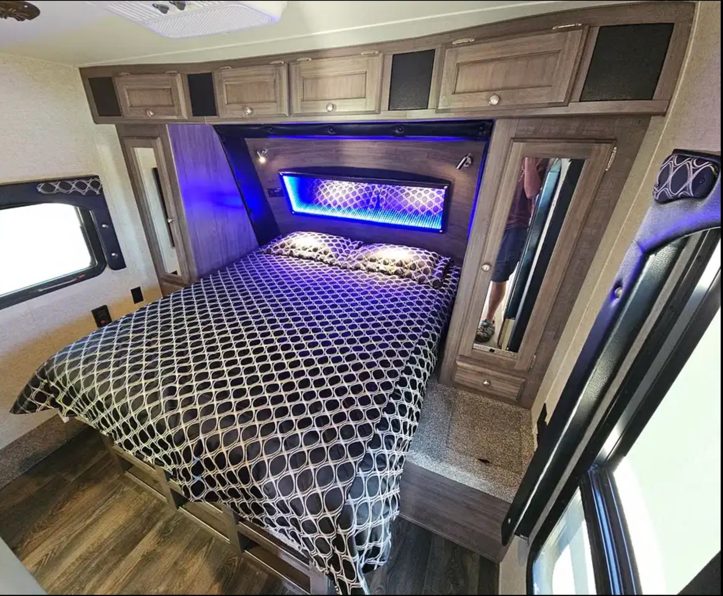 It is solar prepped, electric stabilizer jacks, 21' awning, Kicker sound system installed with amps and a subwoofer, backup camera, and electric jack.