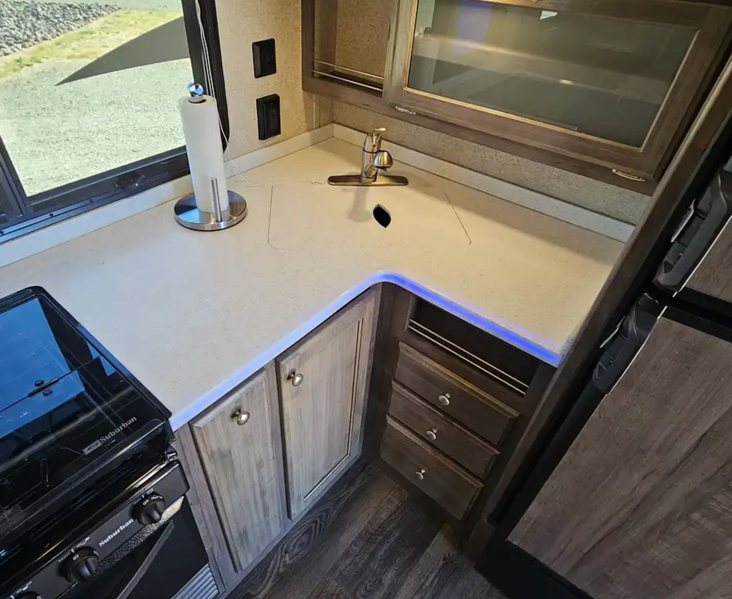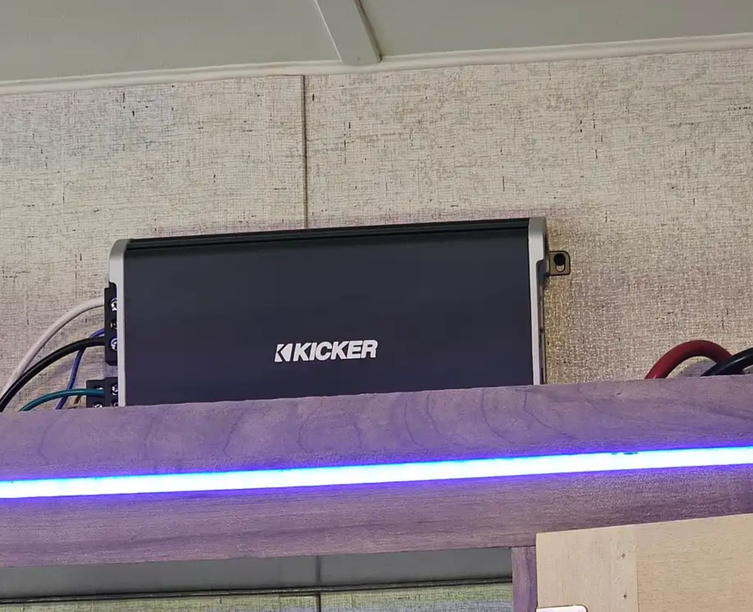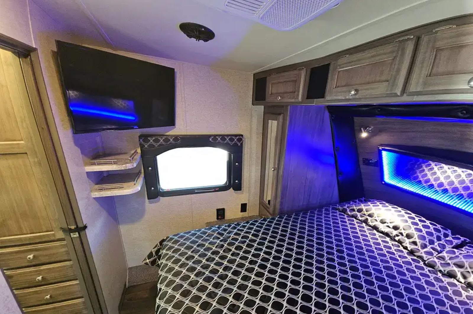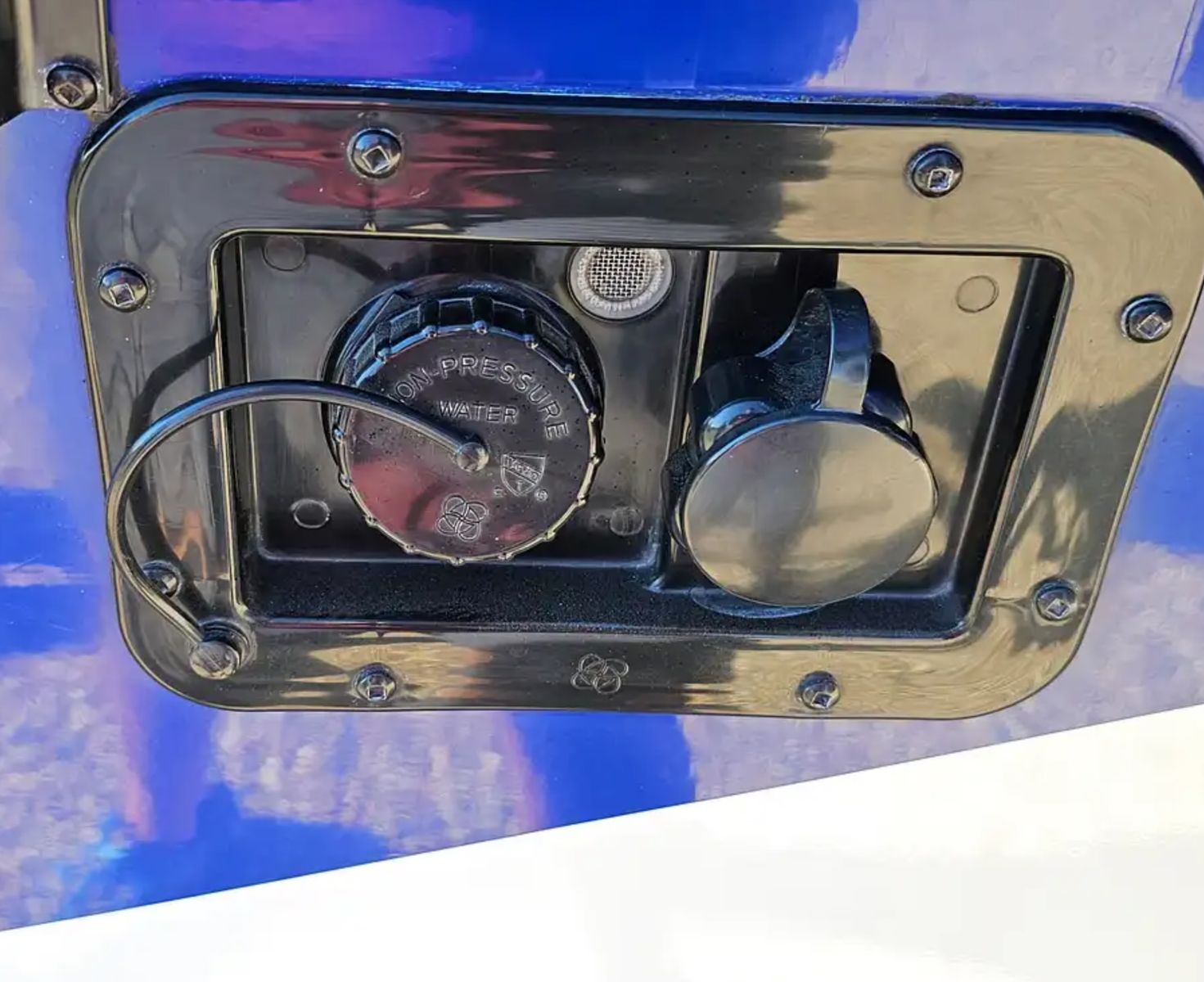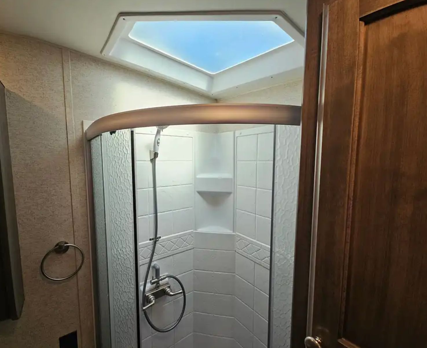 It is solar prepped, electric stabilizer jacks, 21' awning, Kicker sound system installed with amps and a subwoofer, backup camera, and electric jack.