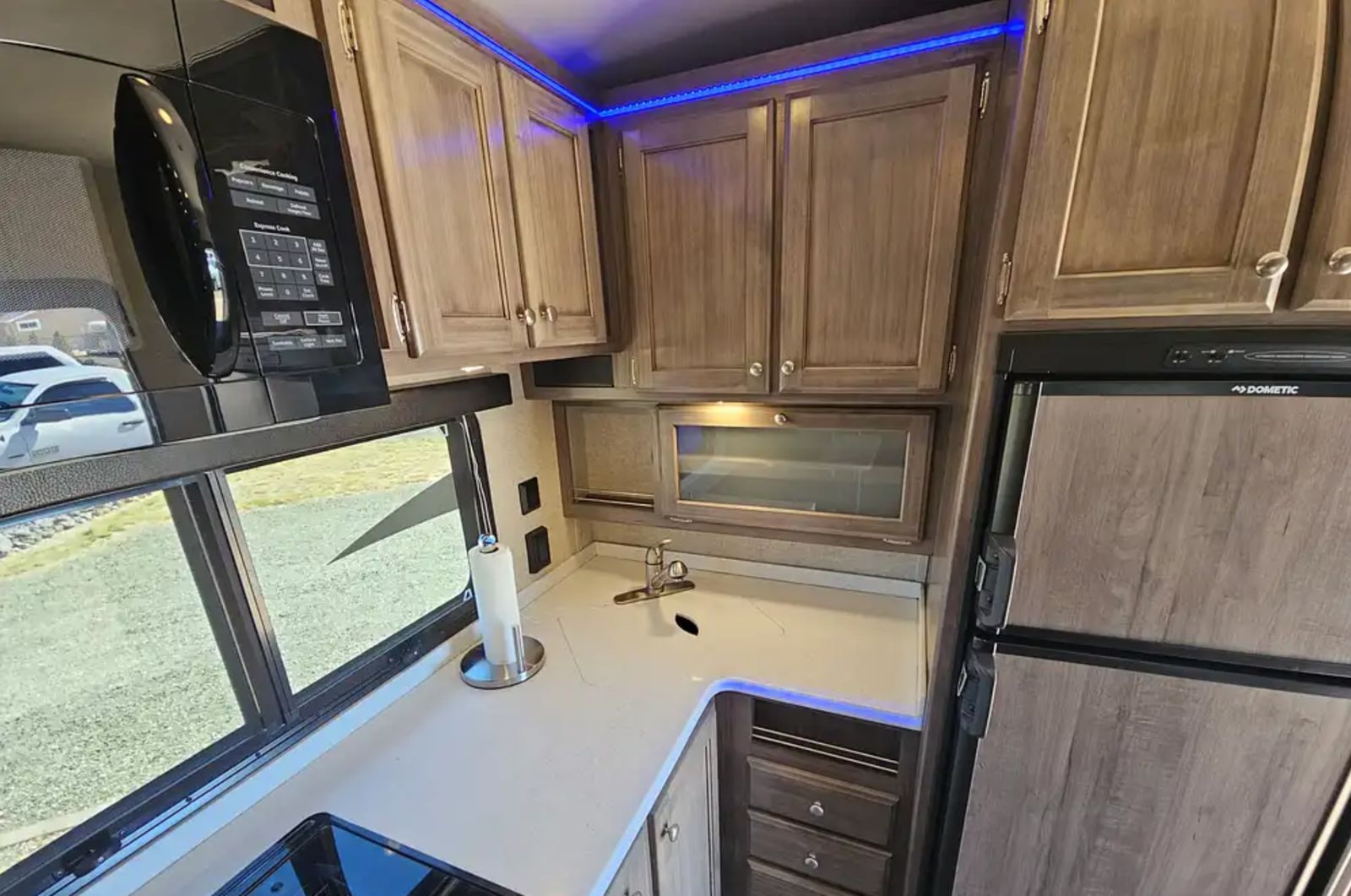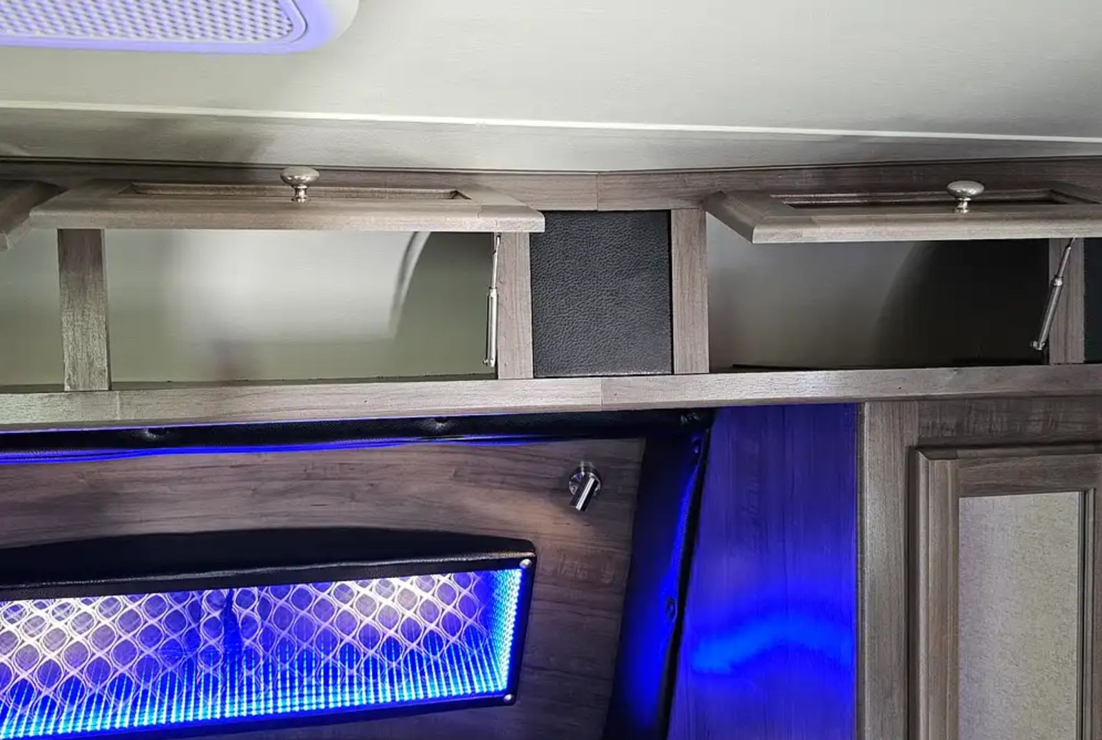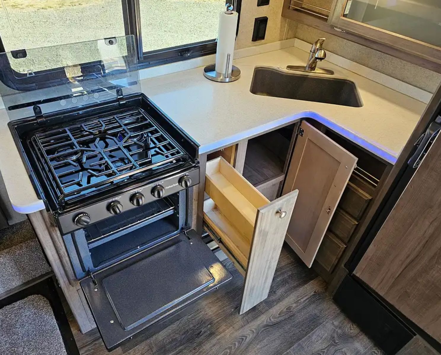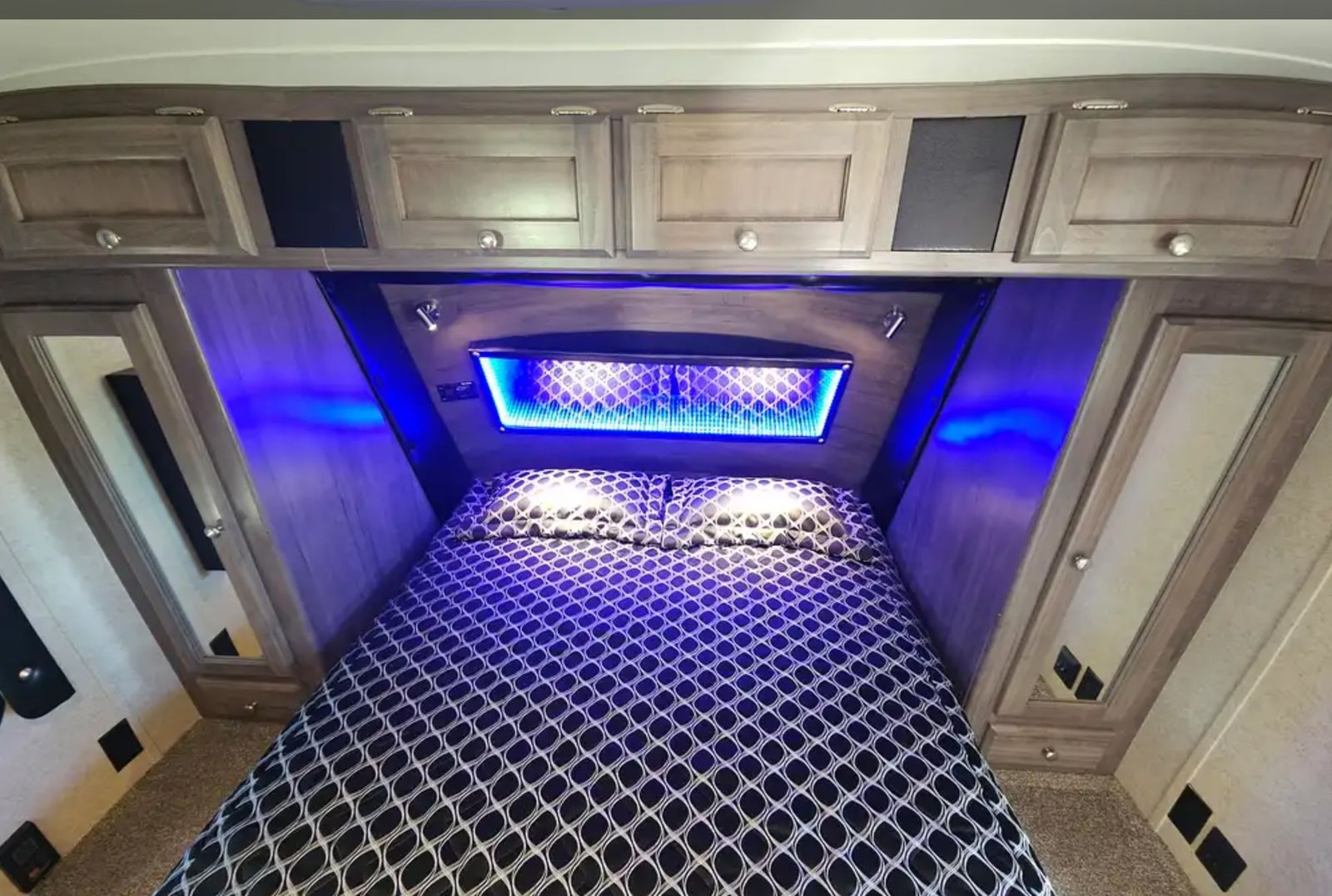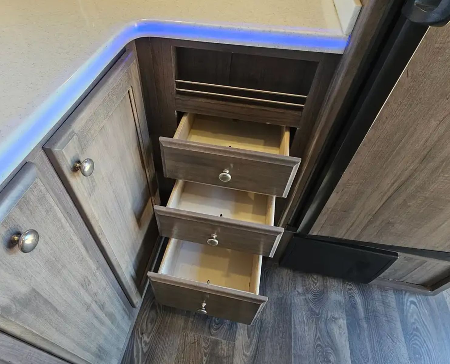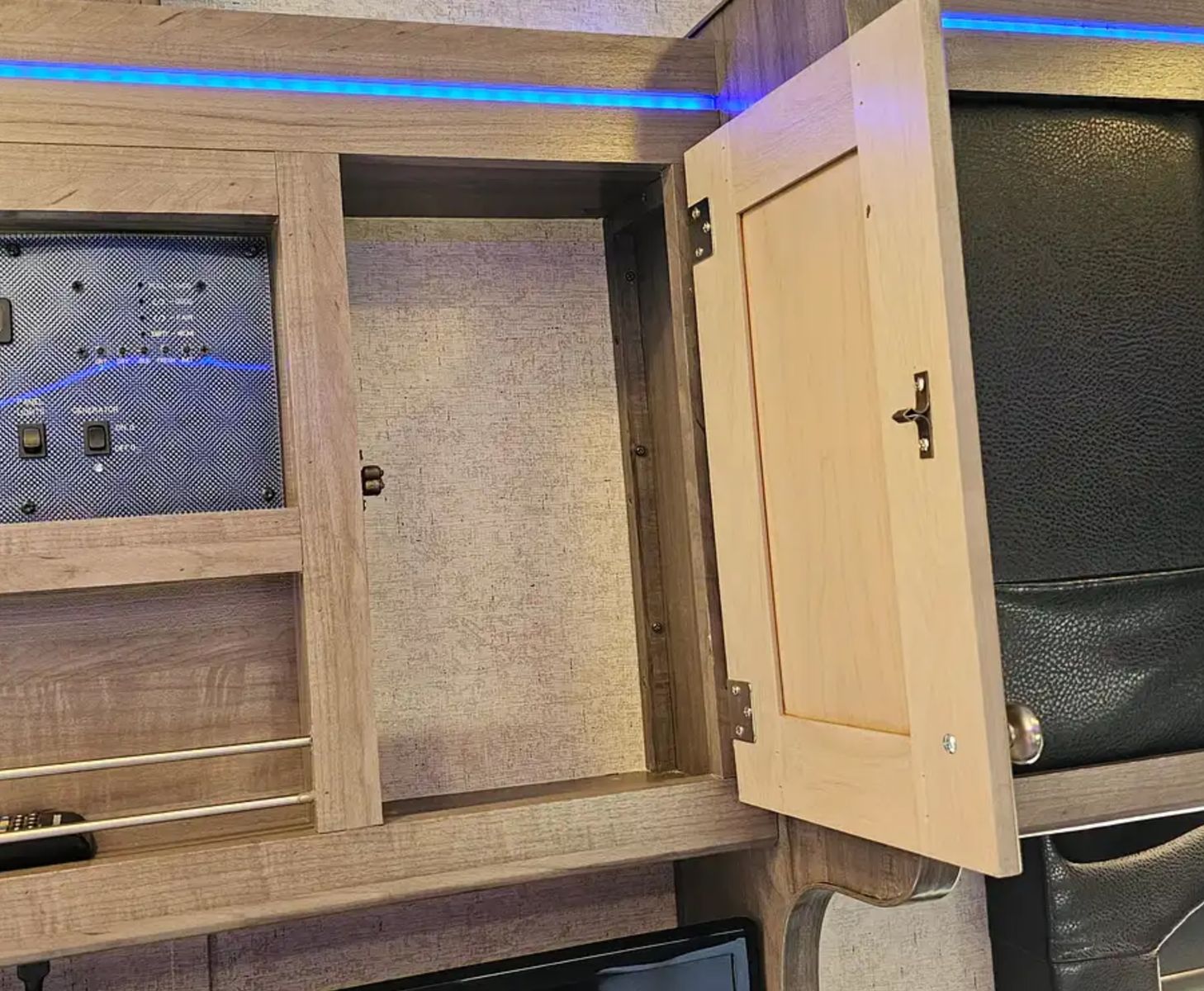 It is solar prepped, electric stabilizer jacks, 21' awning, Kicker sound system installed with amps and a subwoofer, backup camera, and electric jack.