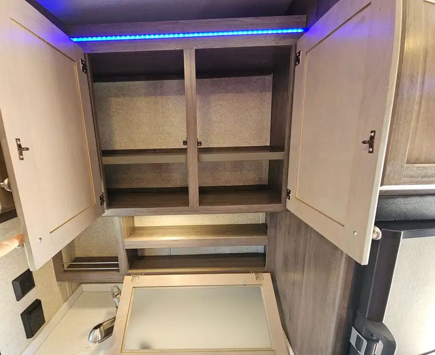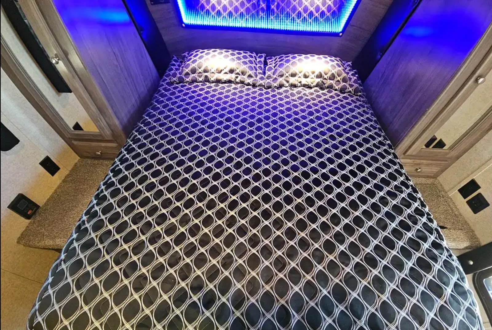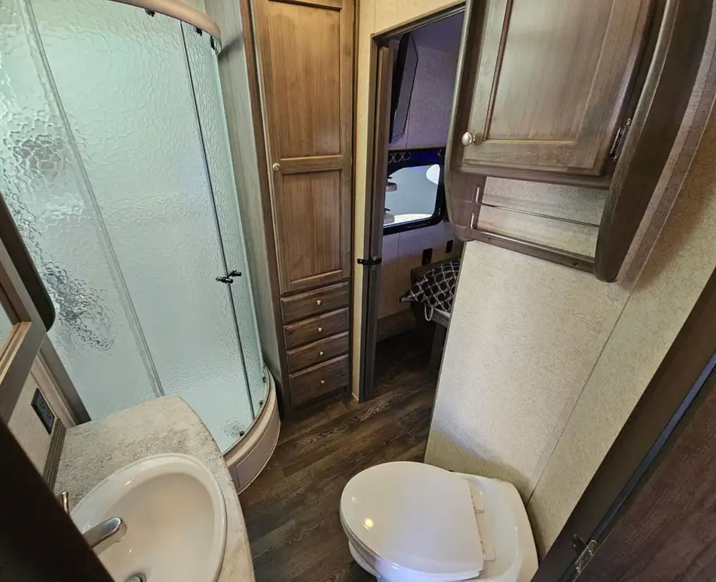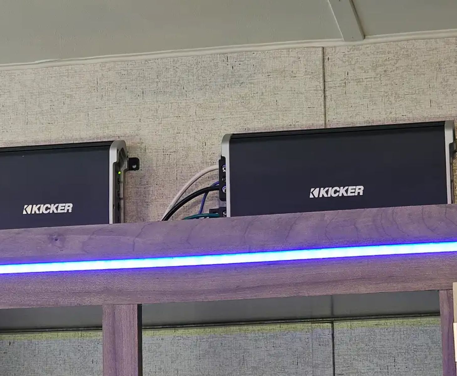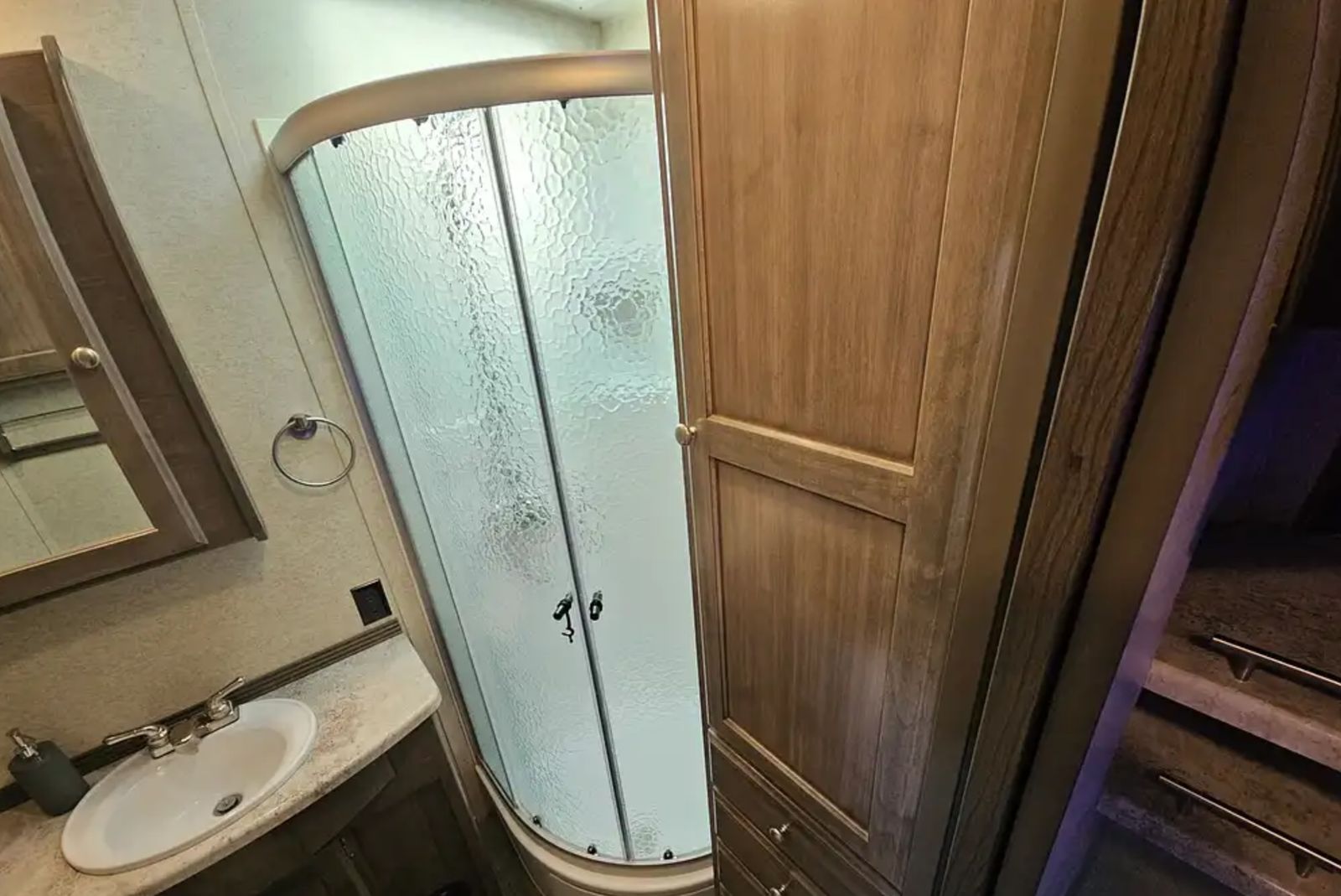 It is solar prepped, electric stabilizer jacks, 21' awning, Kicker sound system installed with amps and a subwoofer, backup camera, and electric jack.