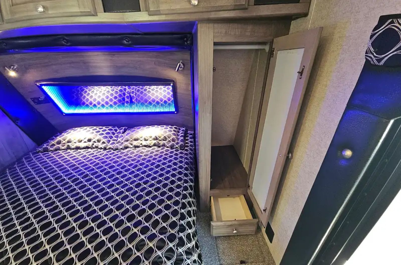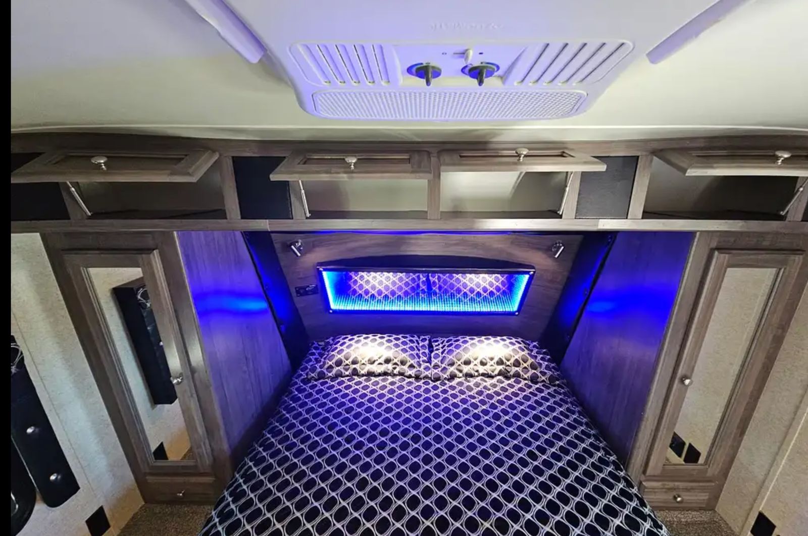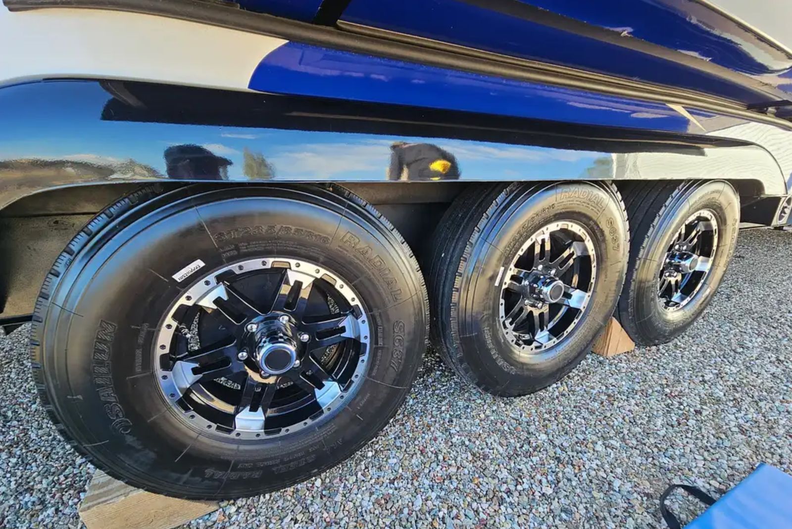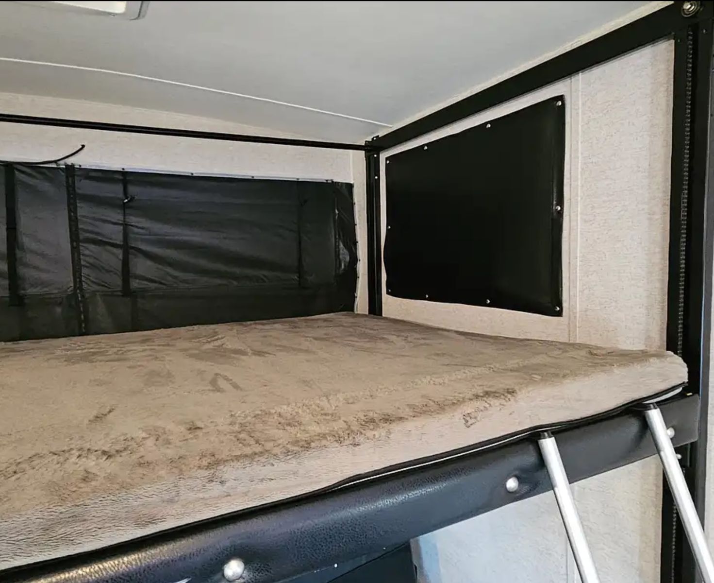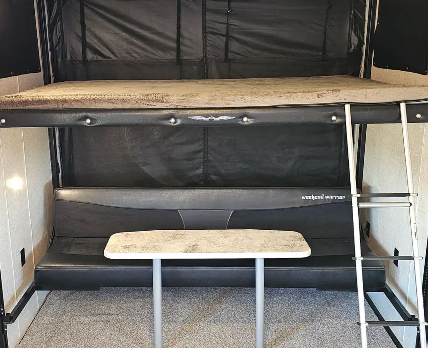 With two drop down queen bunks in the rear, up to 8 people can sleep comfortably in this spacious unit, which has 17' to carry whatever toys you have. It has two AC units, central heat, and the extra insulation ensure the ideal comfort all year long.