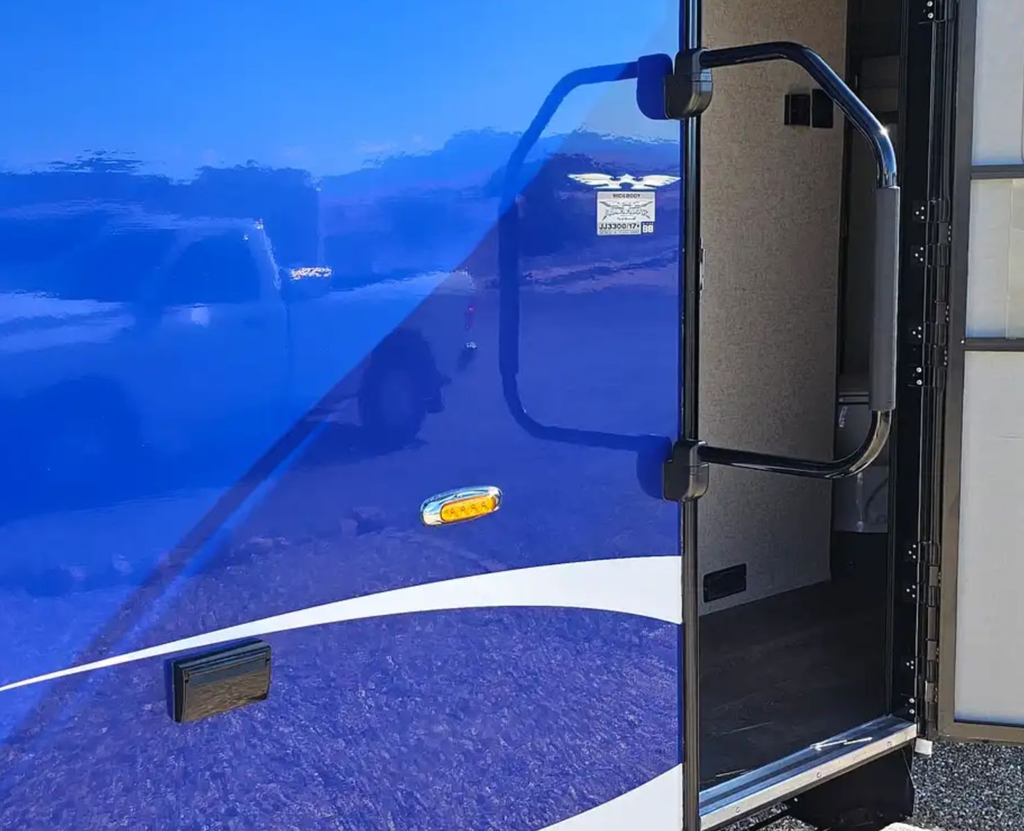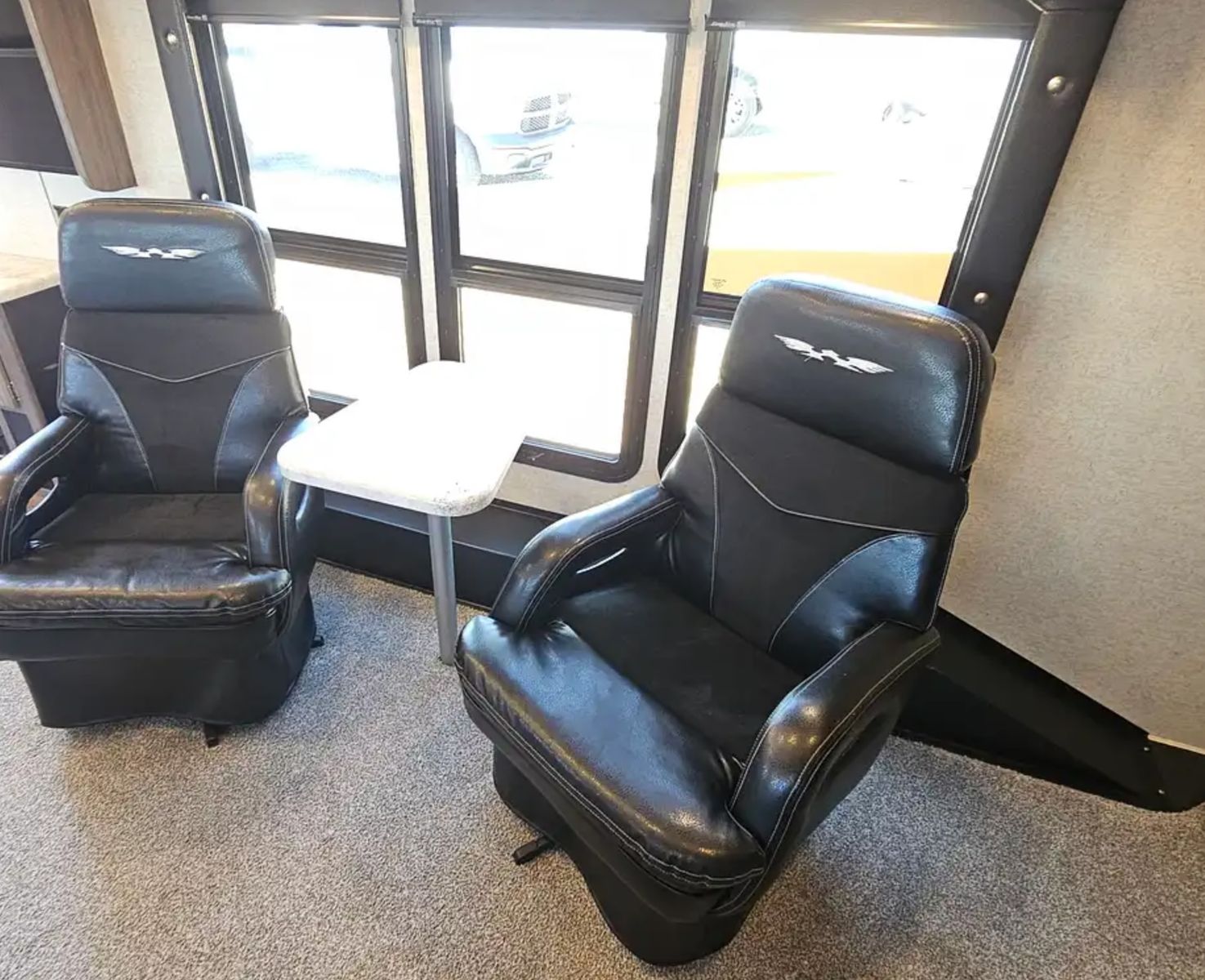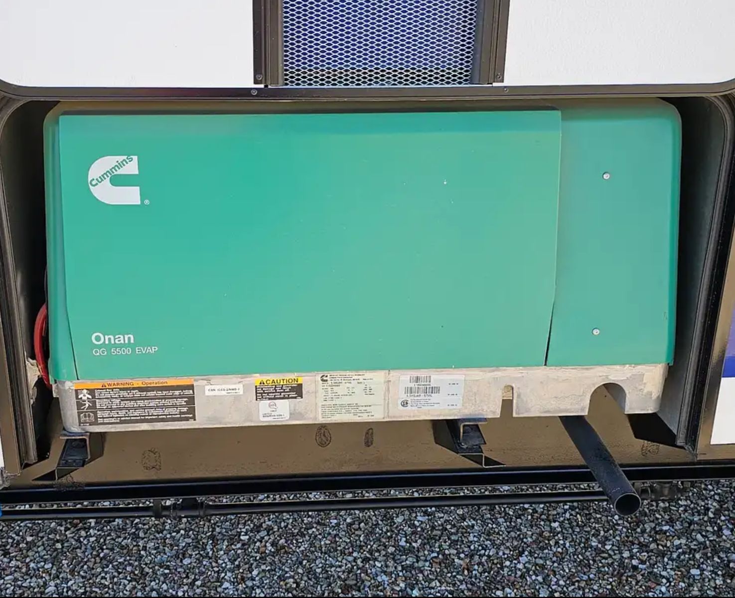 The overall length is 39'4", width is 8'6", and height is 12'5". Dry weight Is 10,926 lbs and GVWR is 16,000 lbs. Water capacity is 122 gallons, gray is 50 gallons, and waste is 50 gallons. It has an onboard Onan generator (5.5kW), 3 propane tanks, 2 batteries, tankless water heater, and an onboard fuel station.