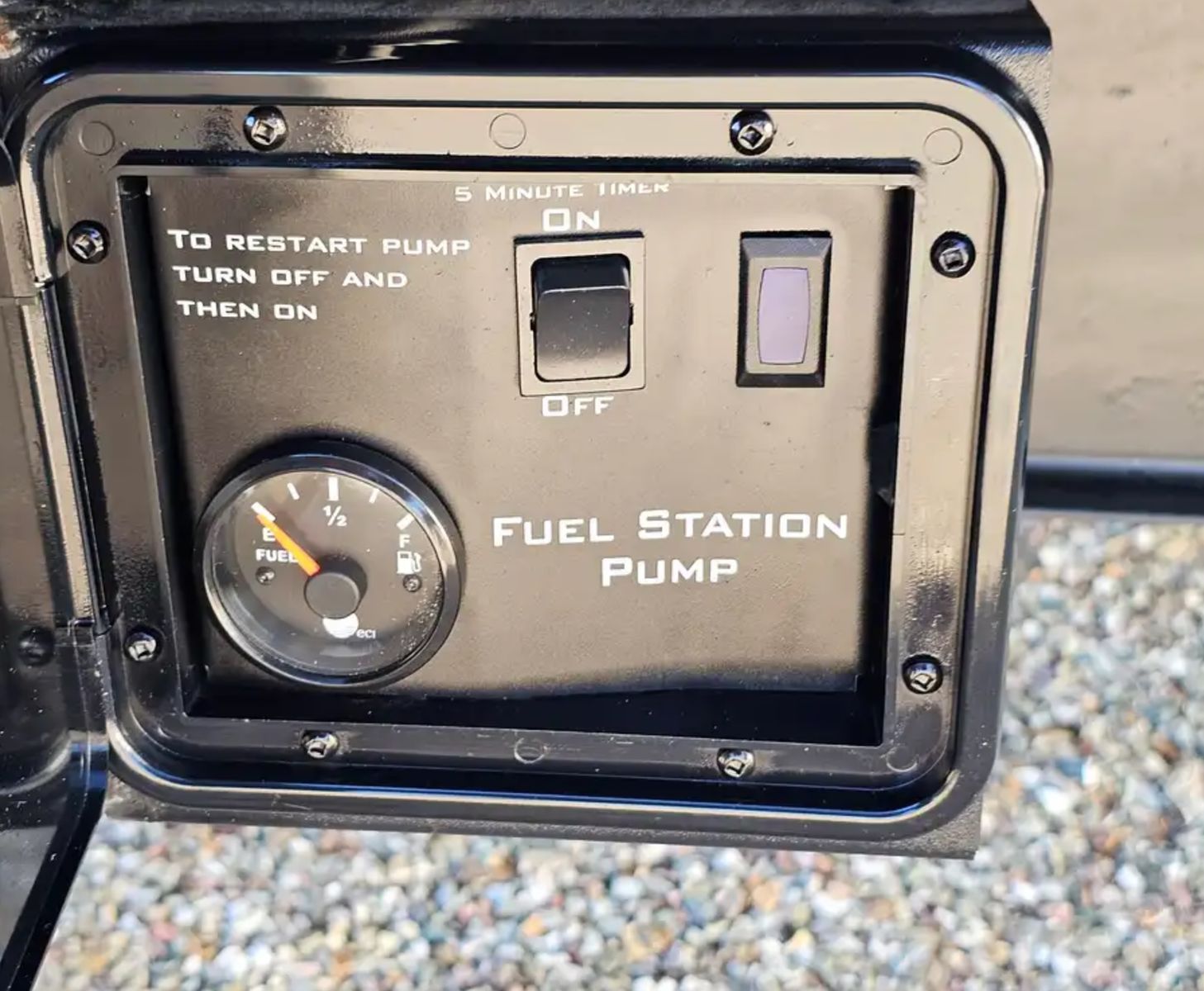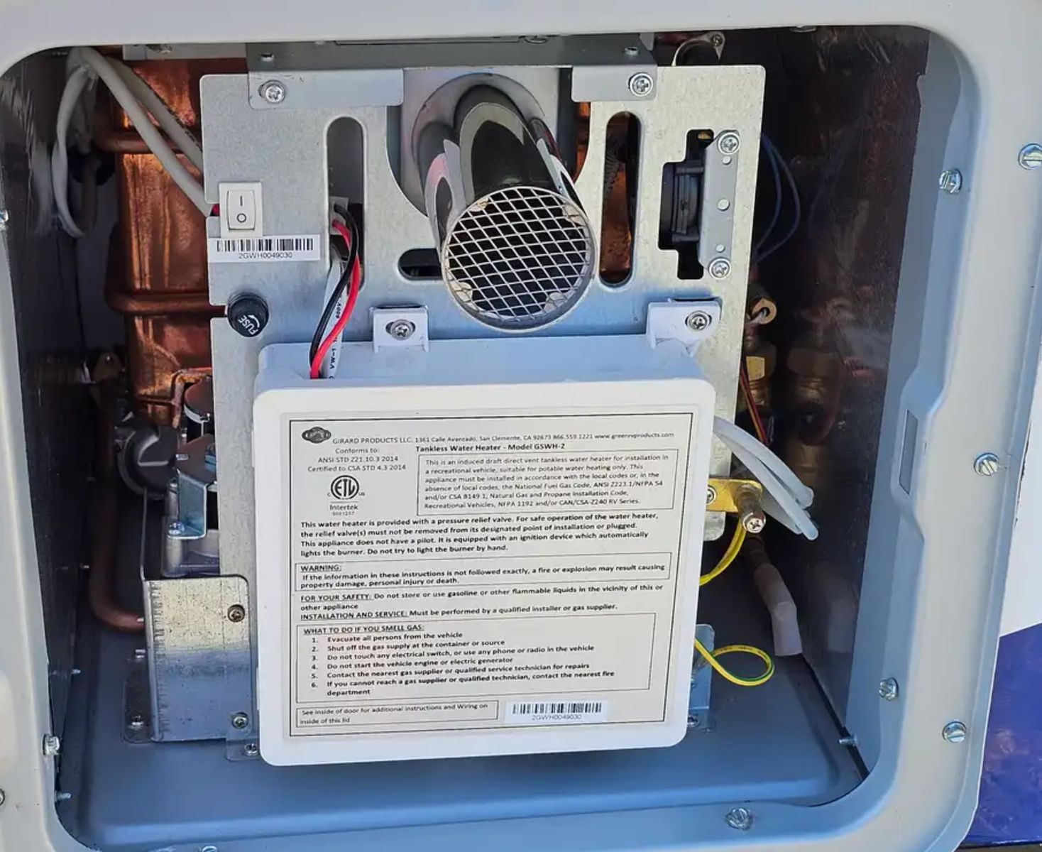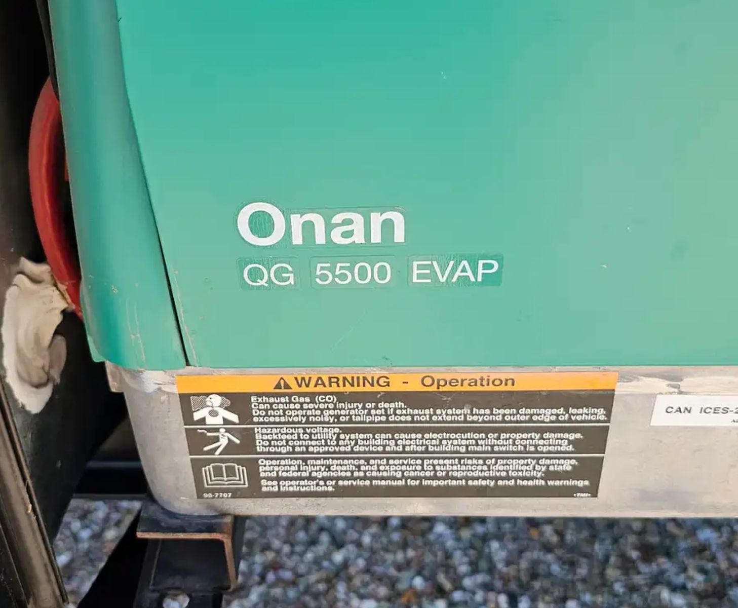 The overall length is 39'4", width is 8'6", and height is 12'5". Dry weight Is 10,926 lbs and GVWR is 16,000 lbs. Water capacity is 122 gallons, gray is 50 gallons, and waste is 50 gallons. It has an onboard Onan generator (5.5kW), 3 propane tanks, 2 batteries, tankless water heater, and an onboard fuel station.