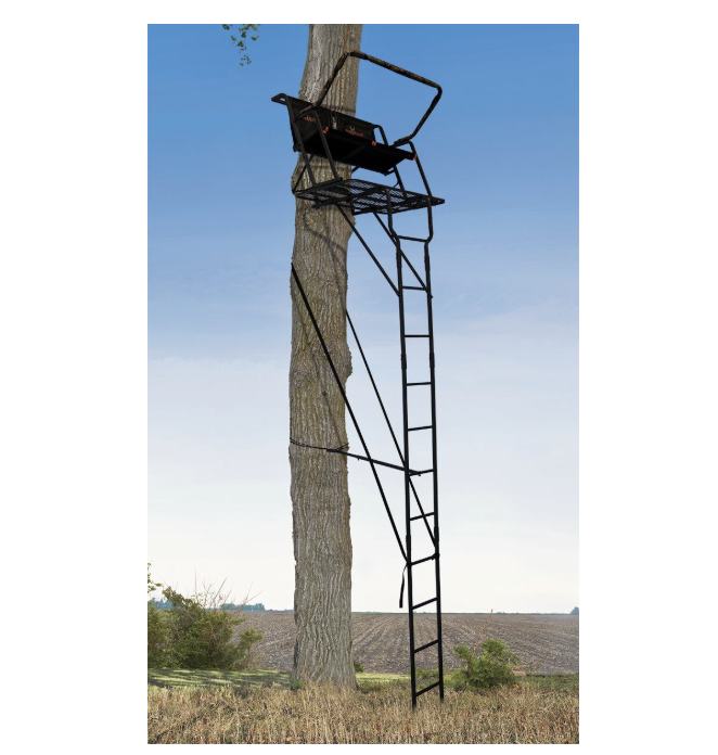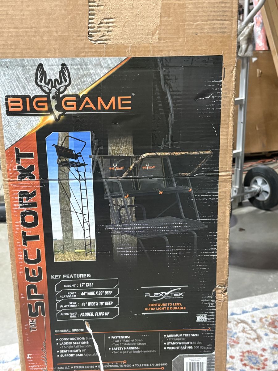 Big Game The Spector XT Ladder Treestand is a two-person ladderstand that comes fully loaded with a padded, flip-back shooting rail, flip back Flex-tek seats, and extra deep and extra wide foot platform. This platform has it all, and aside from its features, its size is a step above the rest. At 17ft tall, The Spector XT keeps you up and out of sight of wary prey. Measuring in with a foot platform at 44in wide x 29in deep, and a seat at 41in wide x 18in deep, this stand is as spacious and comfortable as it gets. Weighing in at 85 Lbs., this stand boasts an overall weight rating of 500 Lbs. Included are two TMA-Certified full body harnesses.