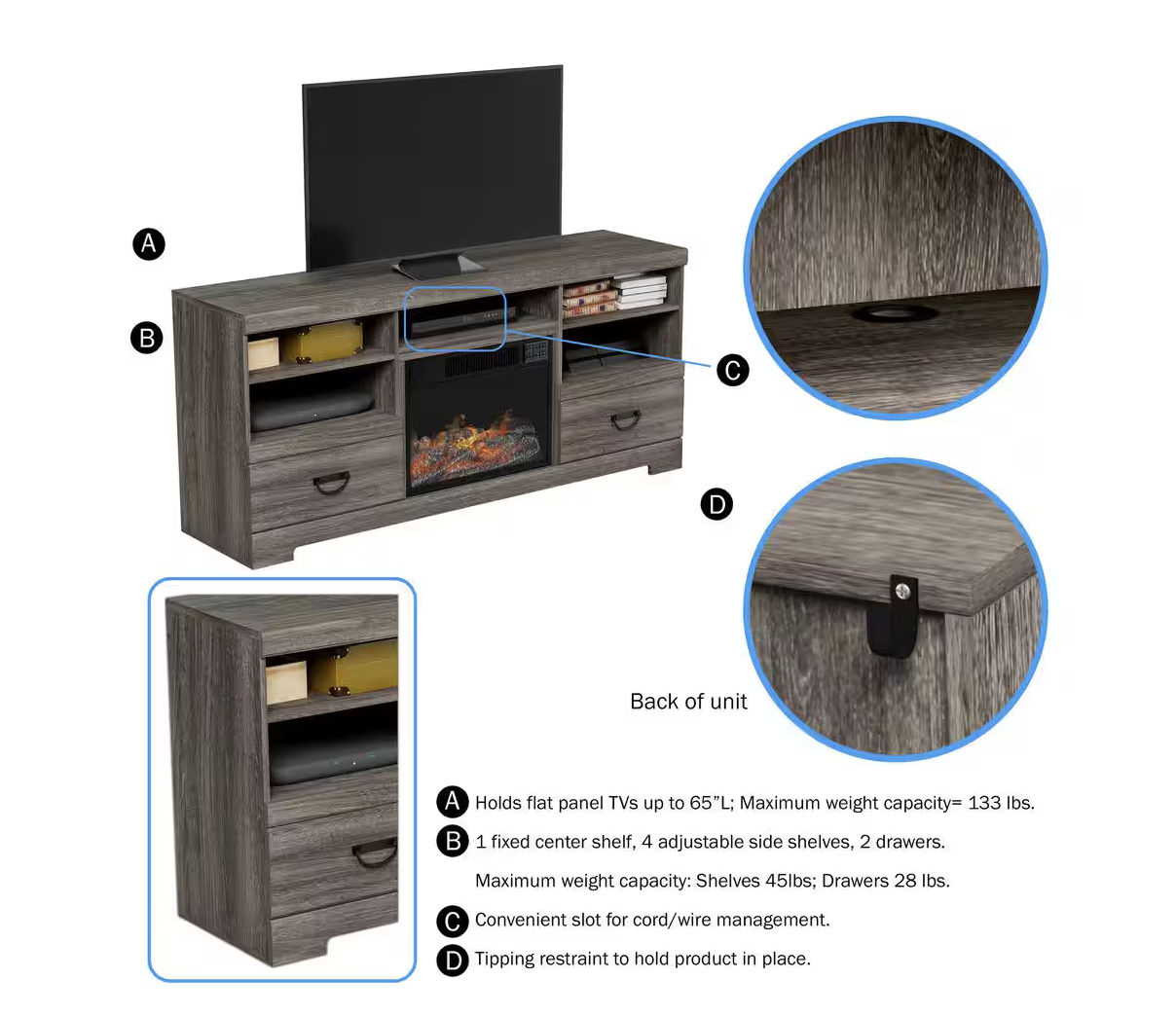 Fits up to 65-inch televisions A remote-controlled fireplace heater is attached to the media console for heating rooms up to 400 square feet in size