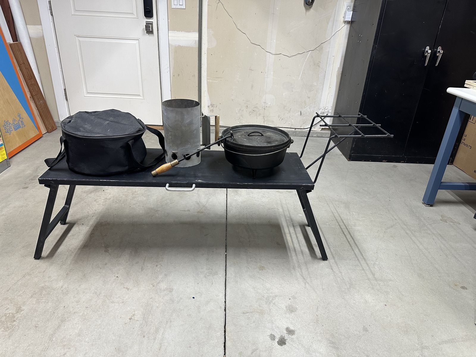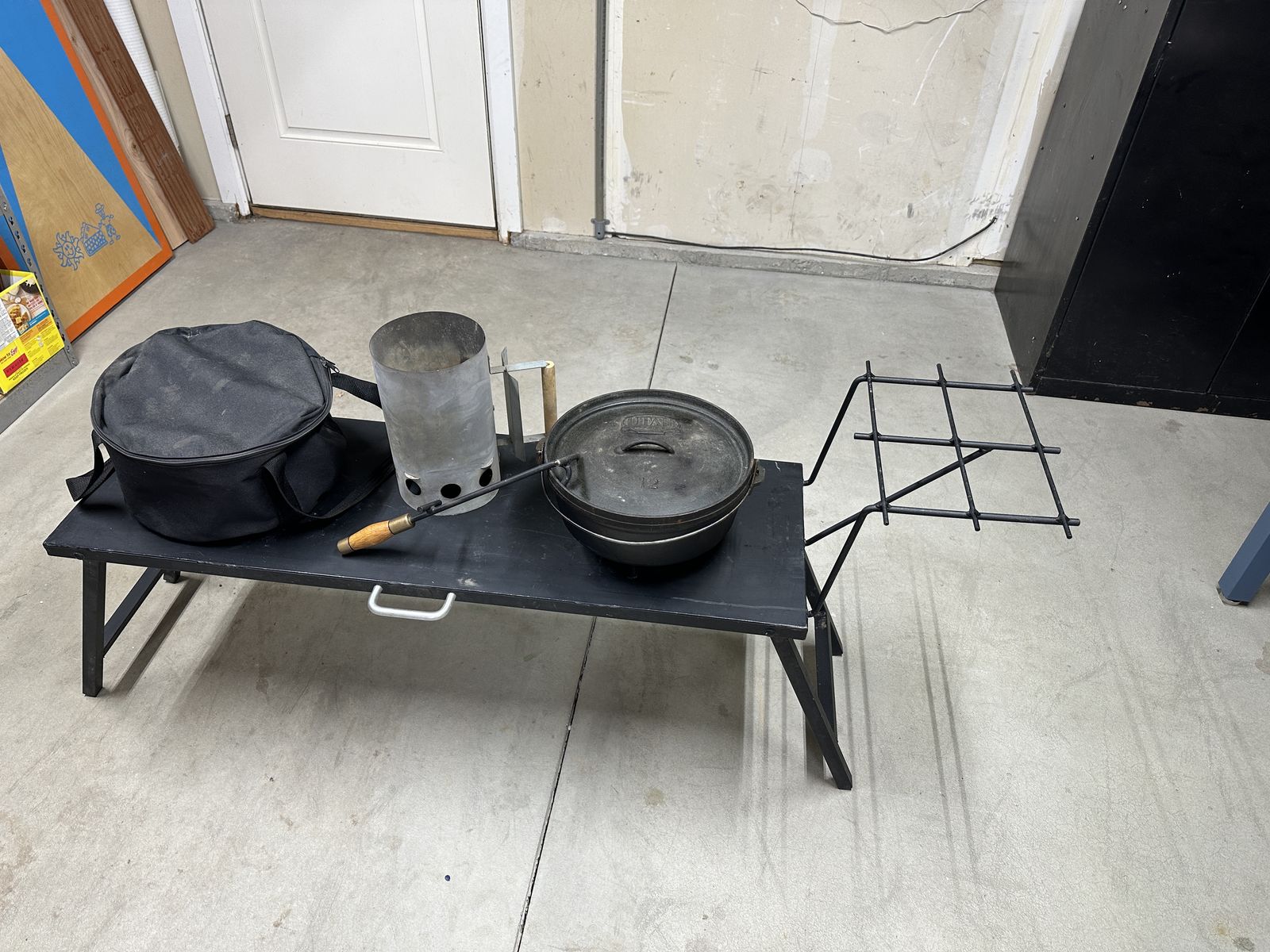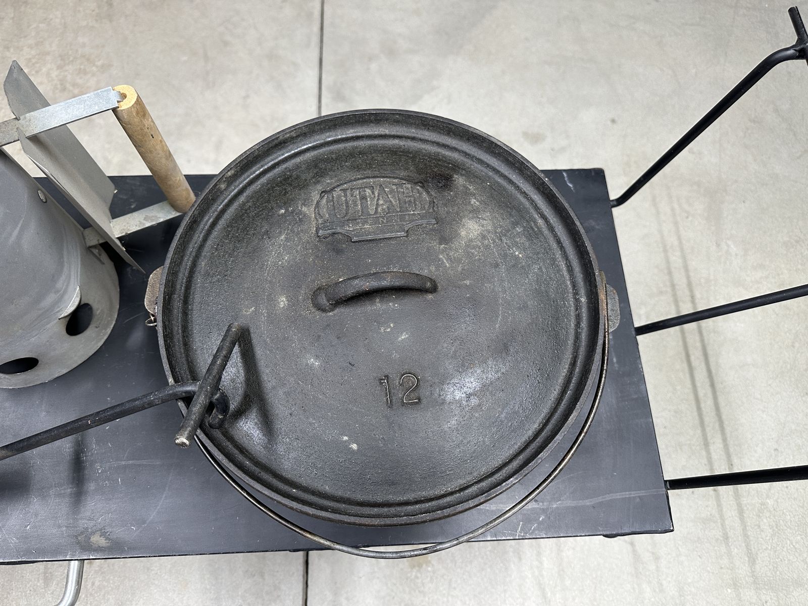 Venmo12” Utah Centennial Dutch oven with cover. Custom built 3-oven steel table with removable rack and collapsible legs (very sturdy). Custom walnut and brass lid lifter. And a charcoal lighting chimney. This is a great setup. Everything in great condition. Very rarely used. Asking $175.
