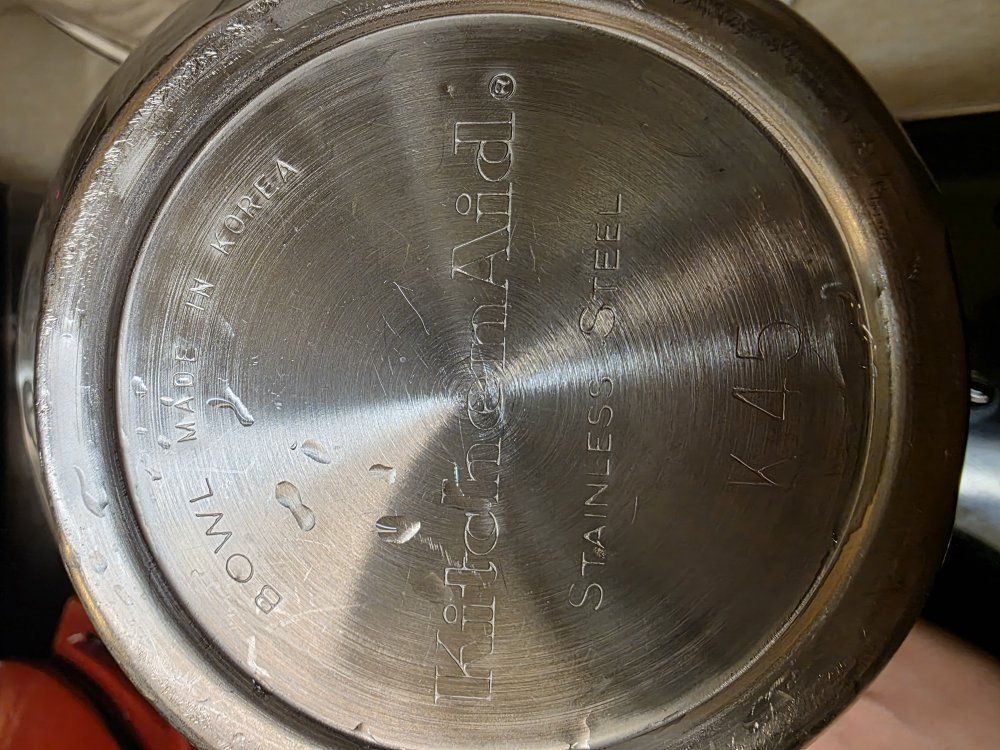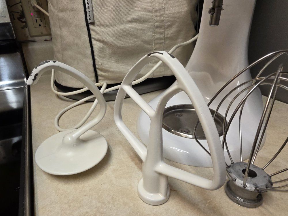 Includes: White kitchenaid mixer Wire whisk Dough hook(chipped, see photos) Paddle attachment(chipped, see photos) 4.5qt bowl(can also fit 5qt bowl)