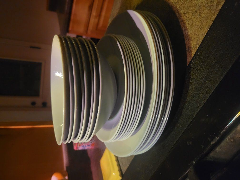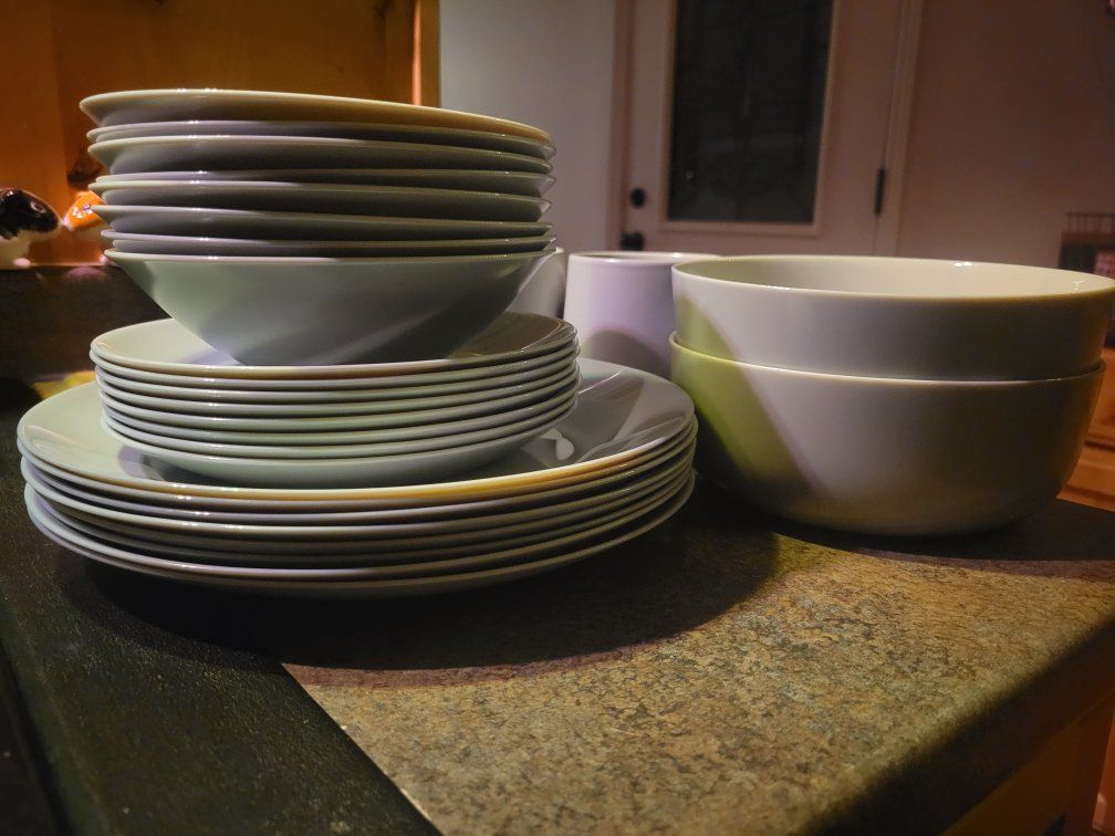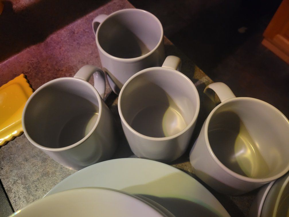 CashAppLight grey dish set, contains 8 large plates, 8 small plates, 2 large bowls, 8 small bowls, and 4 mugs.